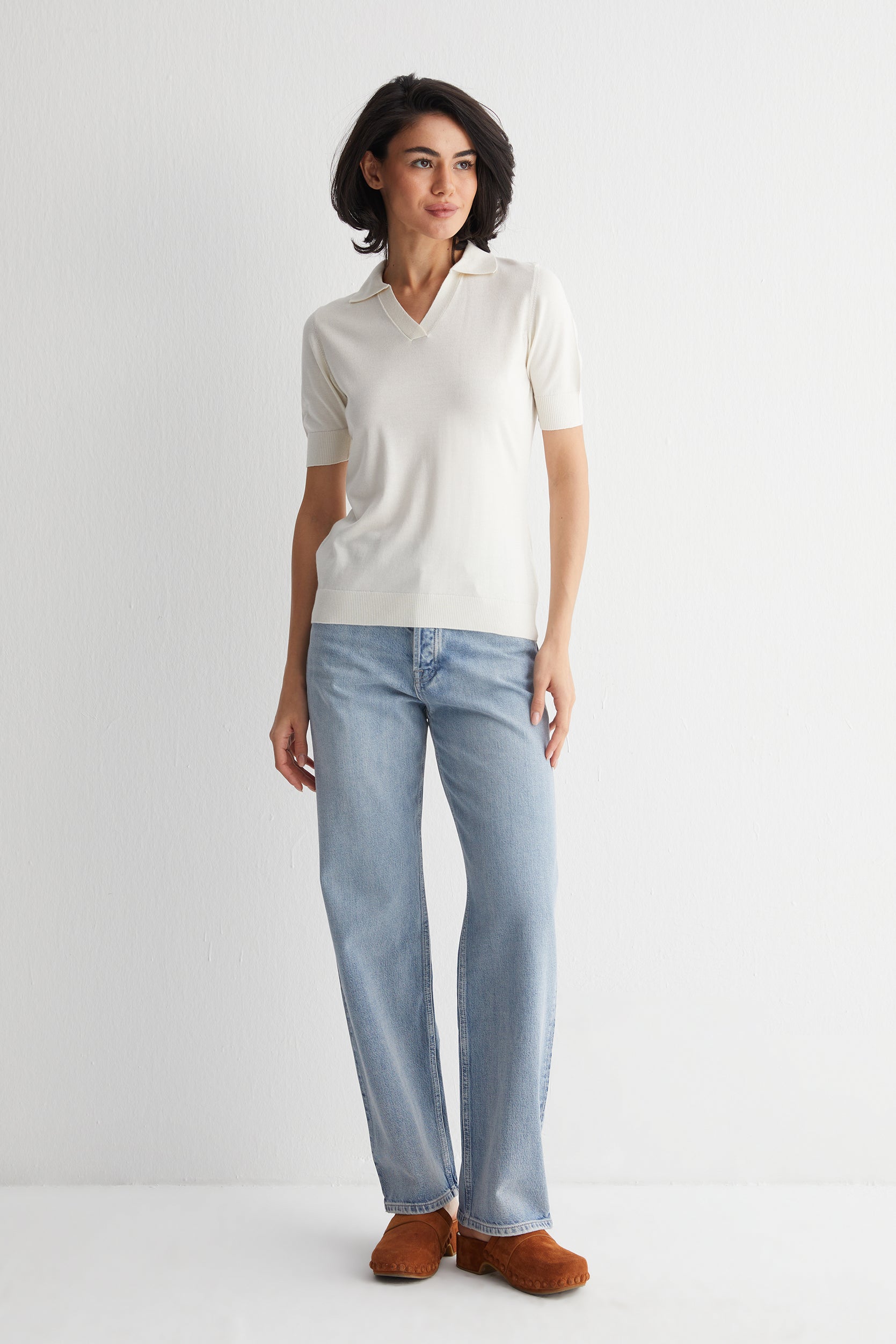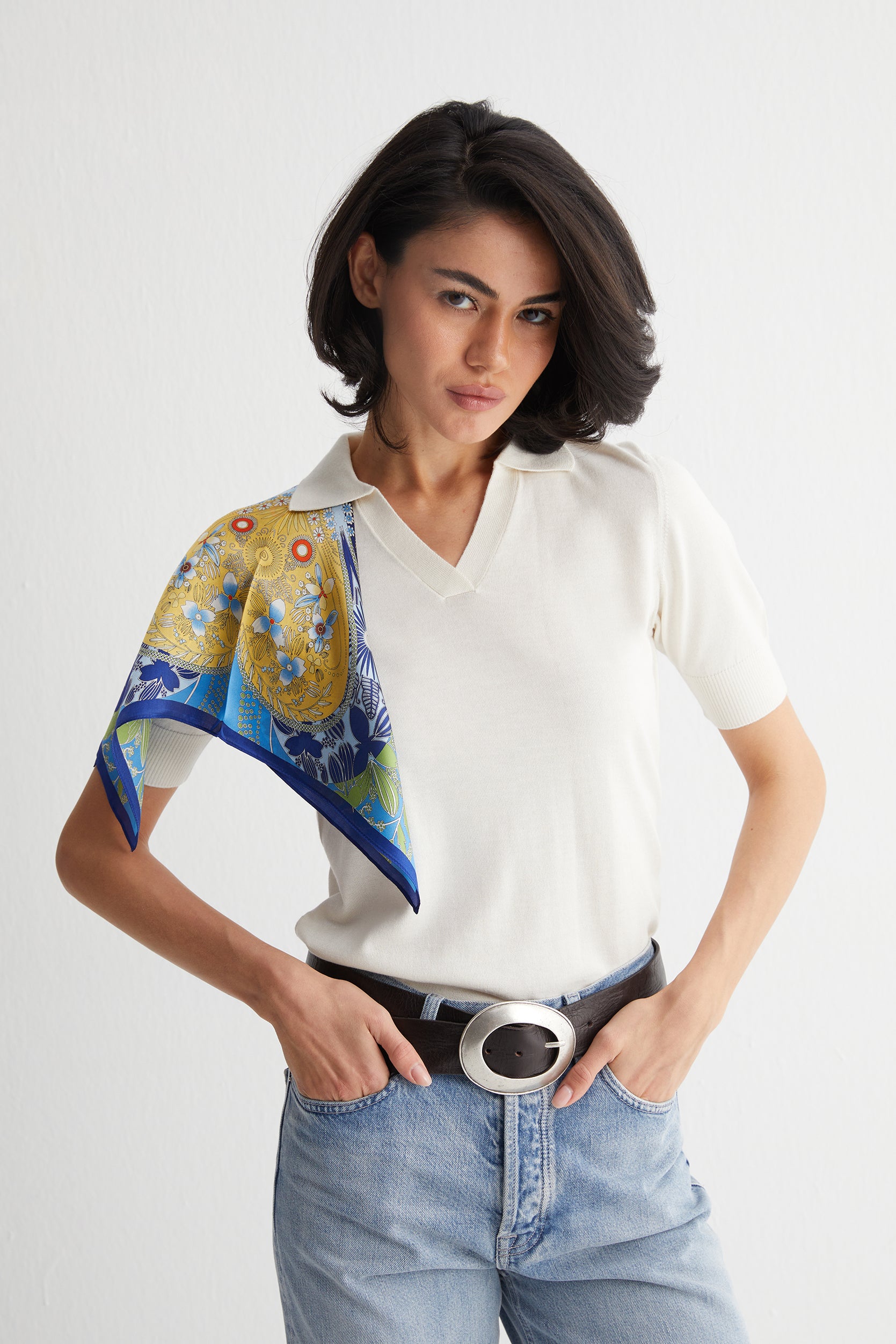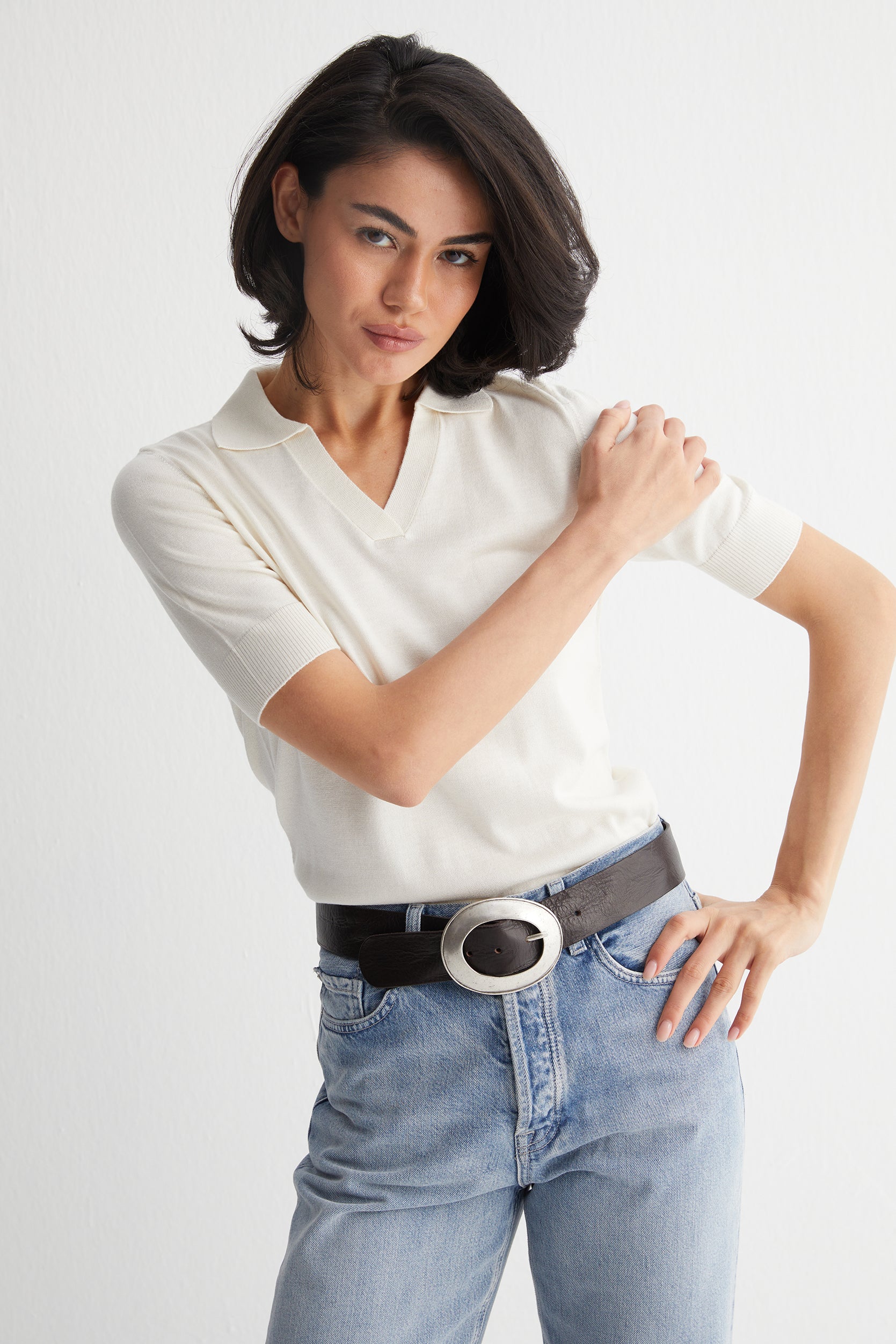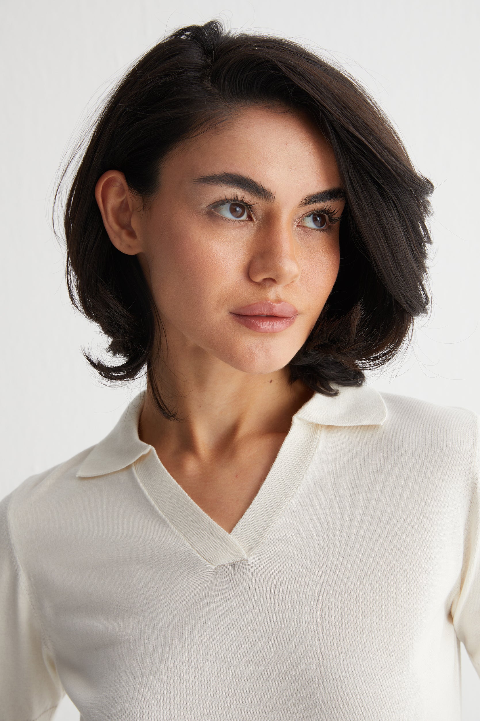İpek ve kaşmirin kusursuz birleşimiyle hazırlanan bu kısa kollu polo, yumuşak dokusu ve hafif yapısıyla konforlu bir kullanım sunar. Nefes alabilen ince dokusu sayesinde her mevsim kullanıma uygundur. Polo yaka detaylarıyla zamansız bir stil sunarken, ekru rengiyle de zarif ve modern bir görünüm sağlar.