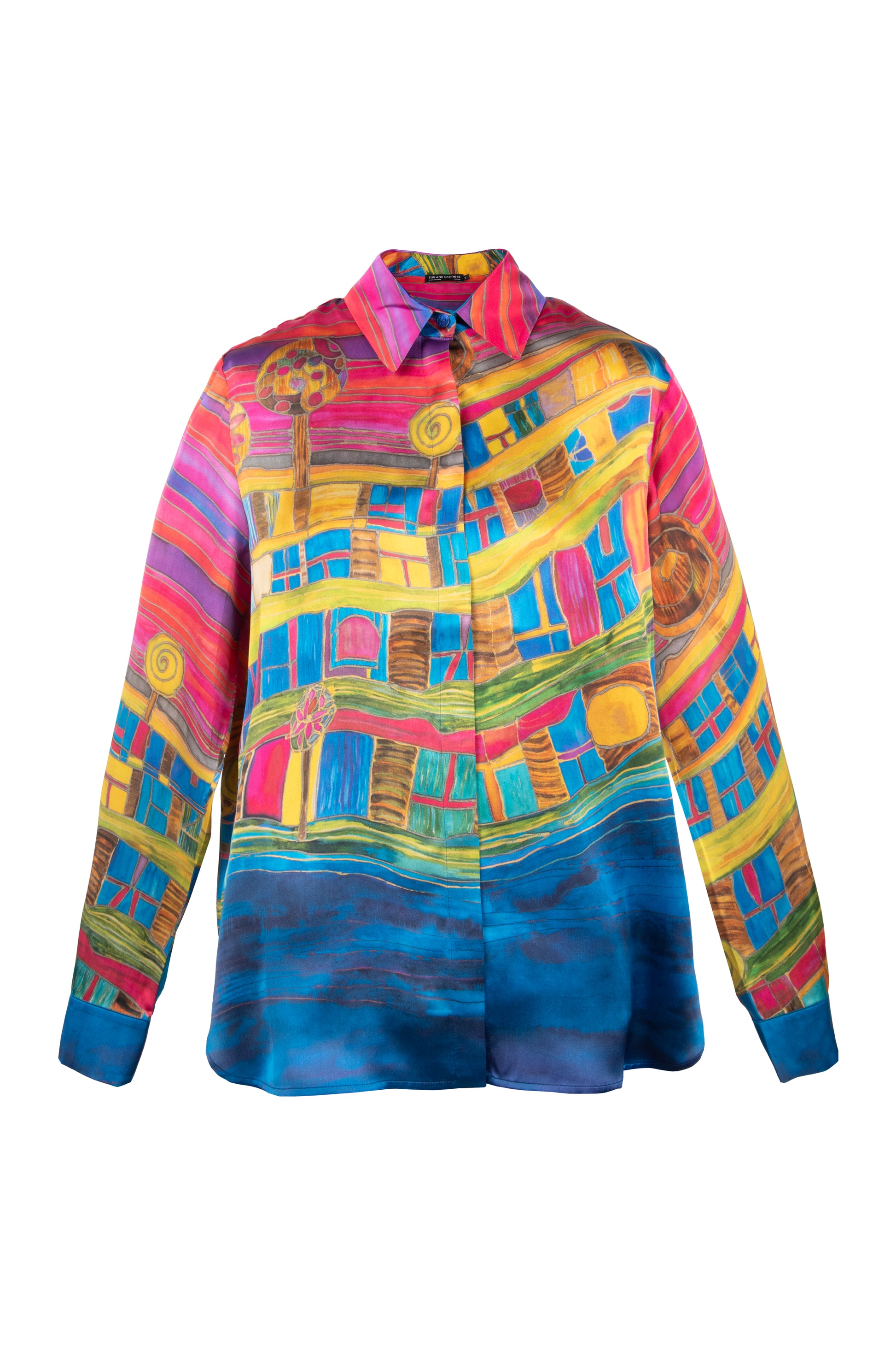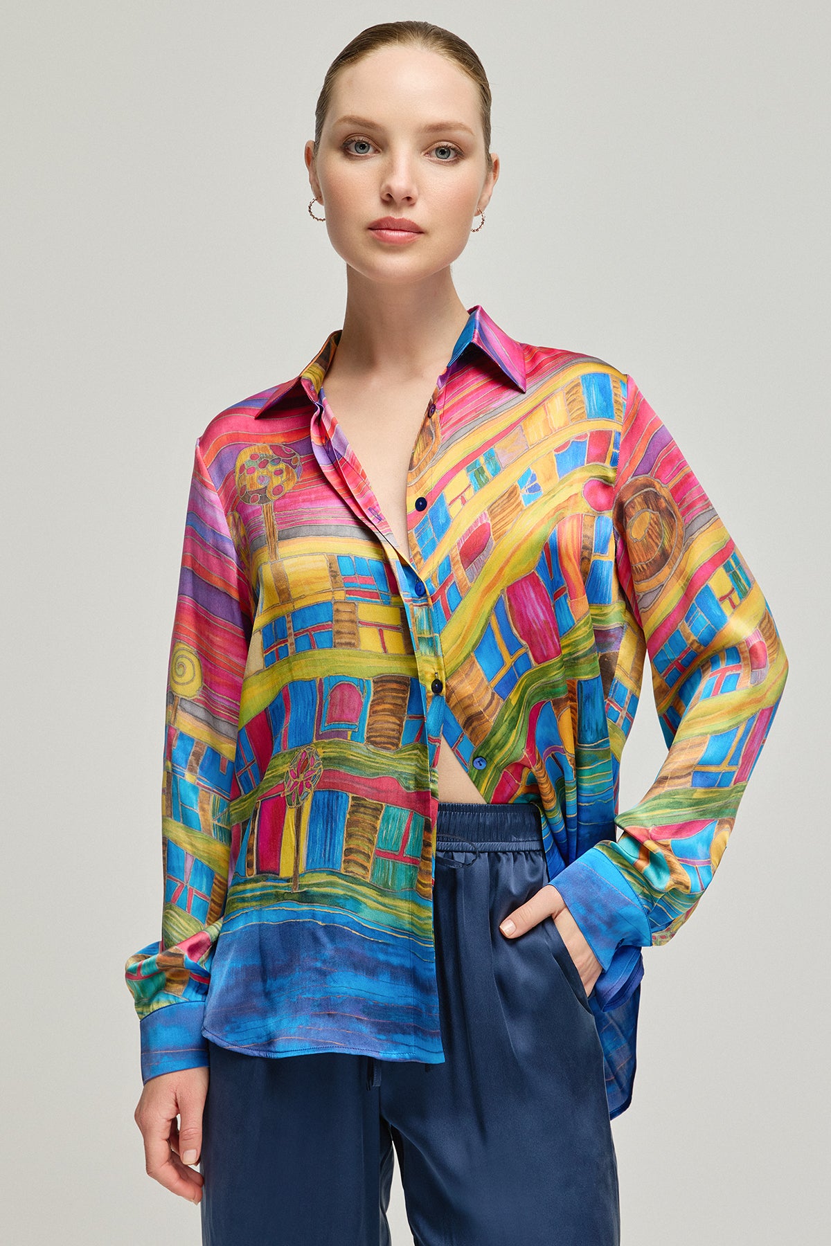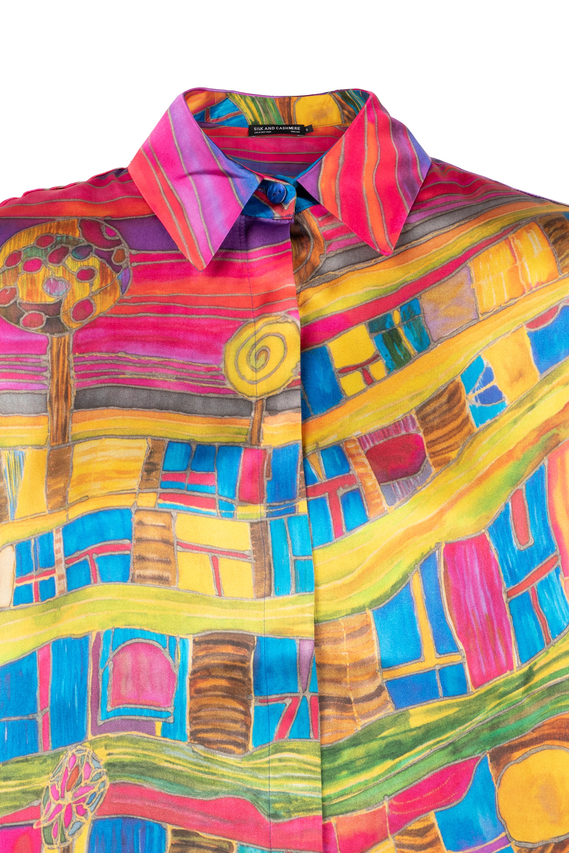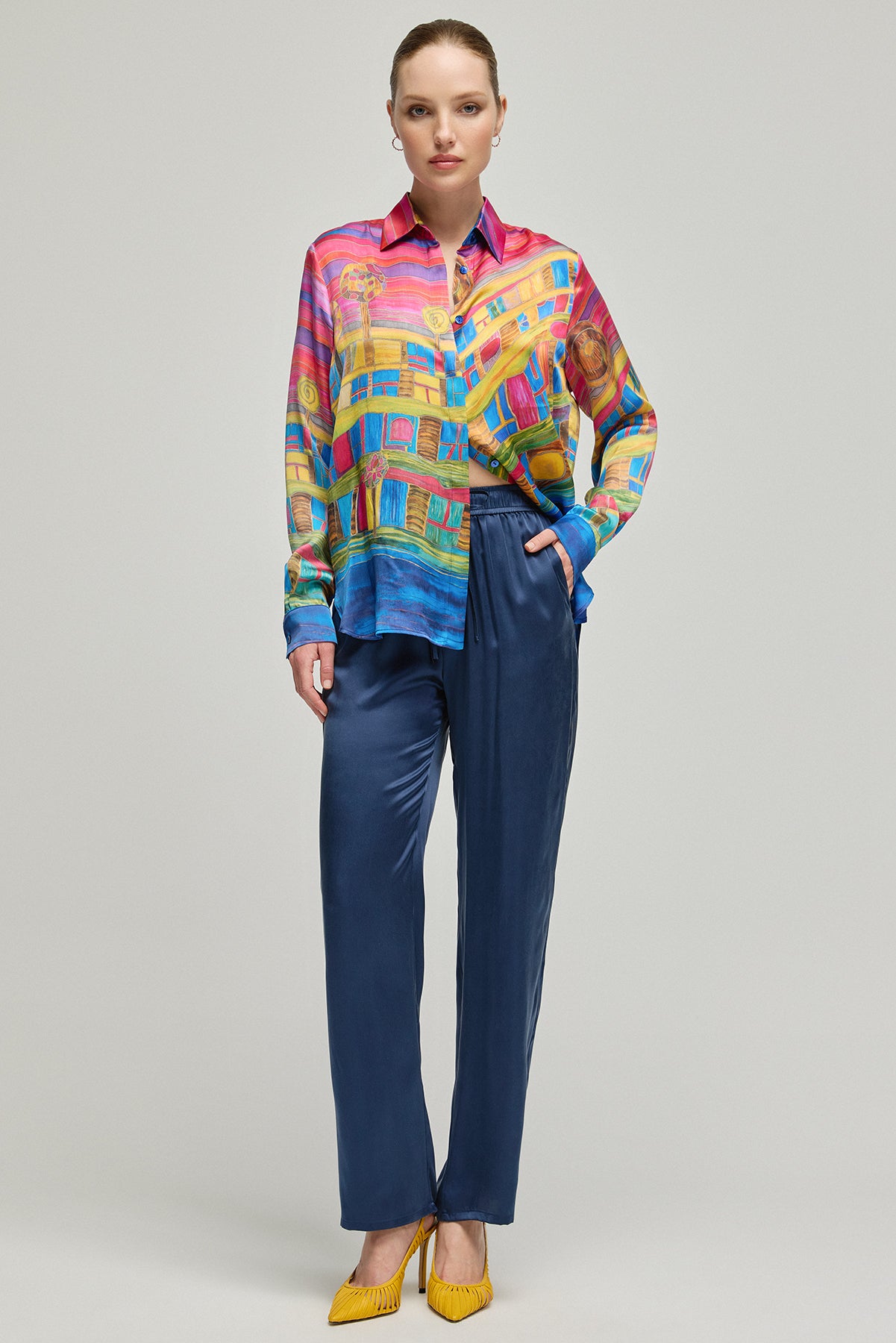 Sanat eserini andıran bu gömlek, cesur renkleri ve canlı desenleriyle gardırobunuza enerji katıyor. %100 ipek kumaşı, cildinizde pürüzsüz bir his bırakırken, göz alıcı deseniyle tüm dikkatleri üzerinize çekmenizi sağlıyor. Her bir detayda özenle düşünülmüş bu parça, benzersiz stili ve konforu bir arada sunuyor.