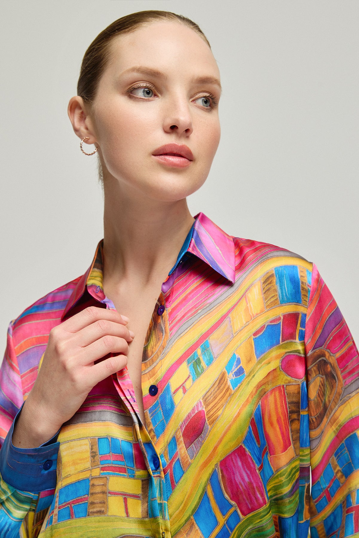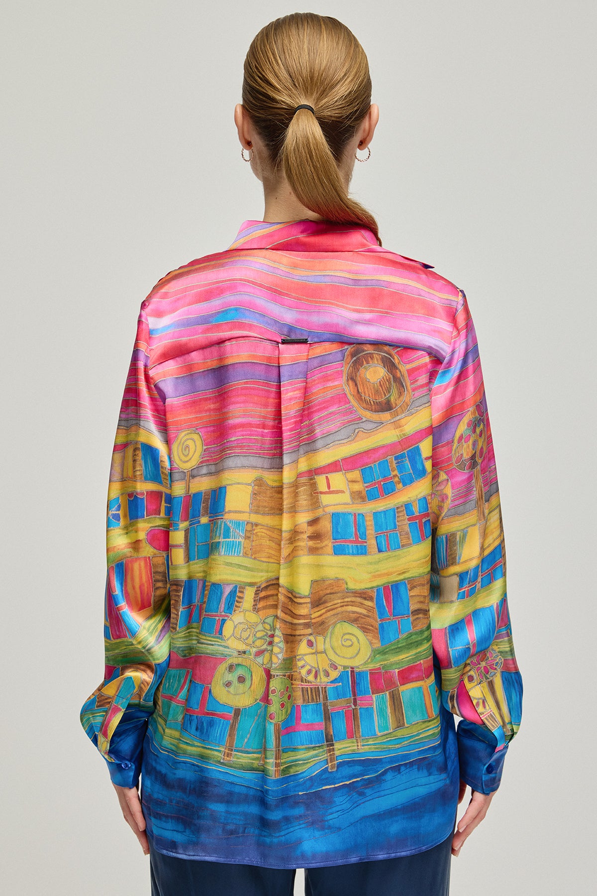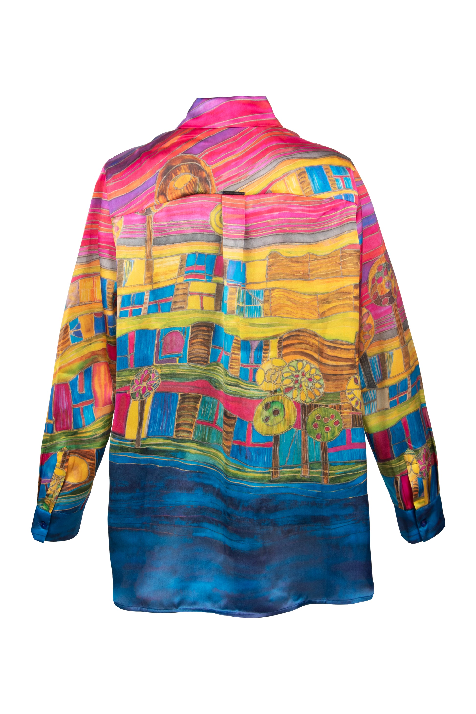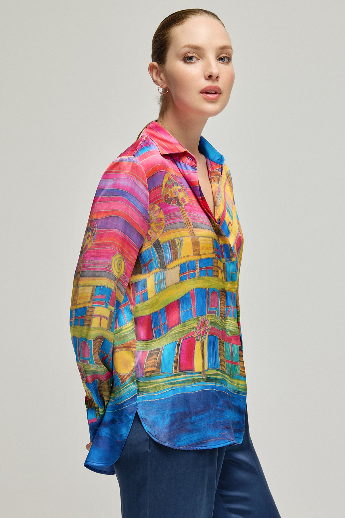 Sanat eserini andıran bu gömlek, cesur renkleri ve canlı desenleriyle gardırobunuza enerji katıyor. %100 ipek kumaşı, cildinizde pürüzsüz bir his bırakırken, göz alıcı deseniyle tüm dikkatleri üzerinize çekmenizi sağlıyor. Her bir detayda özenle düşünülmüş bu parça, benzersiz stili ve konforu bir arada sunuyor.