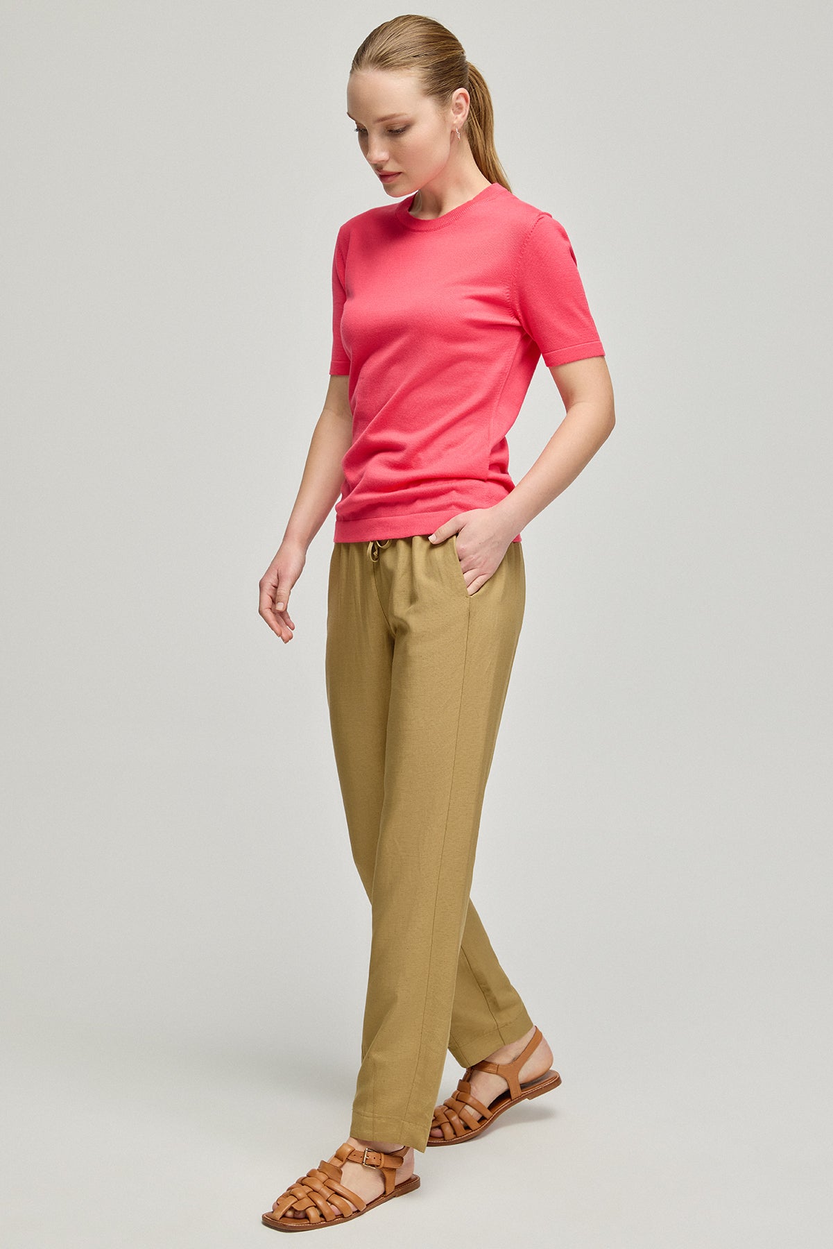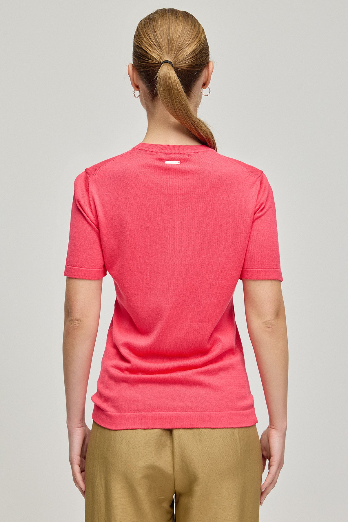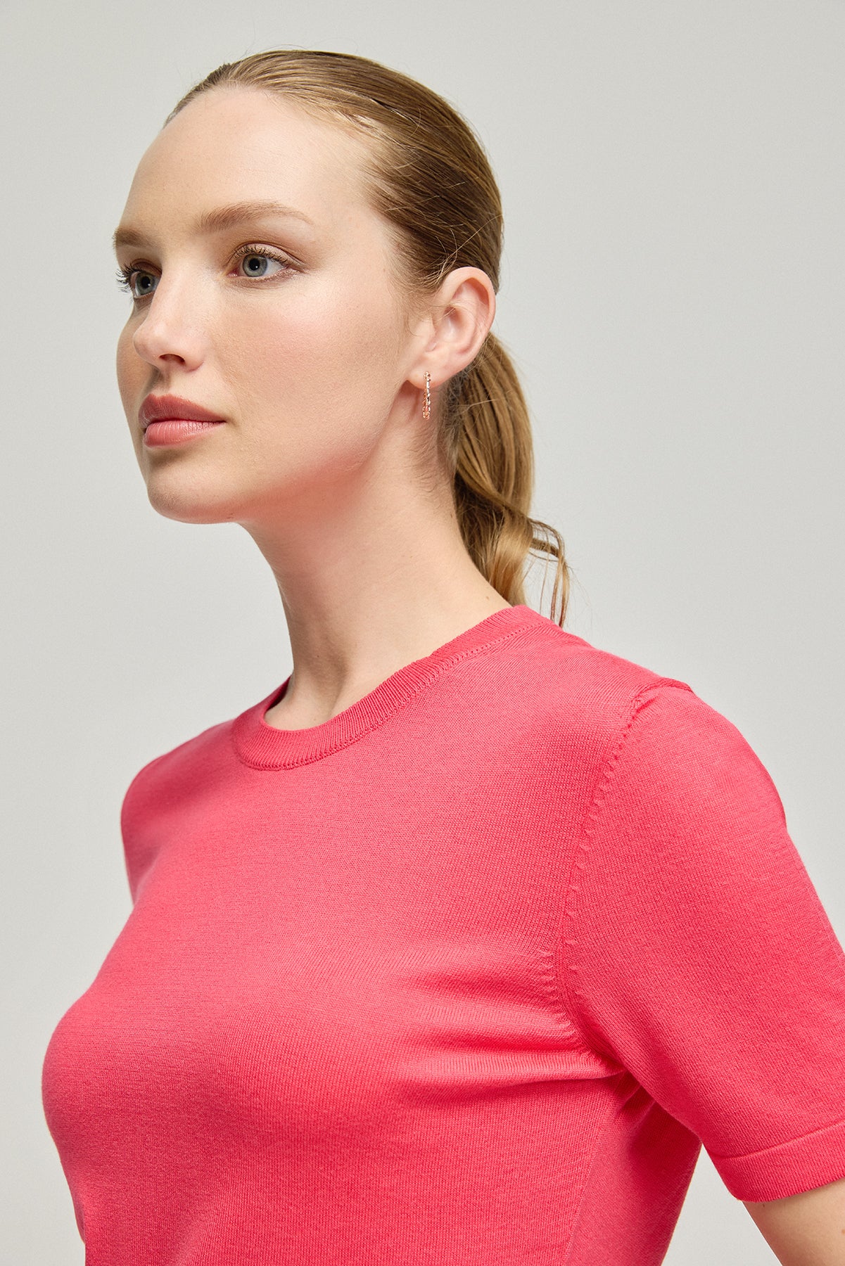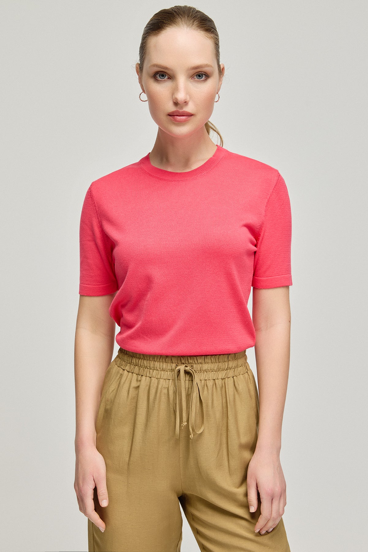 Fuşya Pamuk Modal Juno Yuvarlak Yaka Kısa Kollu Triko