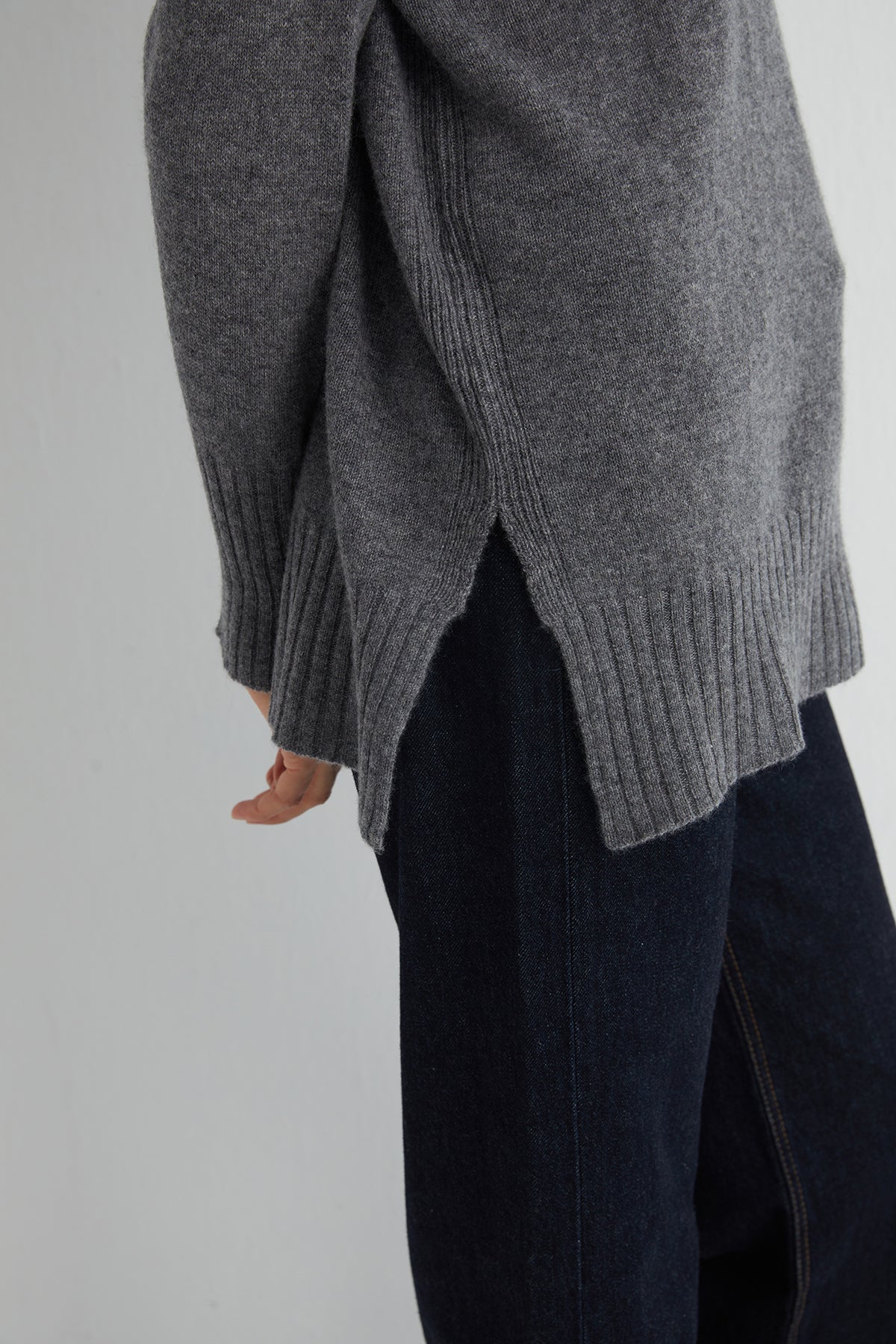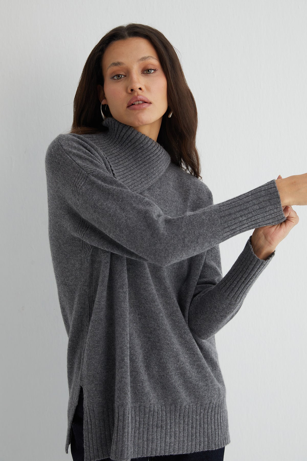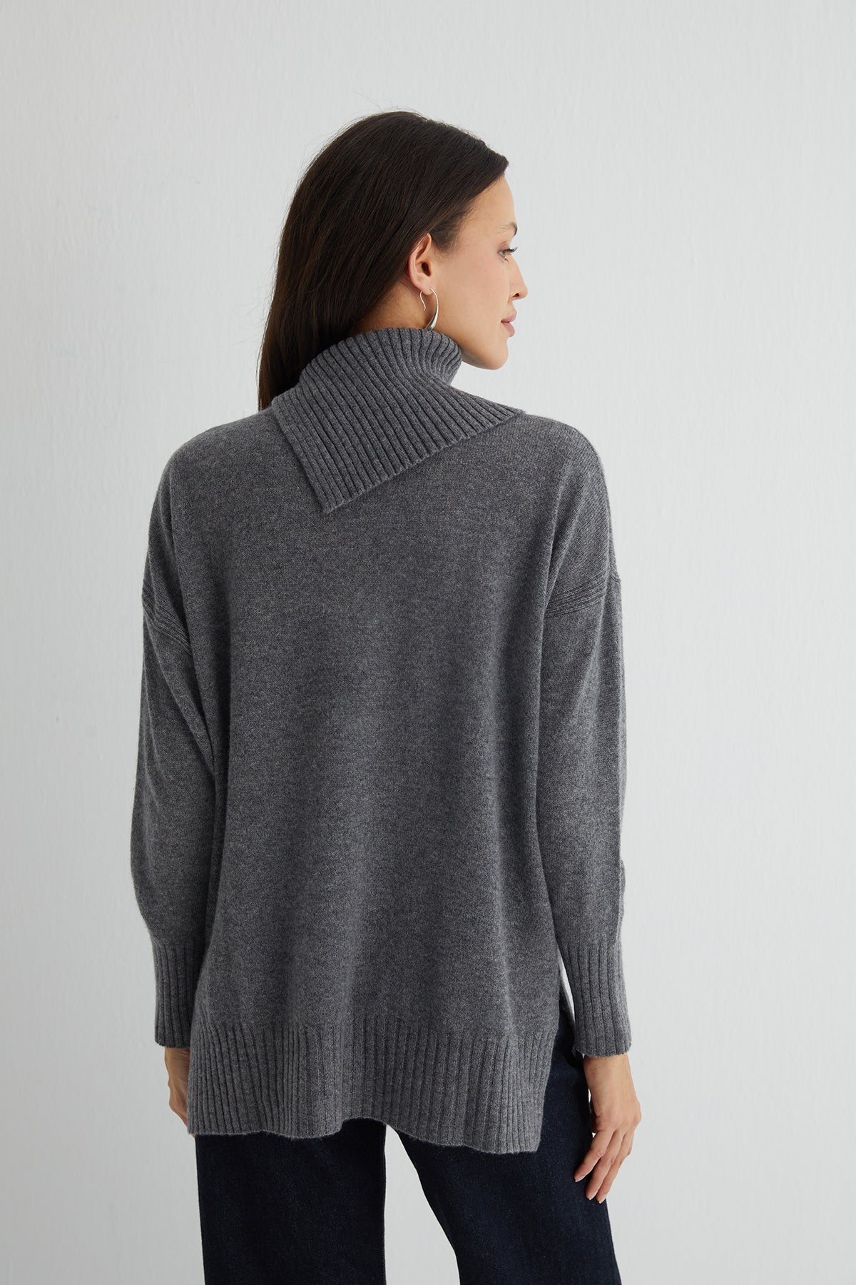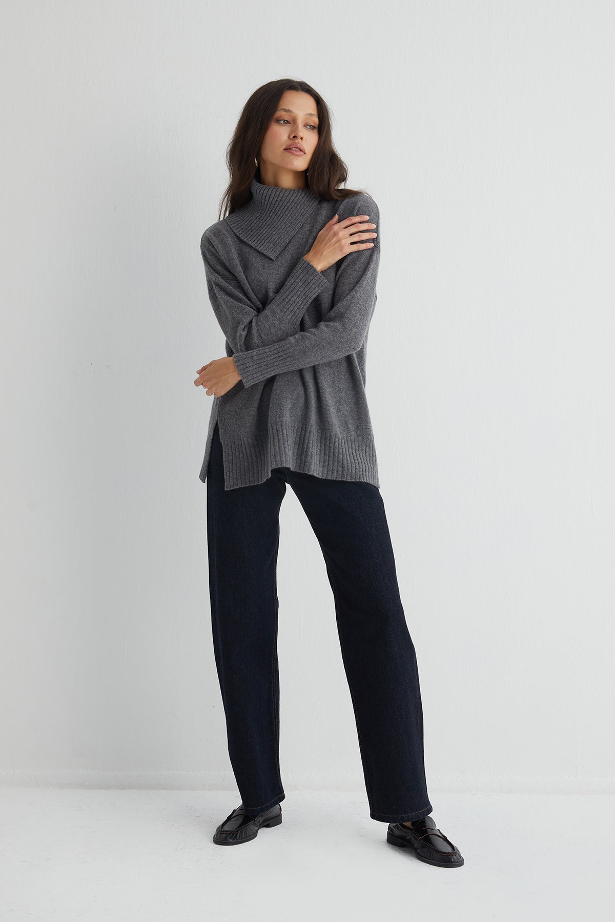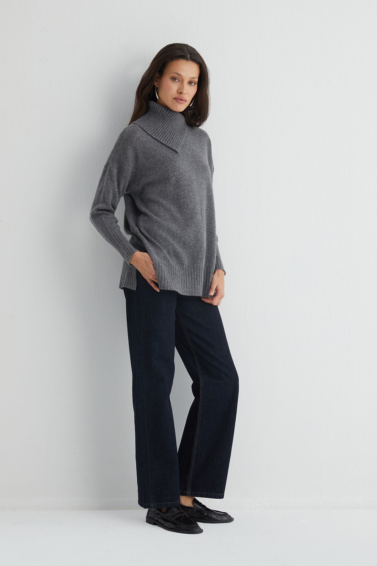 Isabella balıkçı yaka kazak, saf kaşmirin yumuşak dokusunu rahat bir kesimle bir araya getirir. Asimetrik yaka detayıyla sade bir fark yaratır. Gri tonu ve doğal yapısıyla zamana karşı değerini korur.
