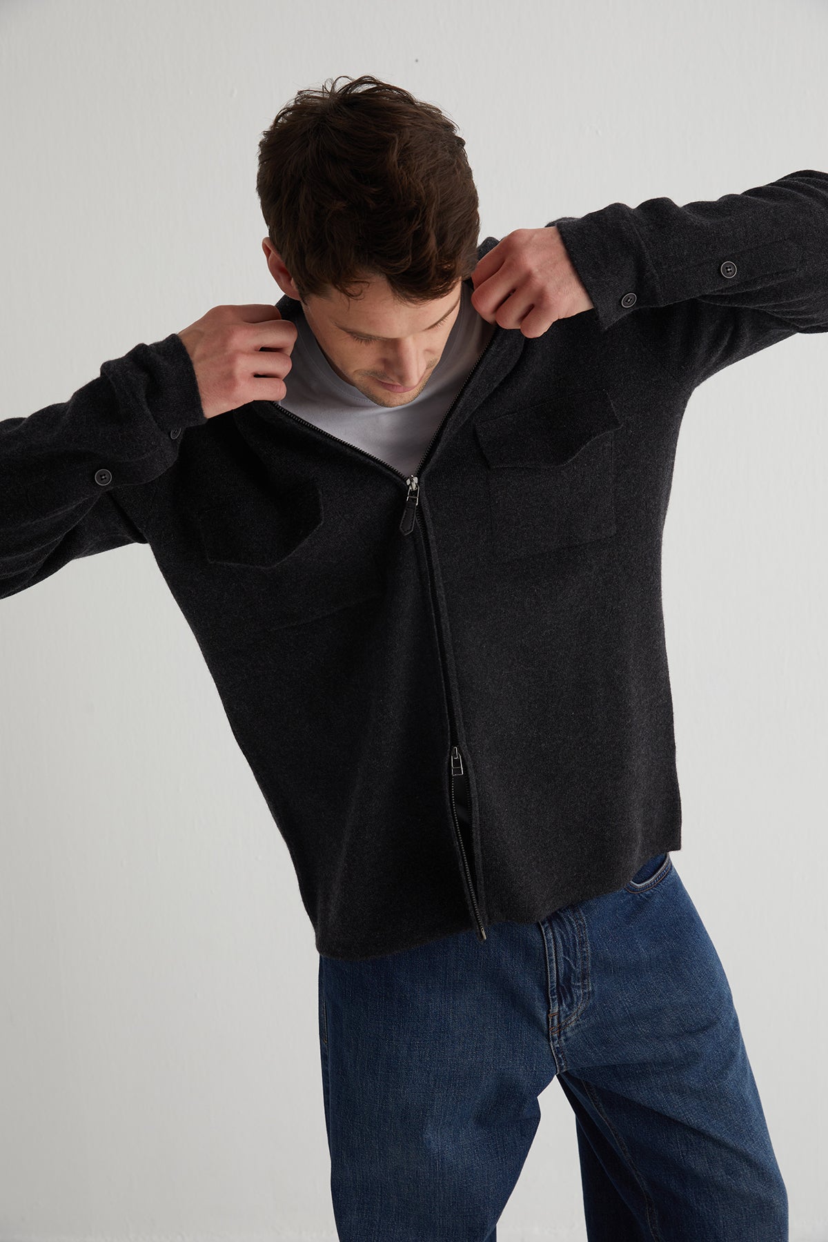 Fonksiyonel detaylarla yeniden tanımlanan bu gri kaşmir ceket, günlük stilinize doğallık ve karakter katar. Çelik örgü tekniğiyle hem formunu korur hem de modern duruşundan ödün vermez. Gömlek yaka kesimi ve çift cepli tasarımıyla konforun zamansız stille buluştuğu bir parçadır.