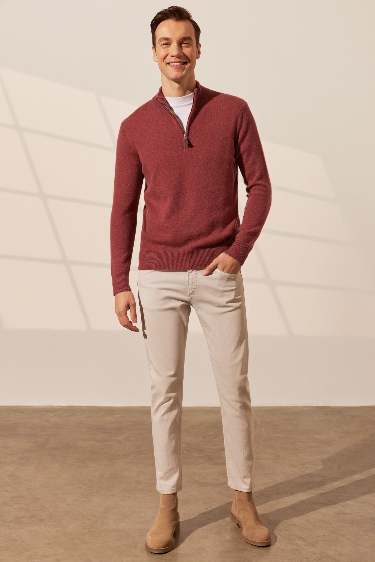 Gül Kurusu Saf Kaşmir Fermuarlı Yarım Balıkçı Yaka Uzun Kollu Erkek Kazak tam size göre! Yumuşak ve lüks bir his için % 100 saf kaşmirden yapılan bu kazağın benzersiz yarım balıkçı yaka çizgisi, her görünüme şık bir dokunuş katar.