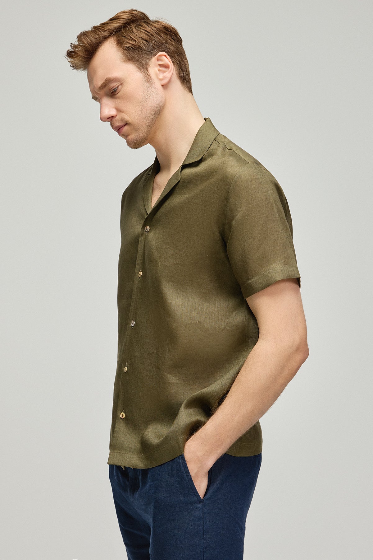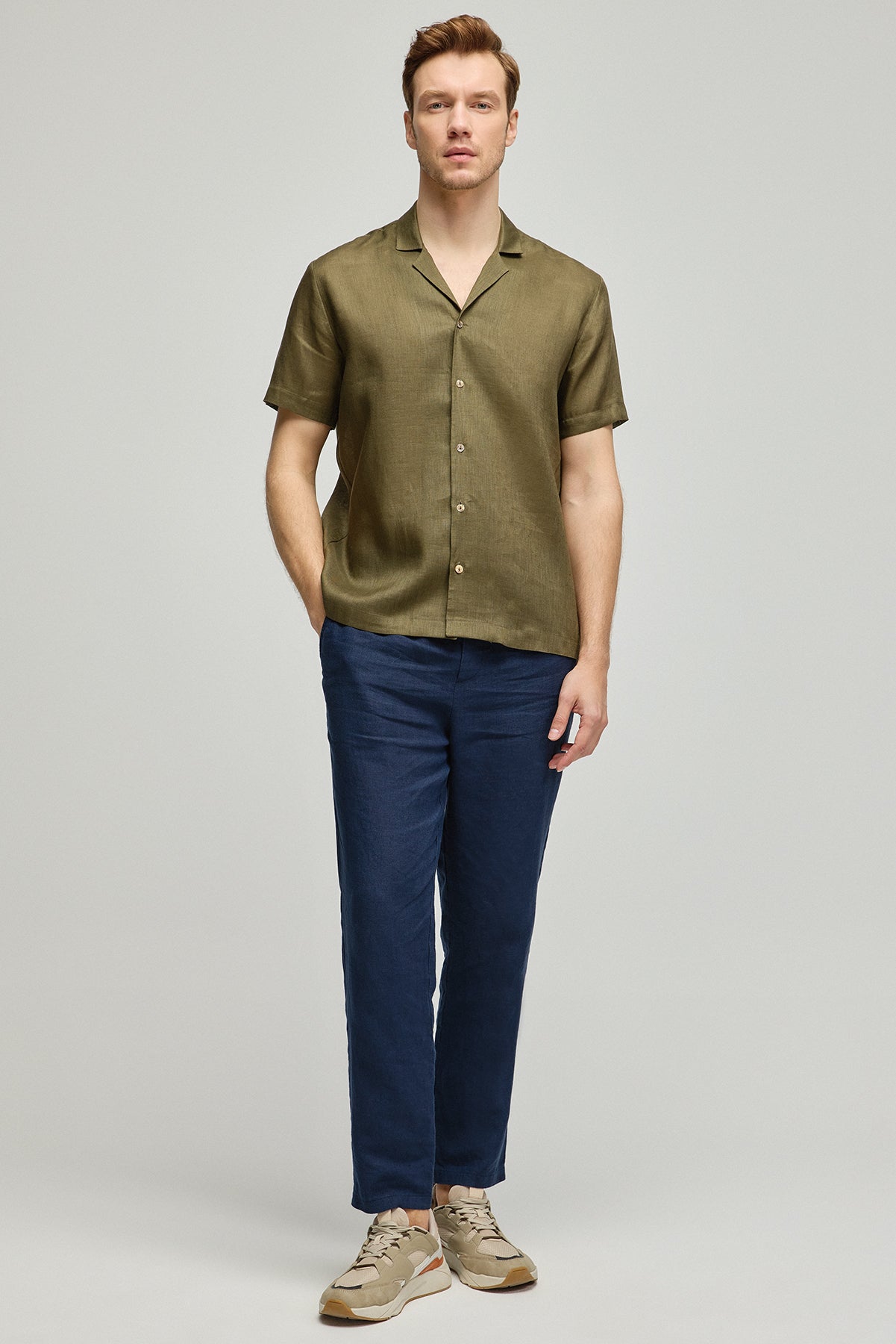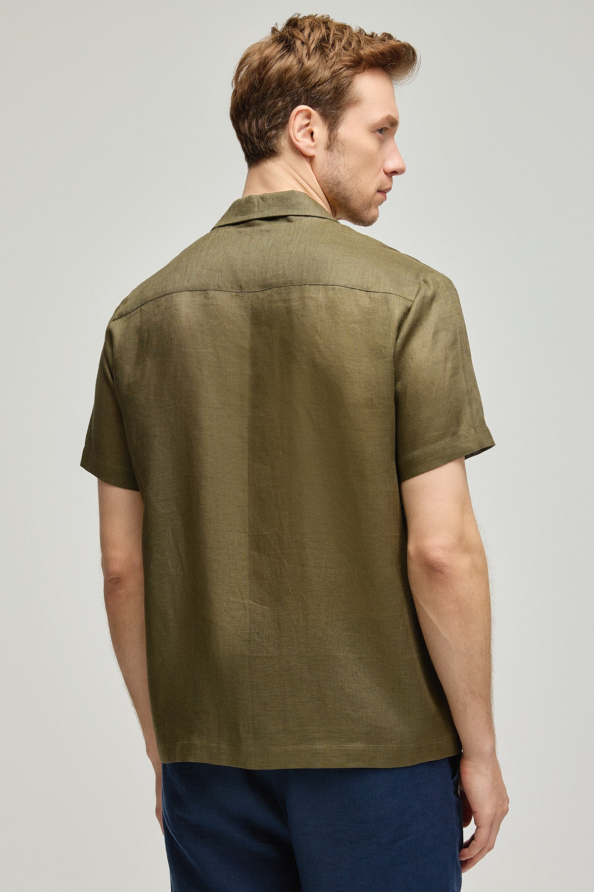 Yaz sıcaklarında serin tutan, haki rengindeki bu %100 keten kısa kollu gömlek, erkeksi şıklığın ve rahatlığın simgesi. Zamansız bir tasarım olan yaka detayı ve düğmeli ön kapatma ile klasiği modern bir tarzla buluşturuyor. Ketenin doğal dokusu, bu parçaya hem hafiflik hem de dayanıklılık katıyor, gün boyu konfor sağlıyor.