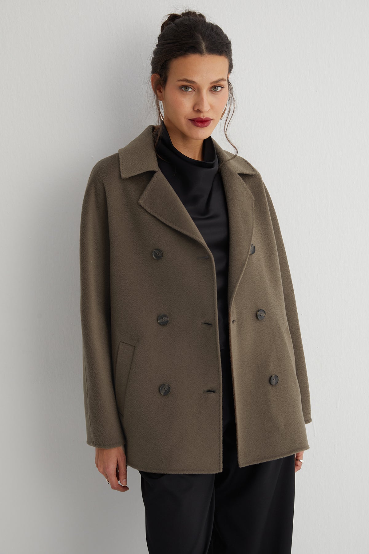 - Klasik kruvaze kesimiyle zamansız bir siluet yaratır.