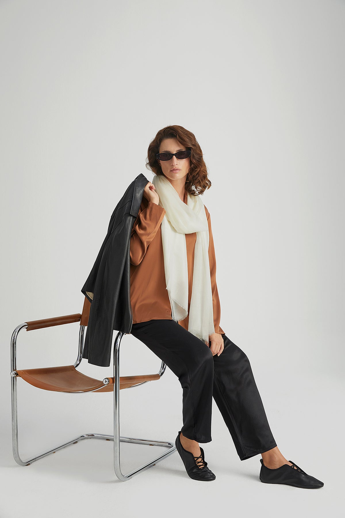 Hikayesi: En yeni saf ipek gömlek serimizle tanışın. Pijama stili yakası ve taş yıkama ipeğin yalın ışıltılı dokusuyla öne çıkan ASTRID serisi gardırobunuza vintage bir hava katacak. Gökyüzü mavisi, bakır kahve ve ışıltılı gümüş olmak üzere üç renkte mevcut olan bu bol kesim model, aynı zamanda sanat eseri niteliğinde iki özgün desenle de gardırobunuza renk katıyor. Şık bir akşam stili için saf ipek pantolonumuz ve topuklularla kombinleyebilir ya da rahat ama sofistike bir stil için jeanlerle tercih edebilirsiniz.