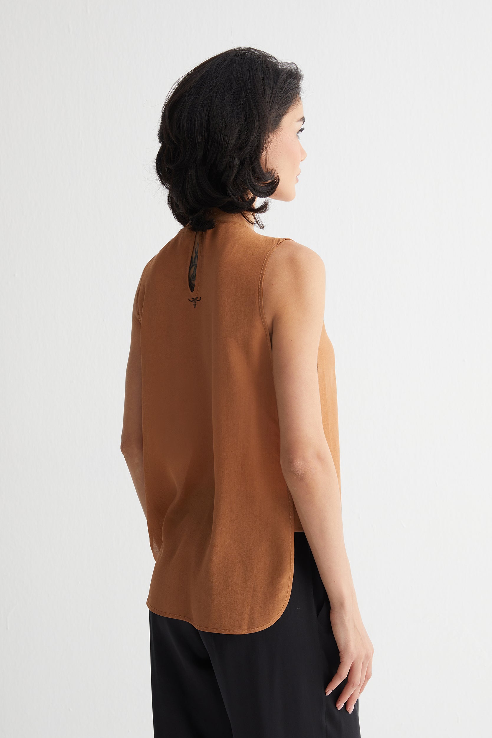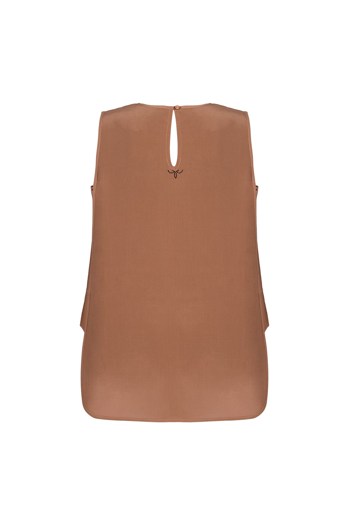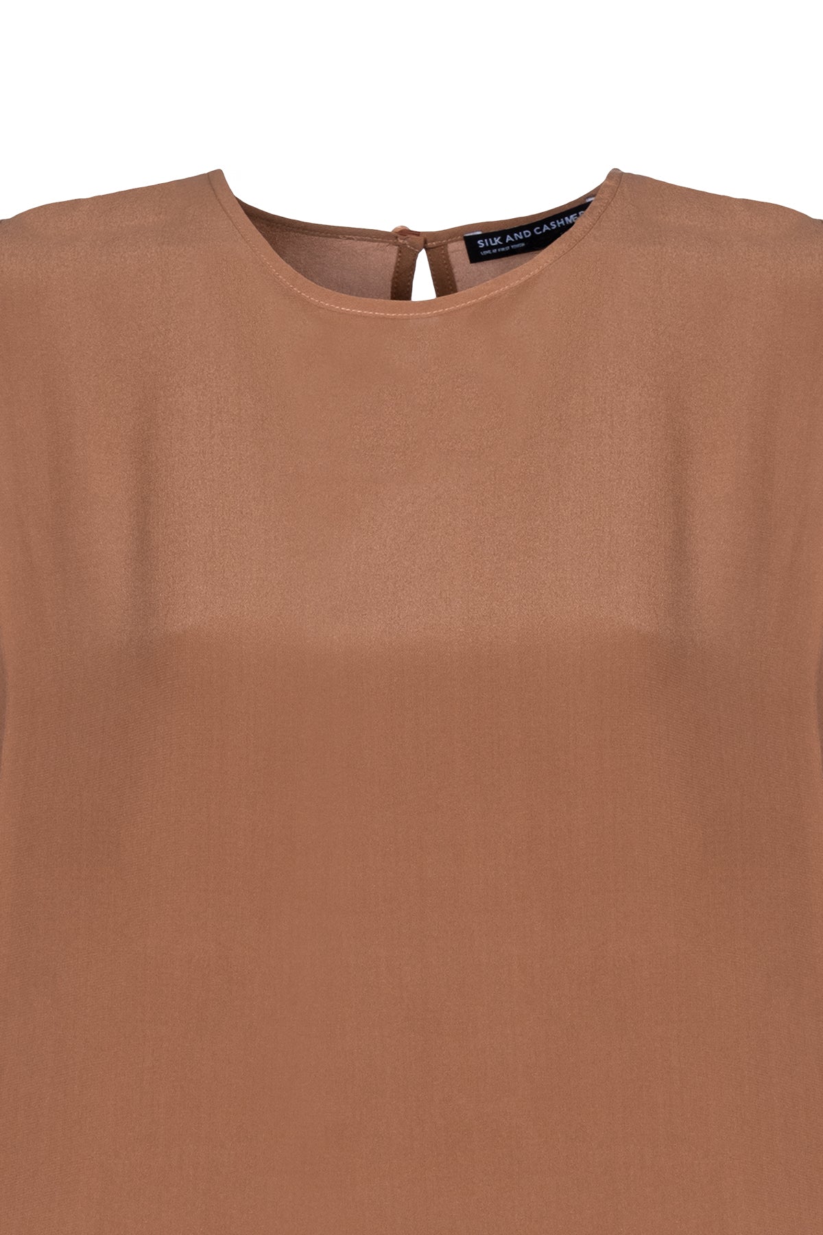 Kahverengi Toscana İpek Yuvarlak Yaka Rahat Kesim Bluz