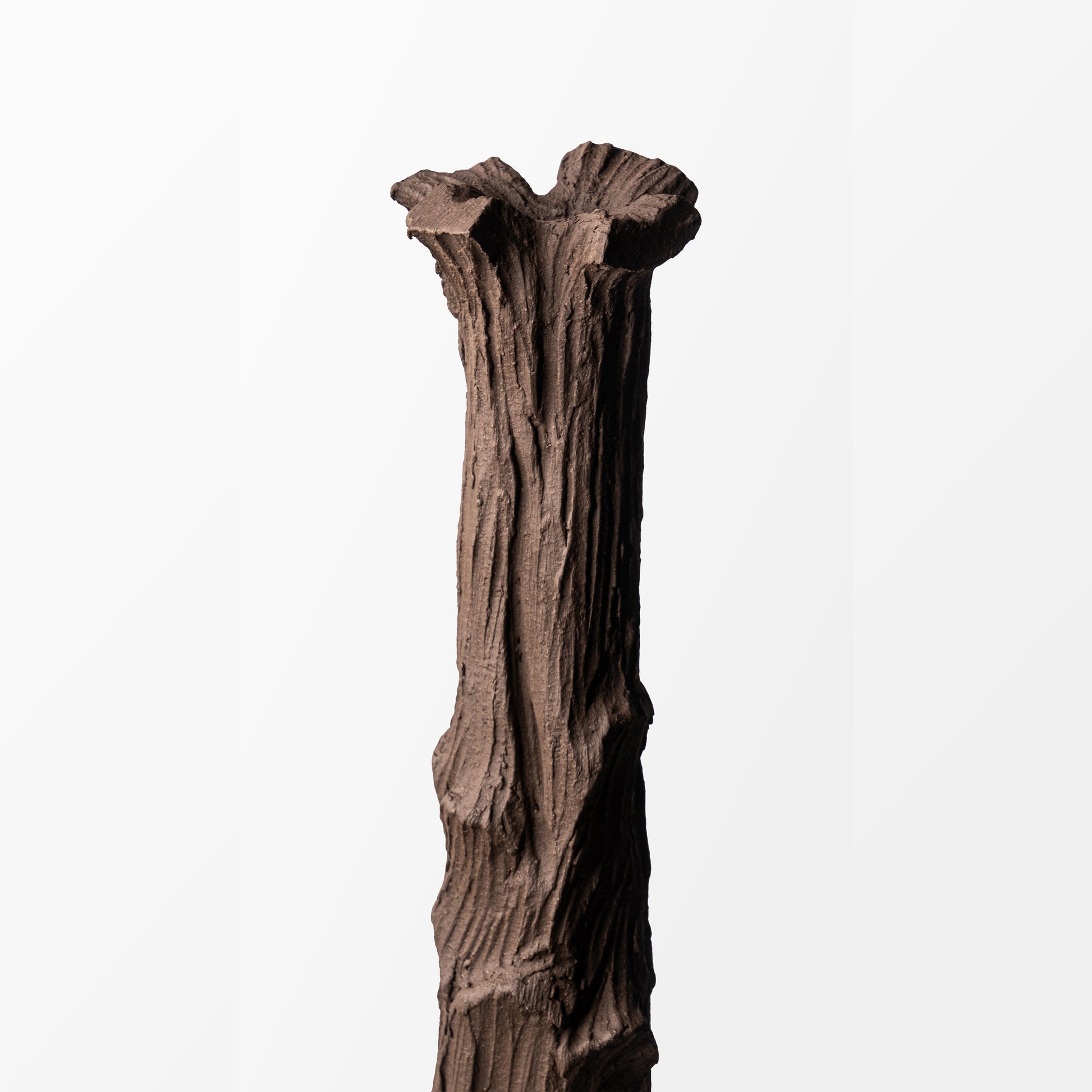 Toprağın derinliklerine kök salmış yüzyıllık zeytin ağaçlarının gövdesinden ilham alan bu seramik obje, doğanın sabırla işlediği dokuyu modern bir forma dönüştürüyor. Her kıvrımı, her iz düşümü, zamanın yavaşça oyduğu bir hikâyeyi fısıldıyor.