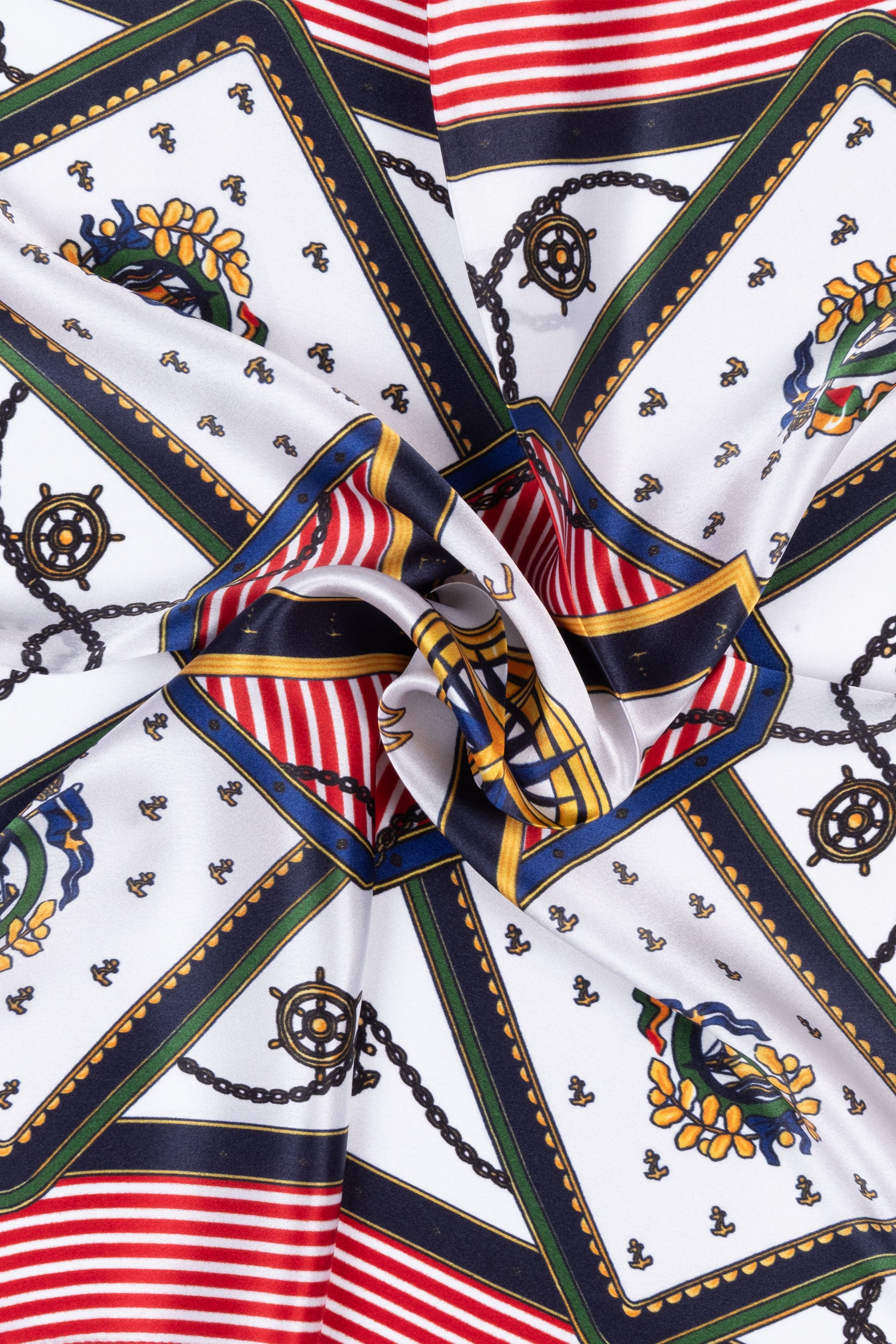 Denizcilik ruhunu yansıtan Laila ipek eşarp, klasik marin çizgileriyle dinamizmi ve zarafeti bir araya getiriyor. Kırmızı ve beyaz çizgiler, lacivert çerçeve ve altın tonlarındaki denizcilik motifleriyle tamamlanarak güçlü ve çarpıcı bir görünüm sunuyor. Saf ipeğin pürüzsüz ve parlak dokusu, gün boyu hafif ve rahat bir kullanım sağlıyor.