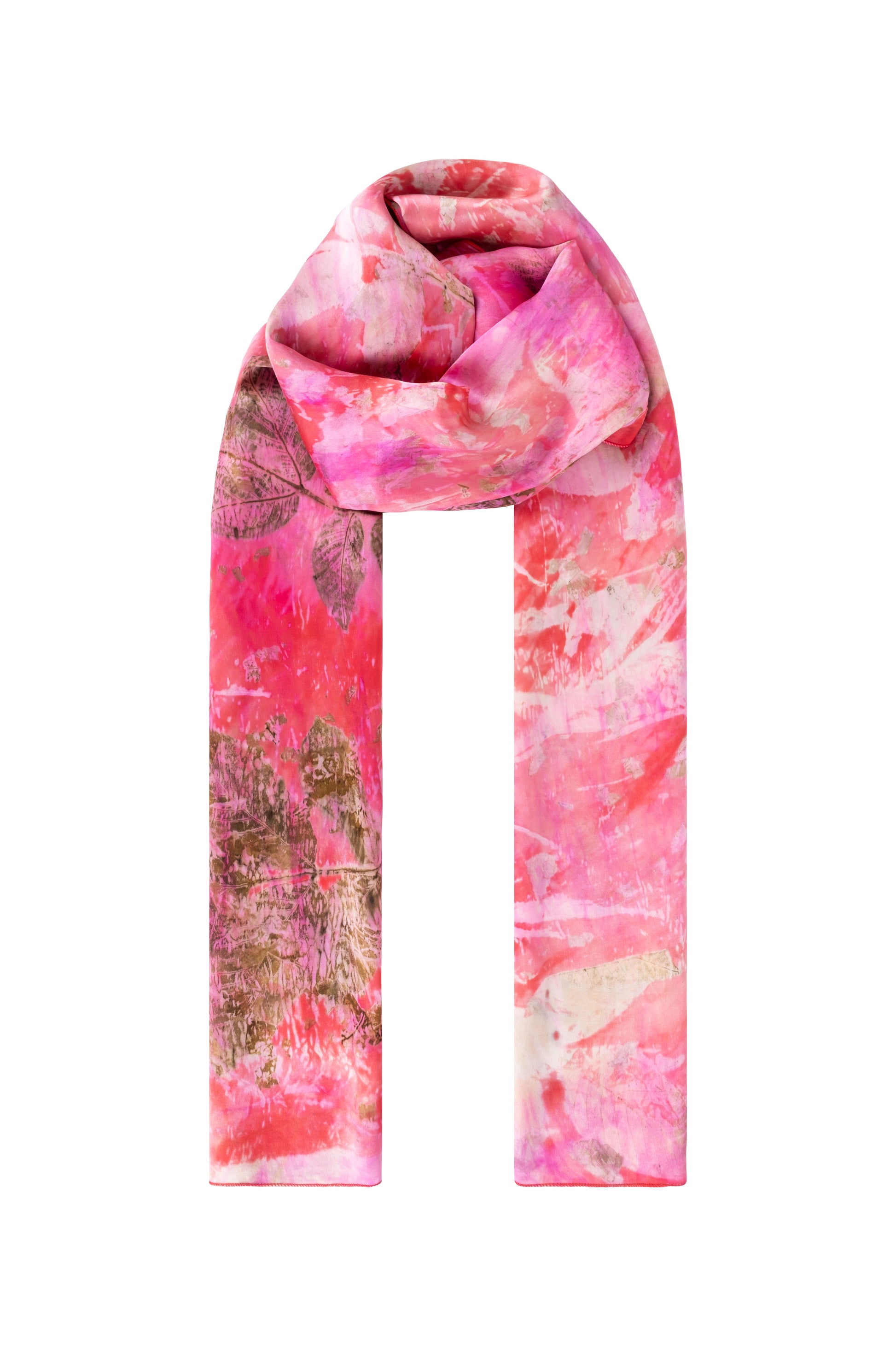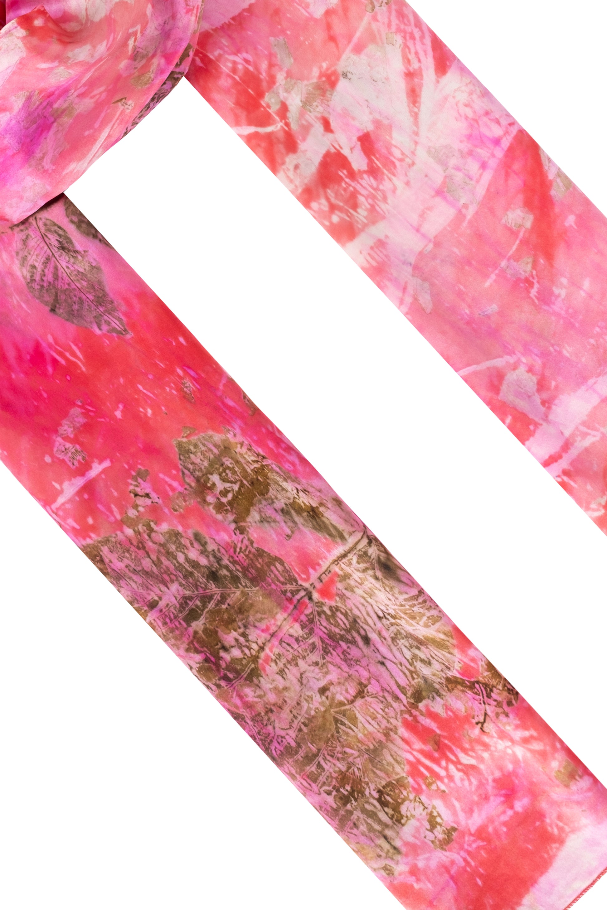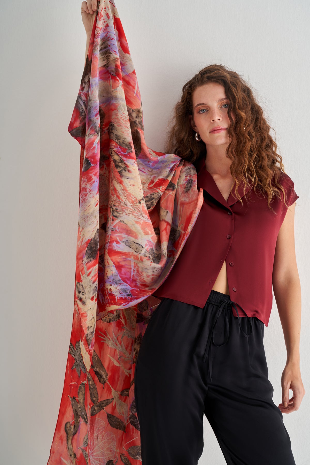 Doğanın renklerinden ilham alan bu şal, kırmızının enerjisini ve ipeğin yumuşak dokusunu bir araya getiriyor. %100 saf ipekten üretilen bu özel tasarım, el baskısı tekniğiyle oluşturulmuş desenleriyle her biri kendine özgü bir görünüme sahiptir. Hafif ve akışkan yapısı sayesinde cildi nazikçe sarar, nefes alabilir özelliği ile her mevsim konforlu bir kullanım sunar.