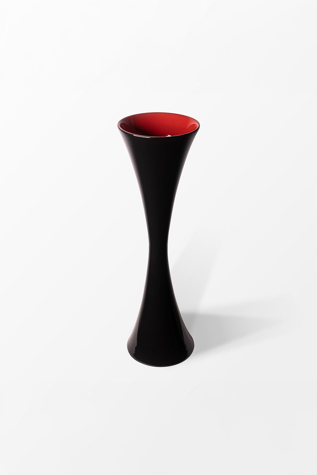 Zamana görsel bir gönderme yapan bu kum saati formundaki vazo, siyahın derinliğiyle kırmızının uyarıcılığını bir araya getiriyor. İncelerek devam eden zarif yapısı, bulunduğu mekâna yukarıdan aşağıya akan bir ritim kazandırıyor. Renk ve form arasındaki dengesiyle dikkat çeken bu özel parça, estetik farkındalığı yüksek yaşam alanları için düşünülmüş, heykelsi bir ifadeye sahiptir.