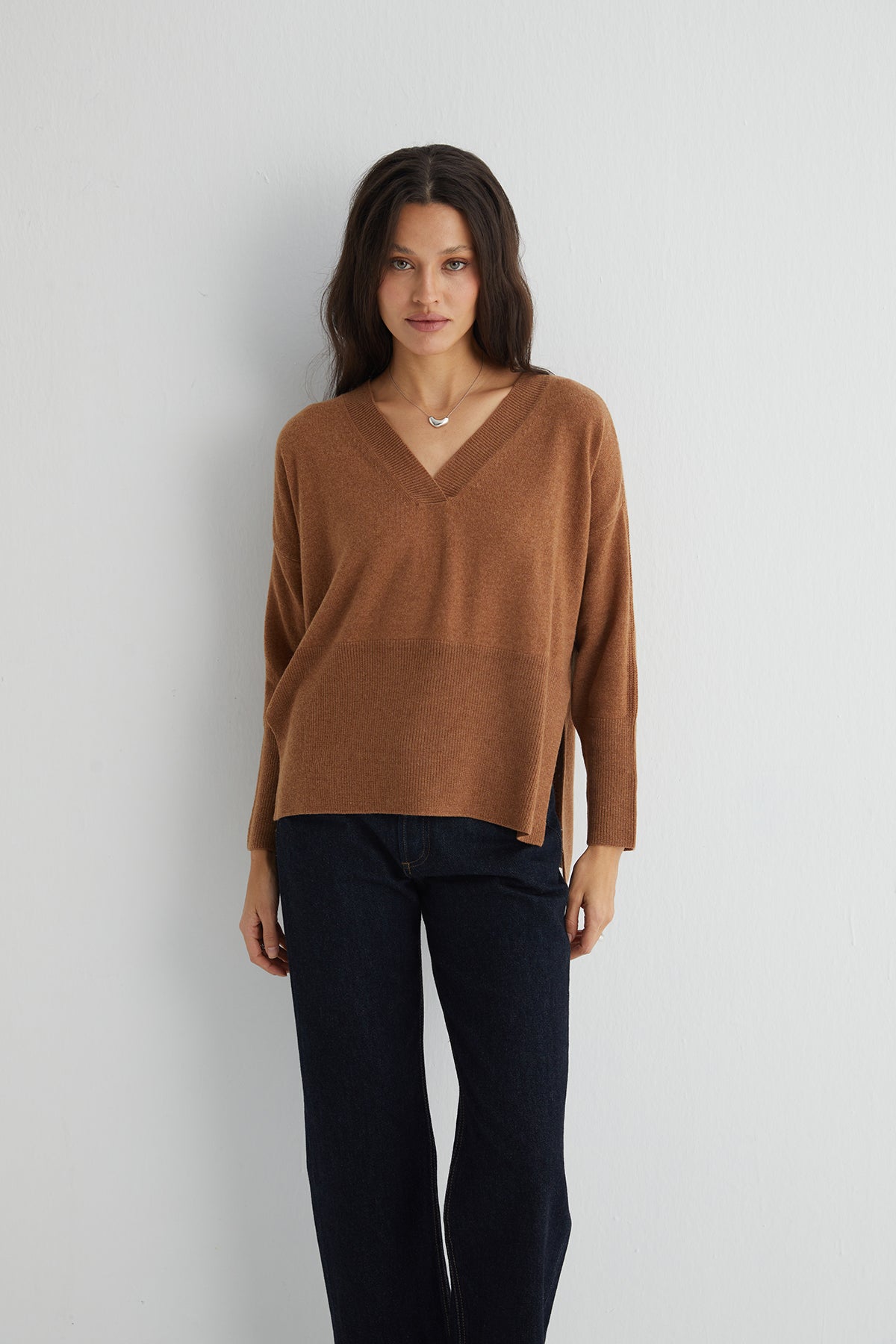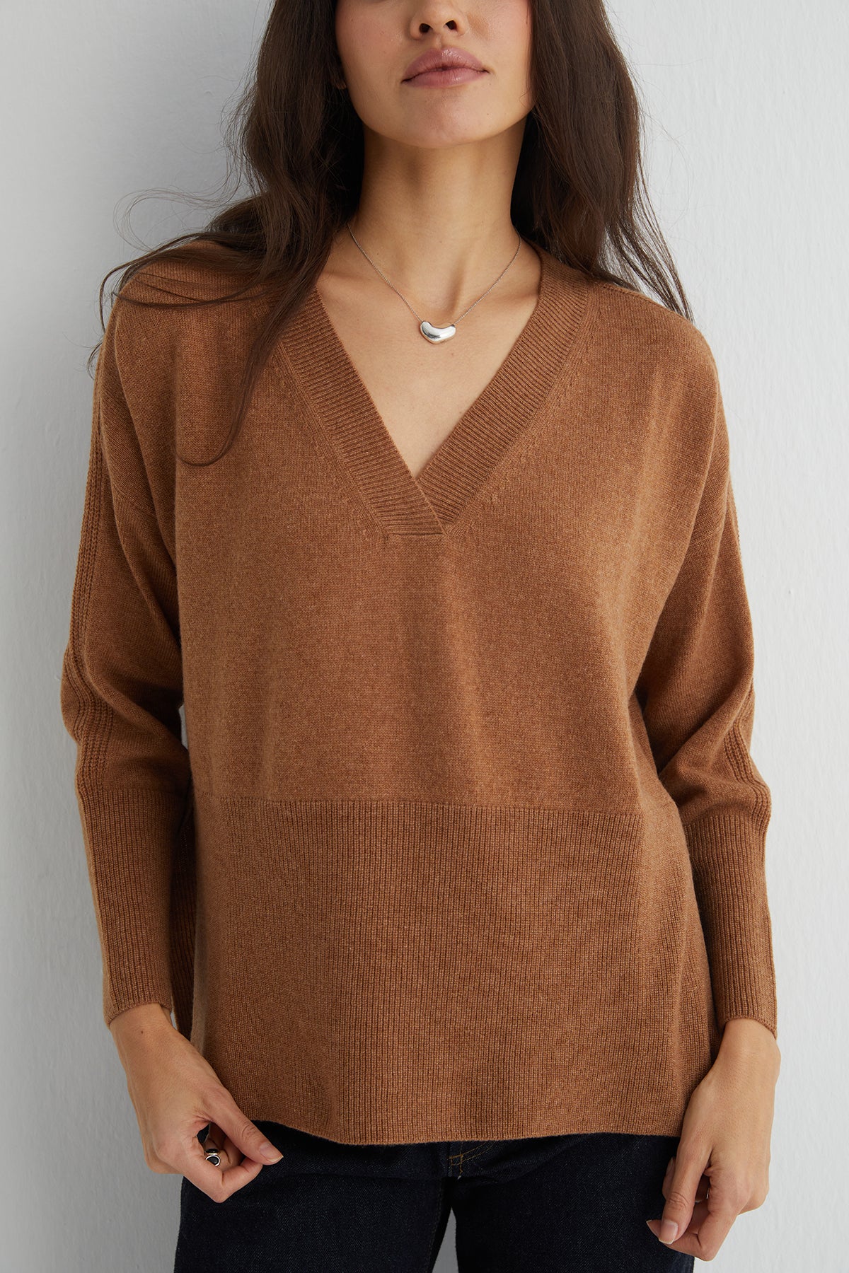 Koyu Camel Isabella Saf Kaşmir Derin V Yaka Kazak