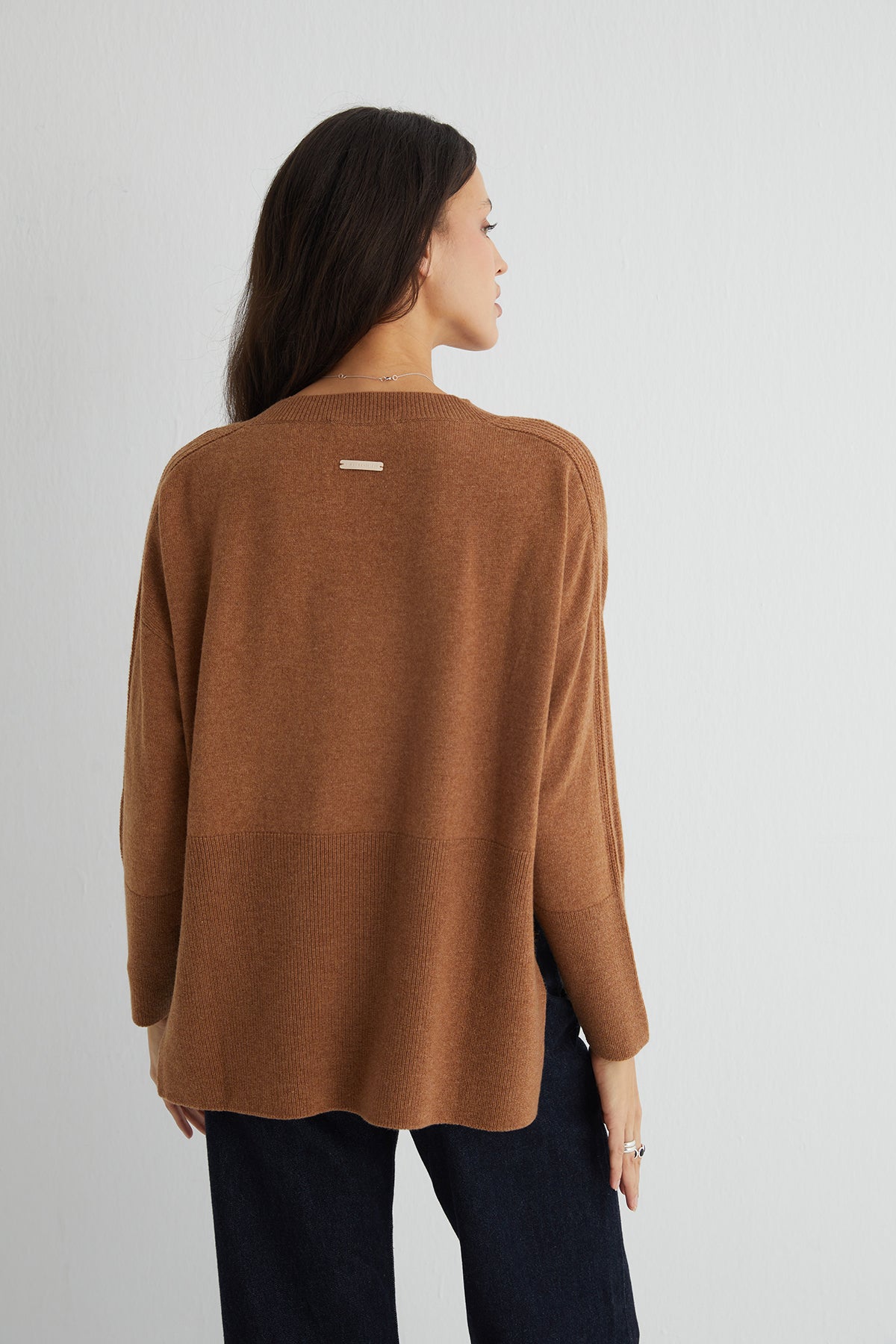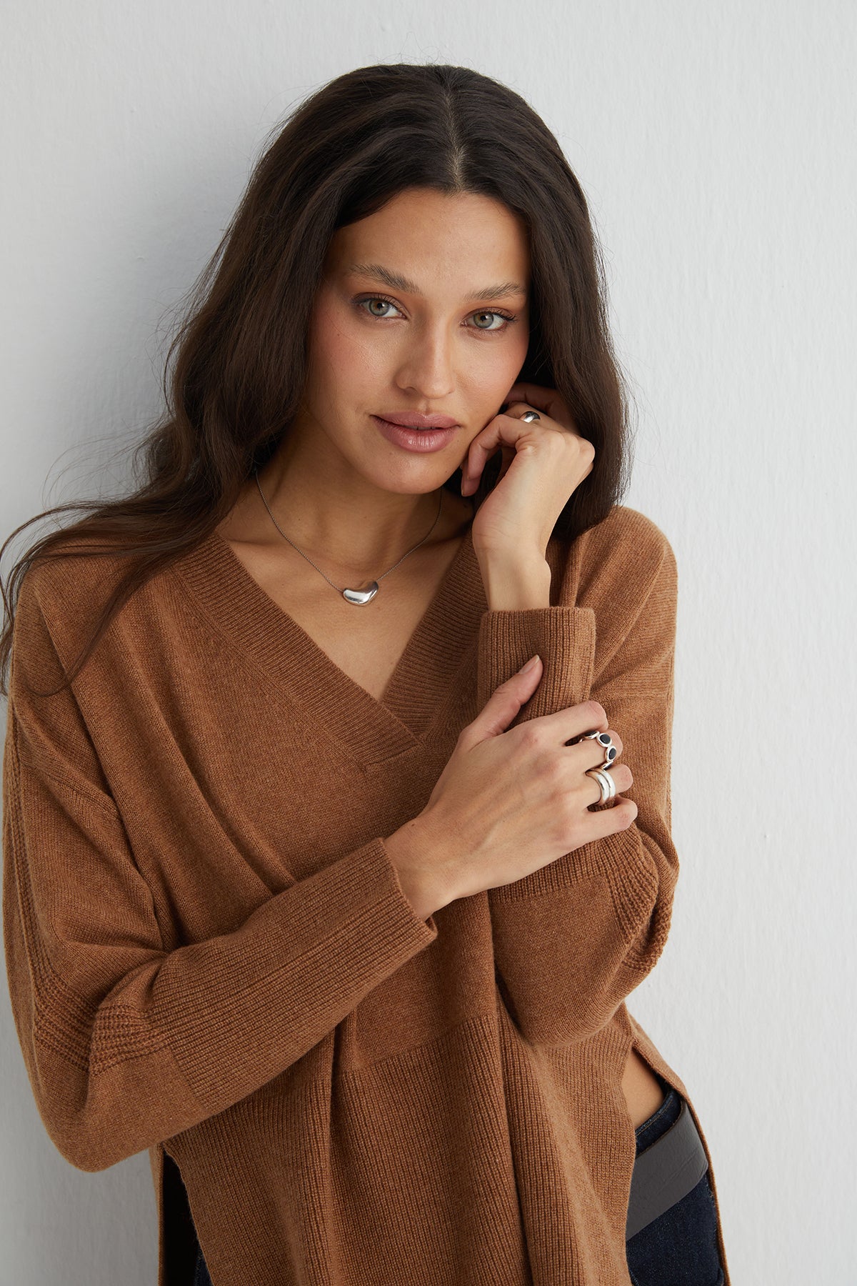 Isabella kazak, koyu camel tonuyla sade ama güçlü bir duruş sergilerken, saf kaşmirin eşsiz yumuşaklığıyla maksimum konfor sunar. Derin V yaka ve bol kesimiyle hareket özgürlüğü sağlar, ince detaylarla modern bir görünüm kazanır.