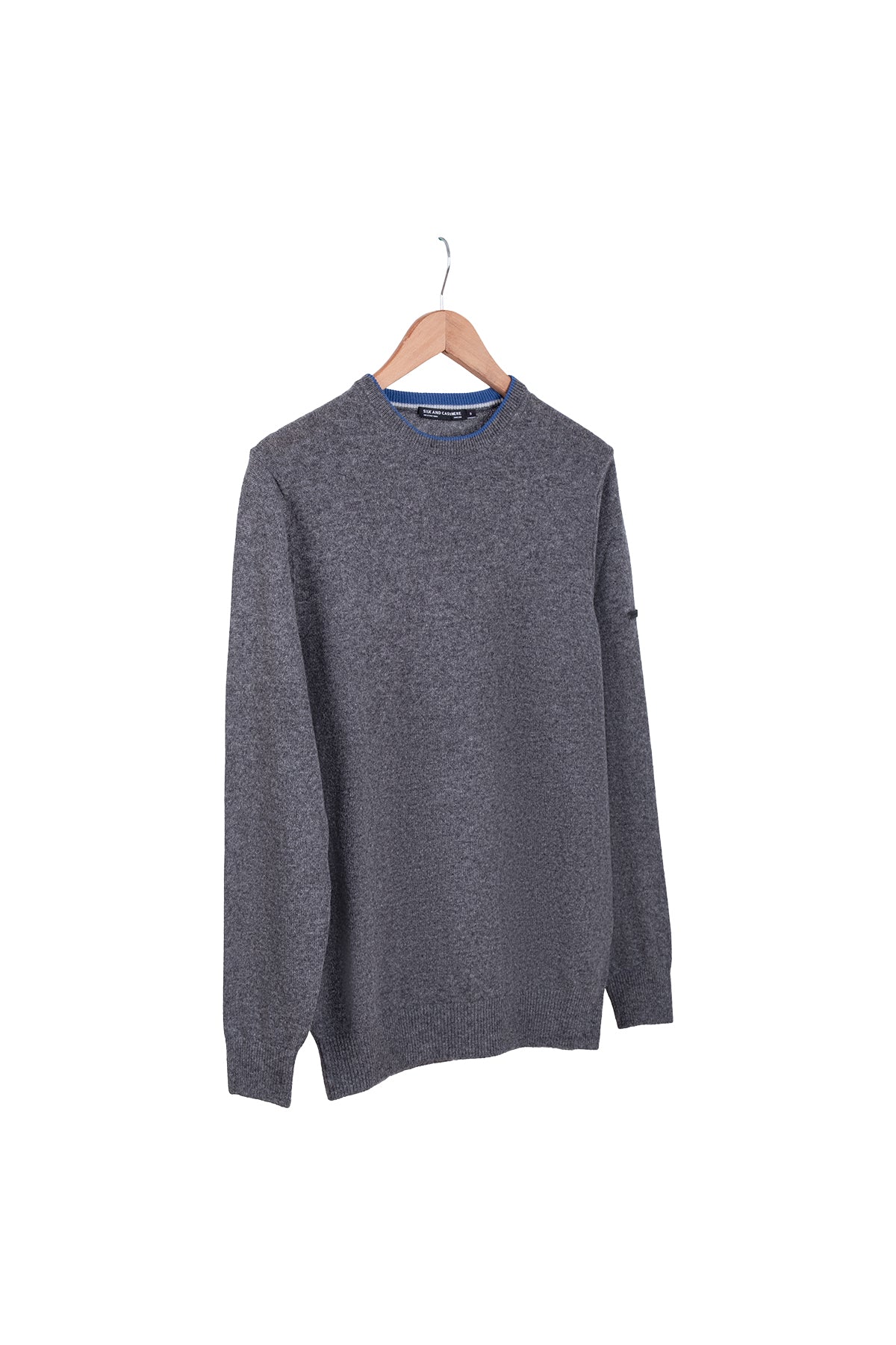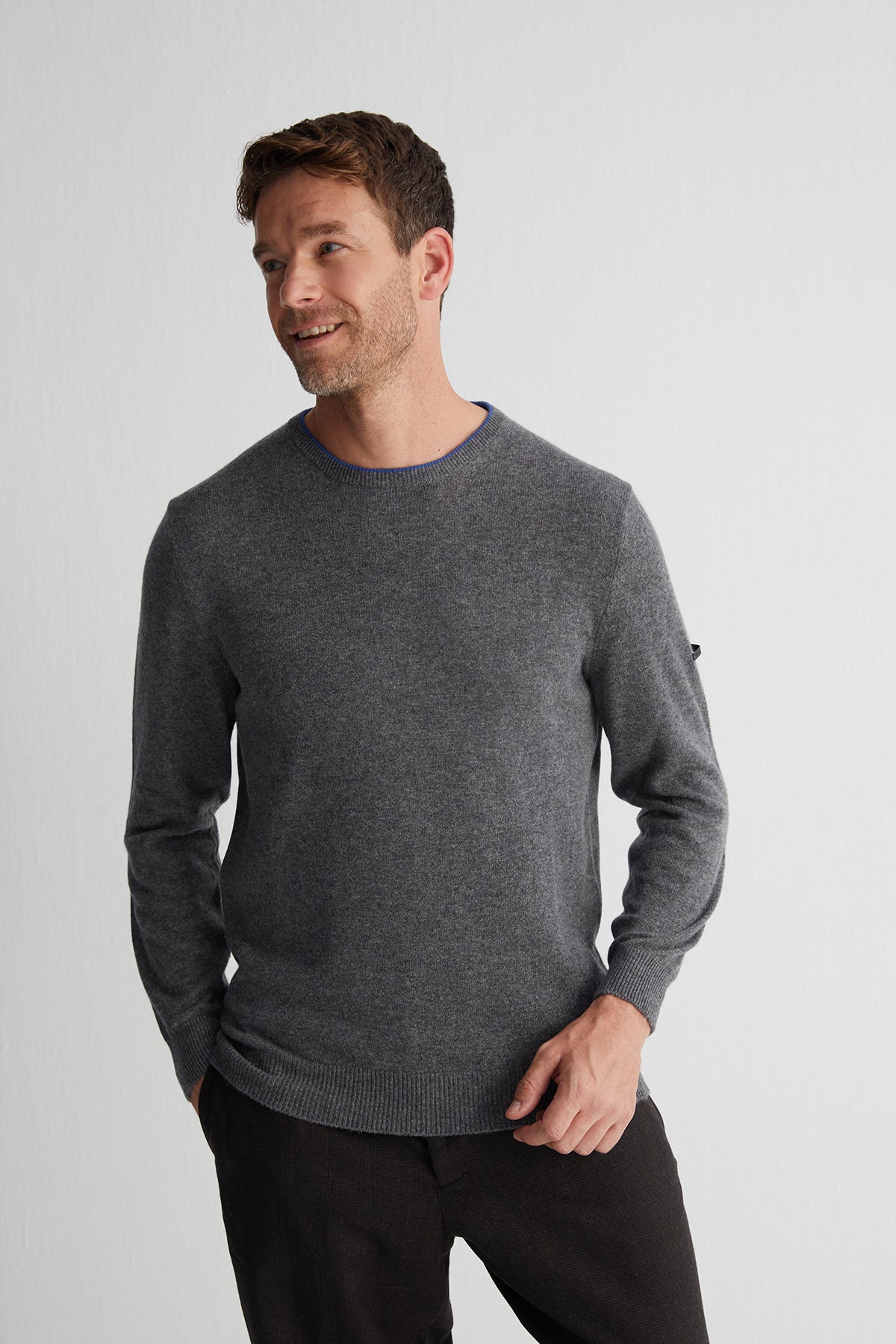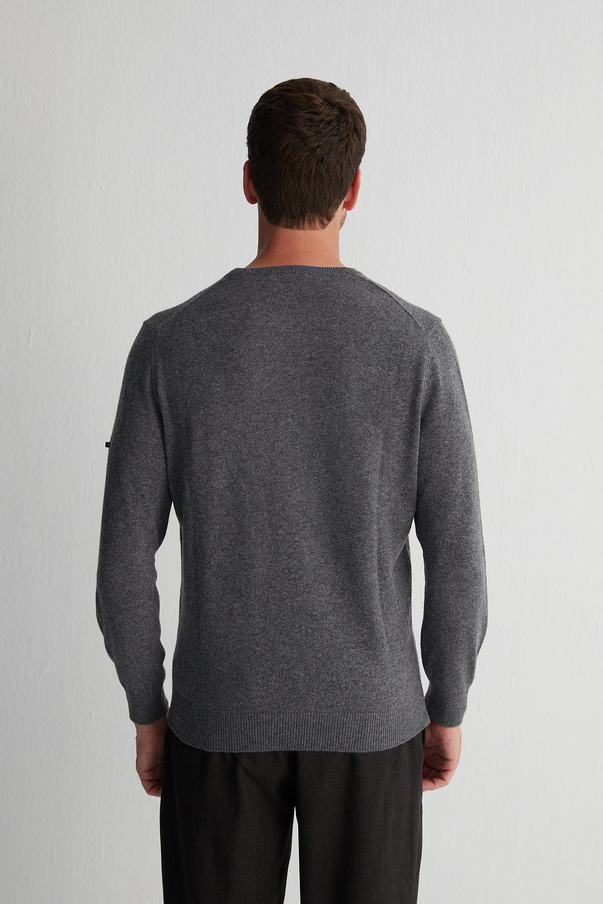 Günlük kullanıma uygun, dengeli ve rahat bir duruş sunan koyu gri Franco kazak, %100 saf kaşmir yapısıyla yumuşaklığı güçlü bir formda birleştirir. Kol ve etek uçlarındaki ribana örgü detayları, formun korunmasına katkı sağlarken, kazaktan beklenen yapısal bütünlüğü destekler. Yaka iç kısmında yer alan kontrast mavi şerit detayı ise sade tasarıma karakteristik bir dokunuş katar; kazak böylece hem zamansız hem özgün bir çizgi kazanır.