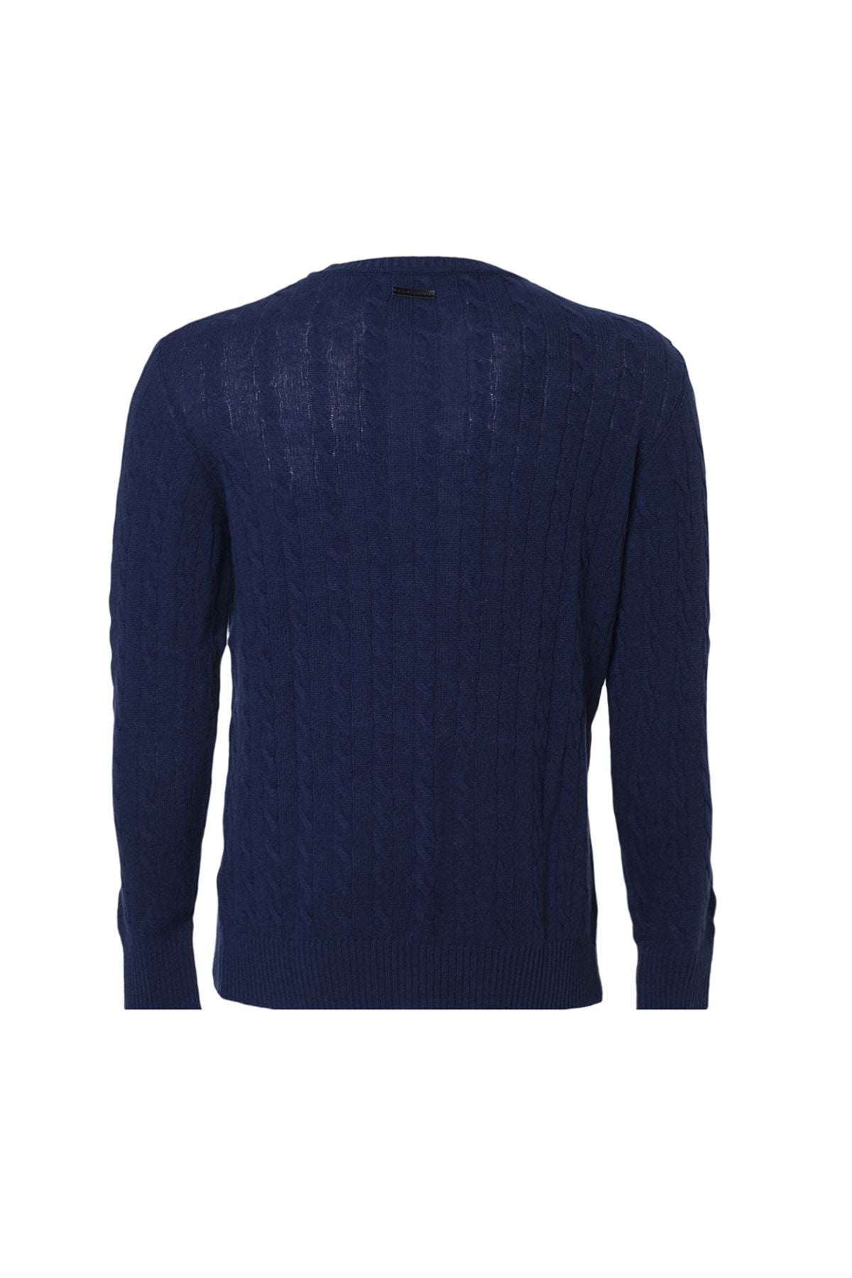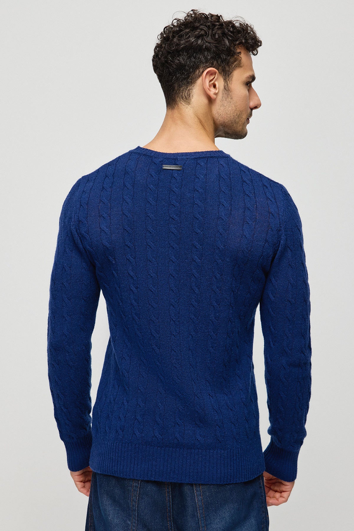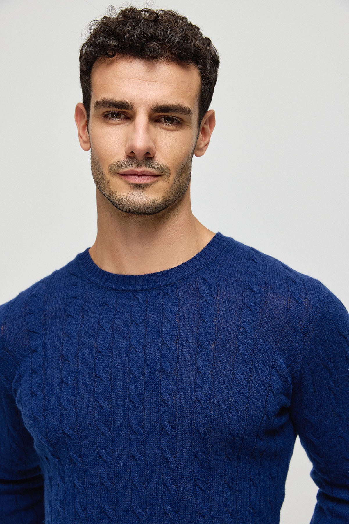 Lacivert Amerigo Avustralya Yünü Kaşmir Saç Örgülü Yuvarlak Yaka Uzun Kollu Erkek Kazak