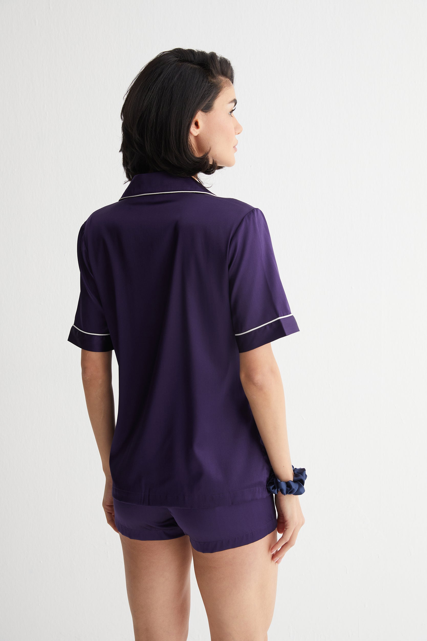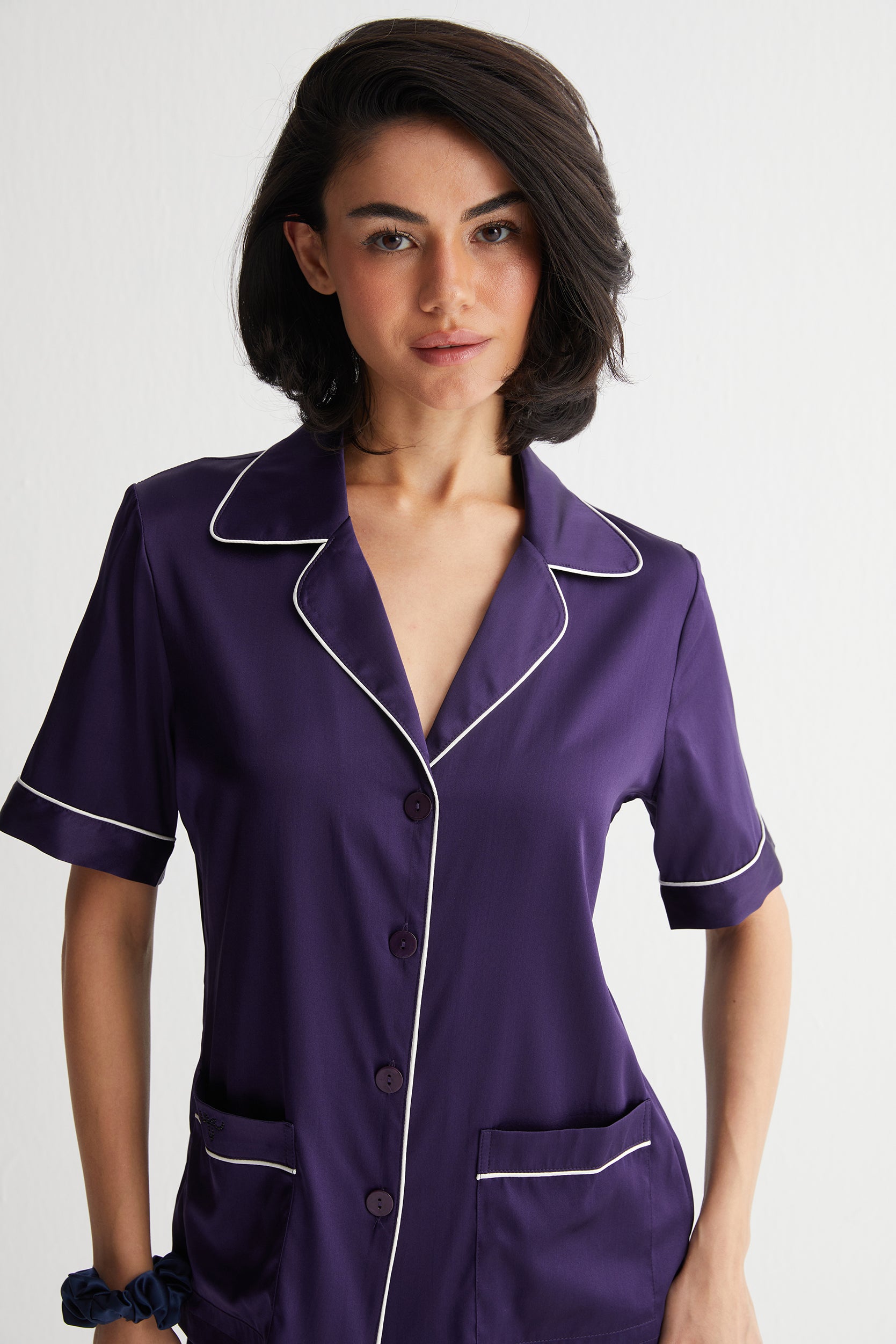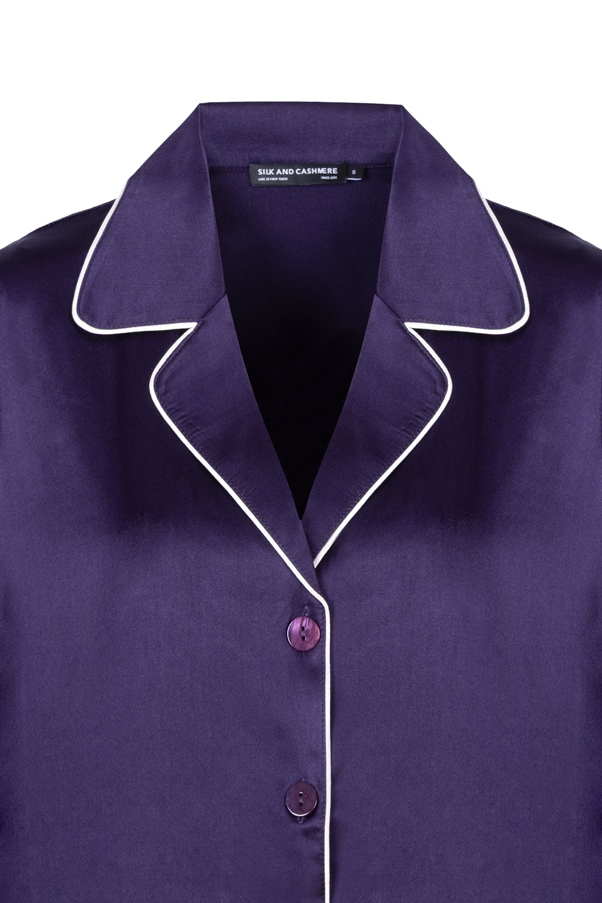 Lacivert Cindy İpek Pijama Seti, ipeğin doğal zarafetini modern çizgilerle buluşturuyor. Kontrast beyaz biyelerle hareketlenen tasarımı, Silk and Cashmere’in özenli işçiliğiyle tamamlanırken, serin ve rahat bir uyku deneyimi sunuyor.