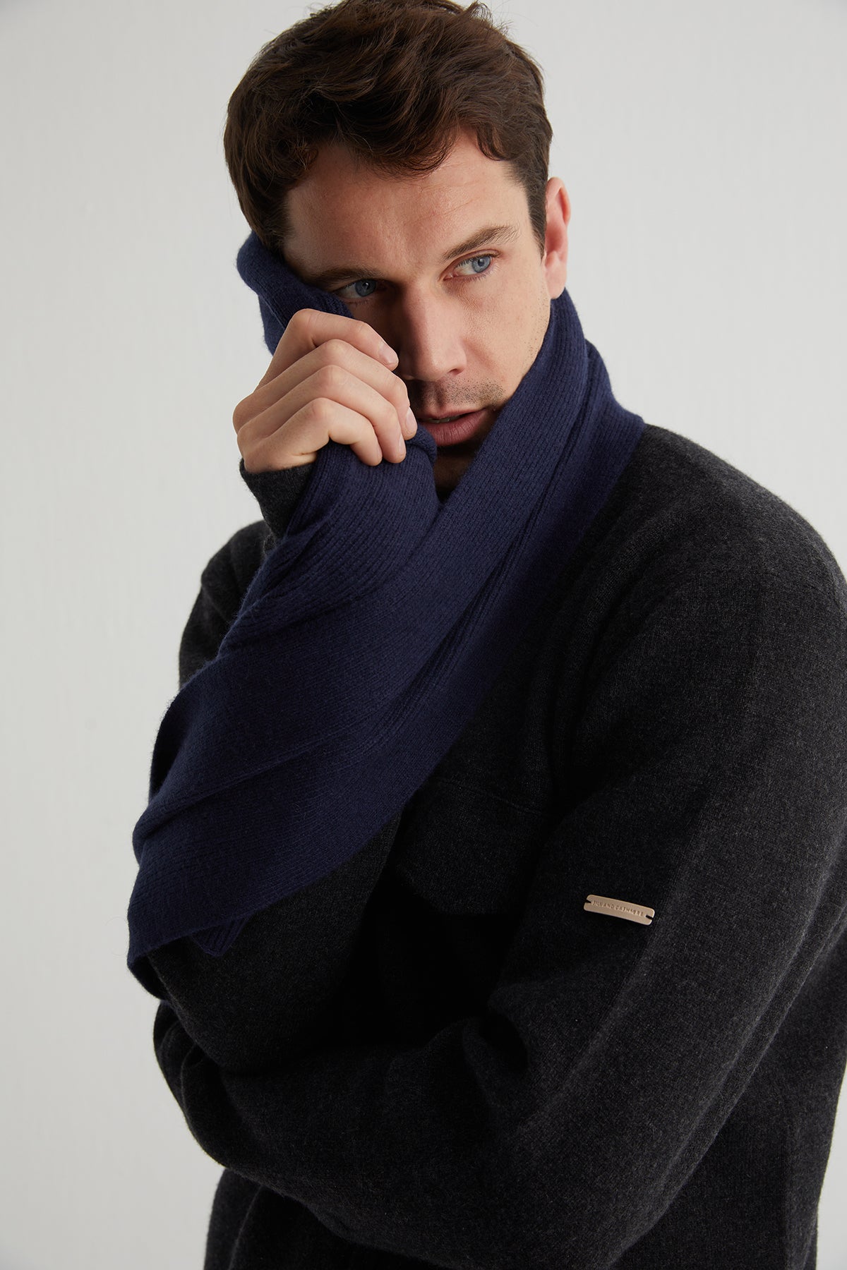 Lacivert Copenhagen Saf Yün Ribana Örme Atkı 25x150 cm