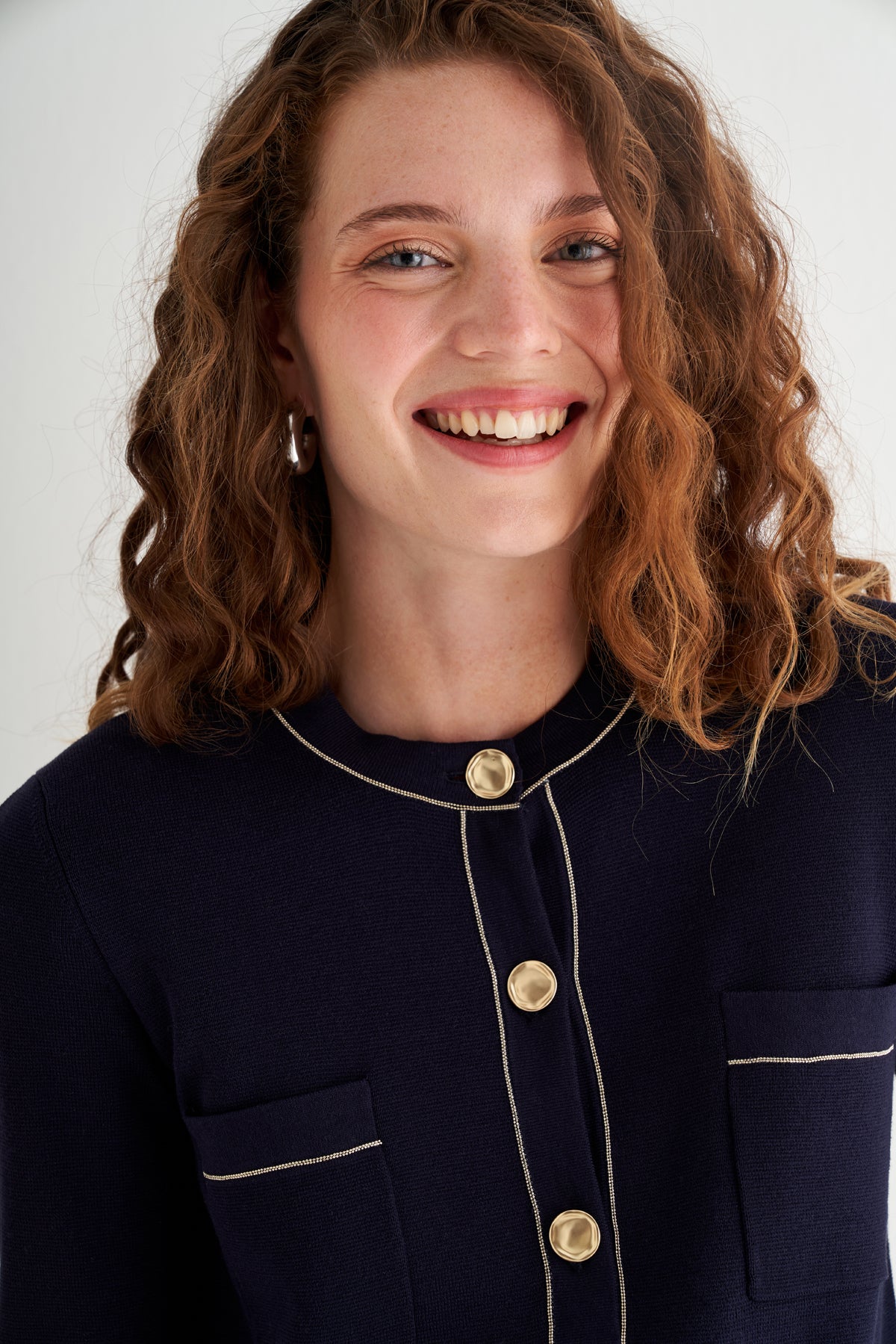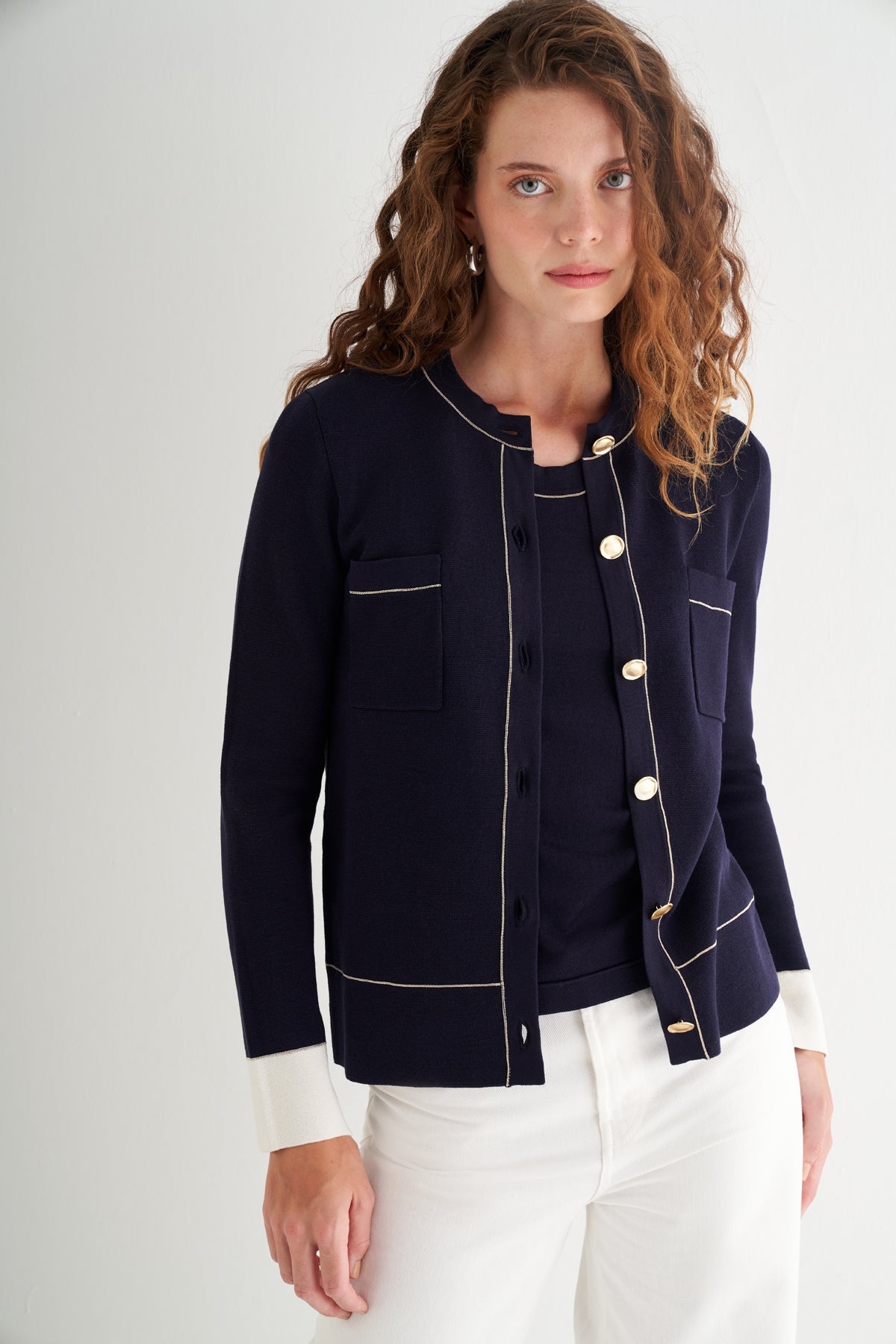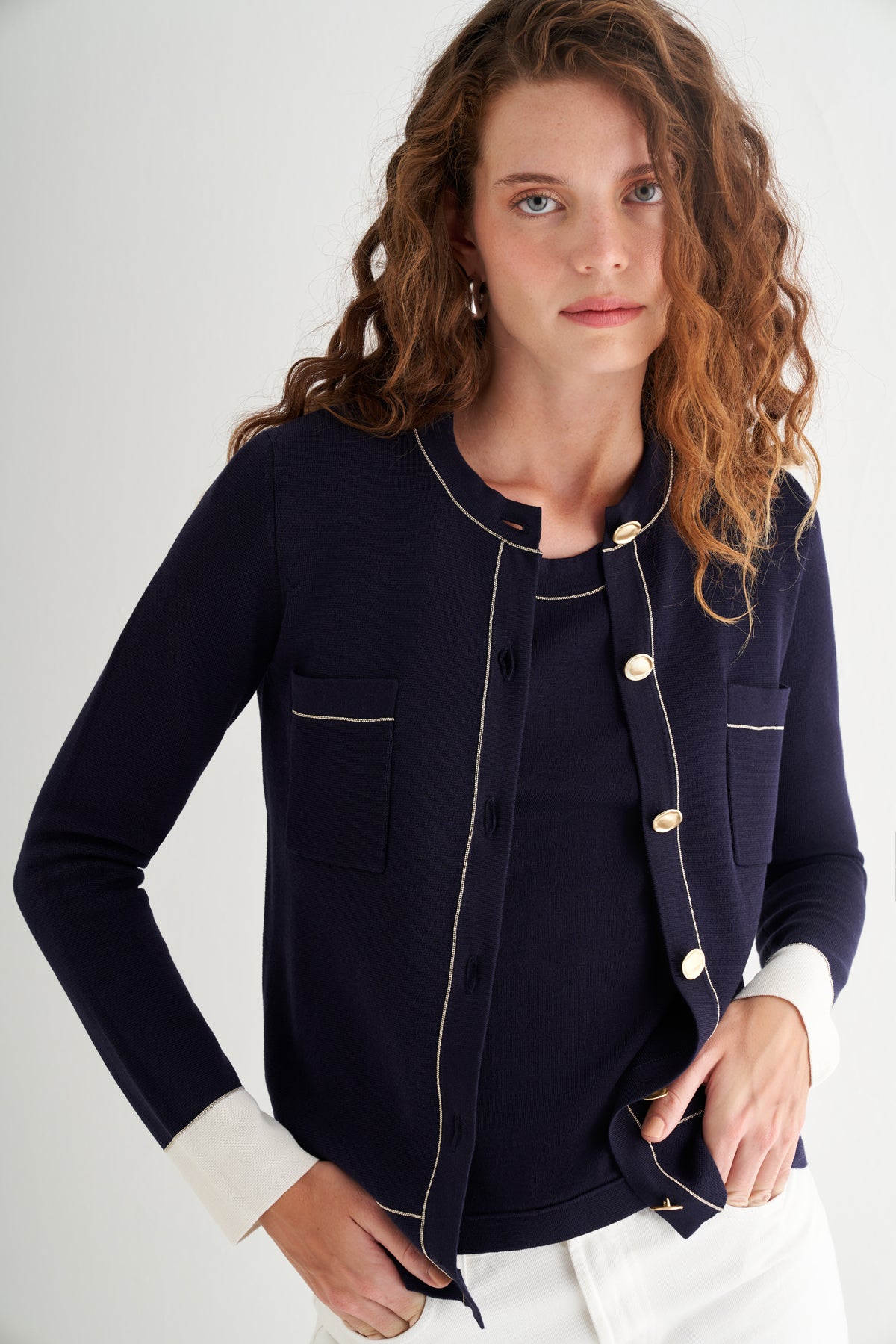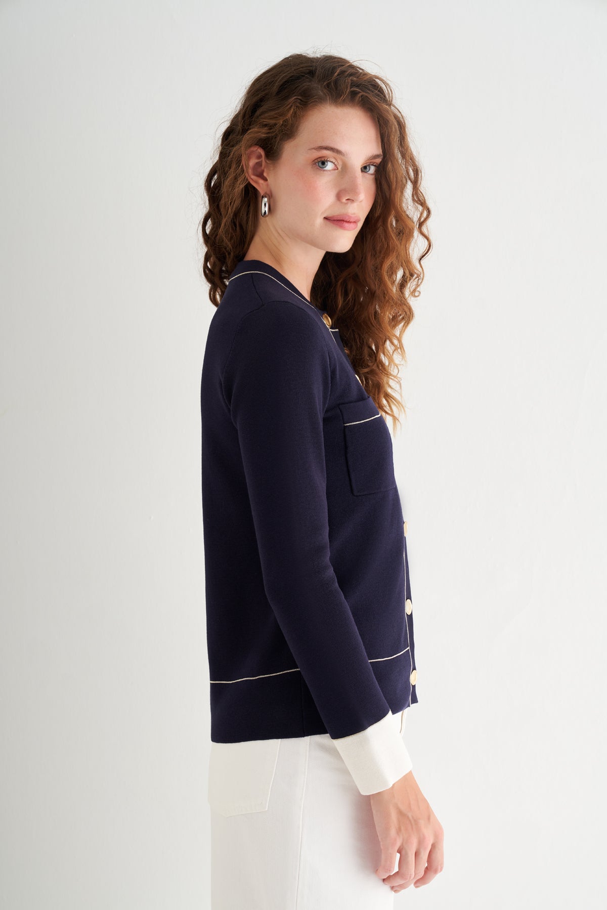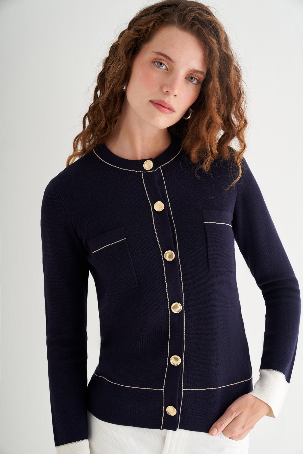 Altın tonlu düğmeleriyle modern zarafeti detaylarda yaşatır.