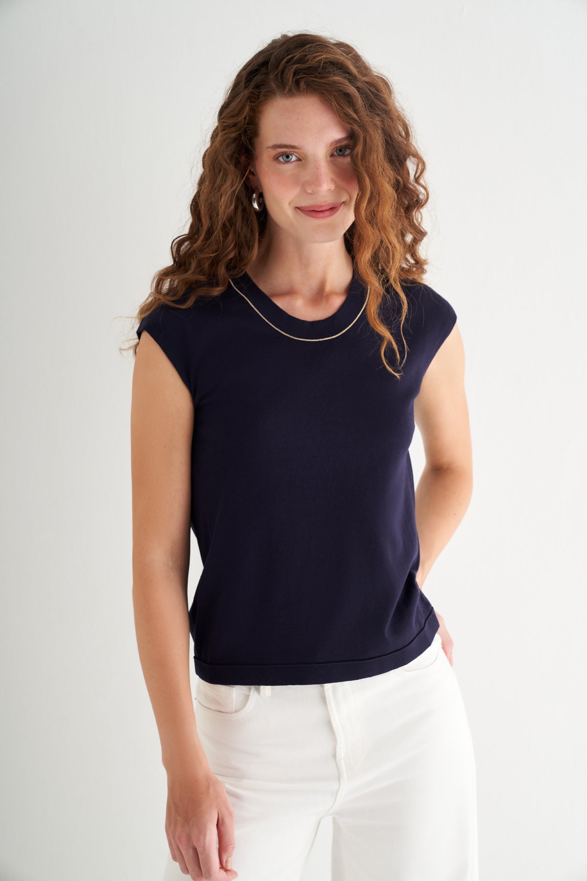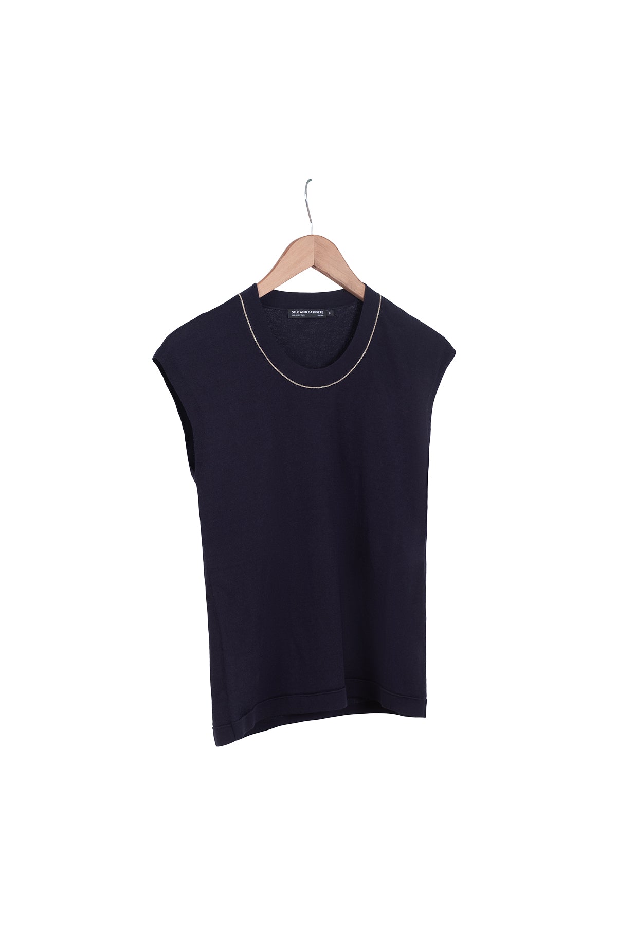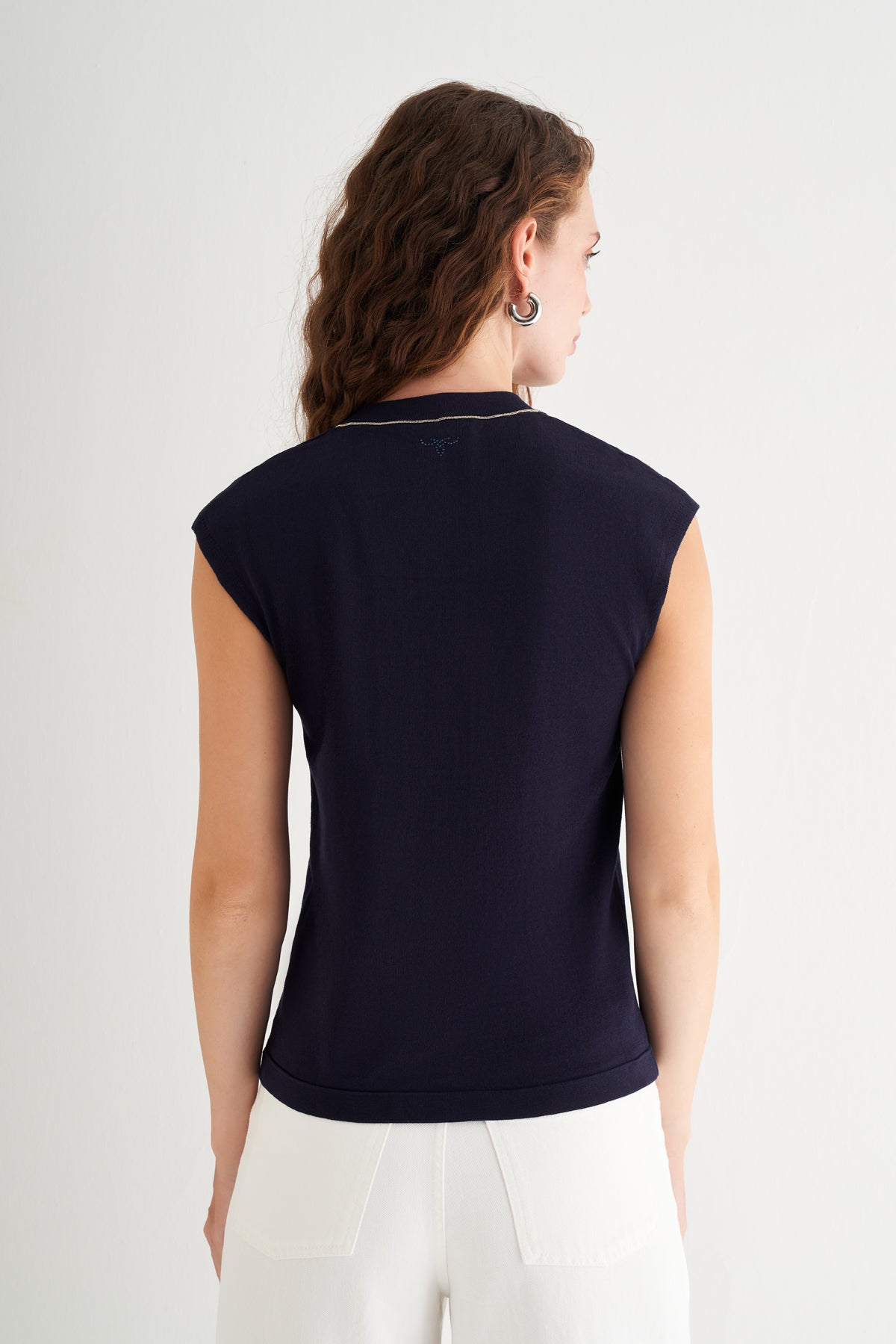 Lacivert Grace İpekli Zincirli Yuvarlak Yaka Kolsuz Triko