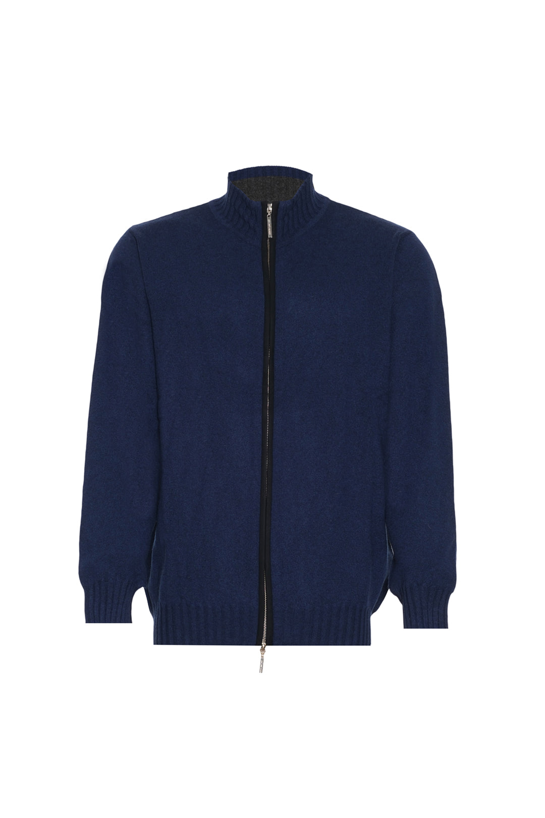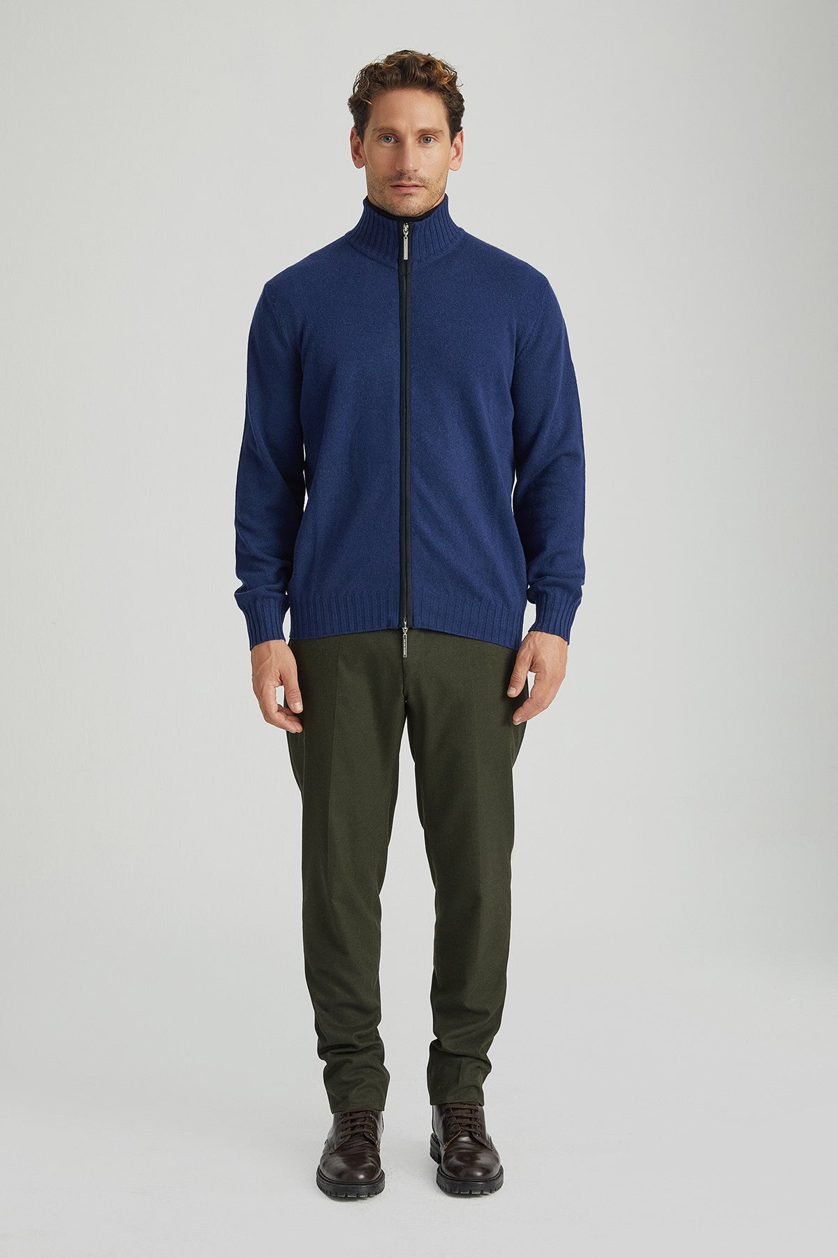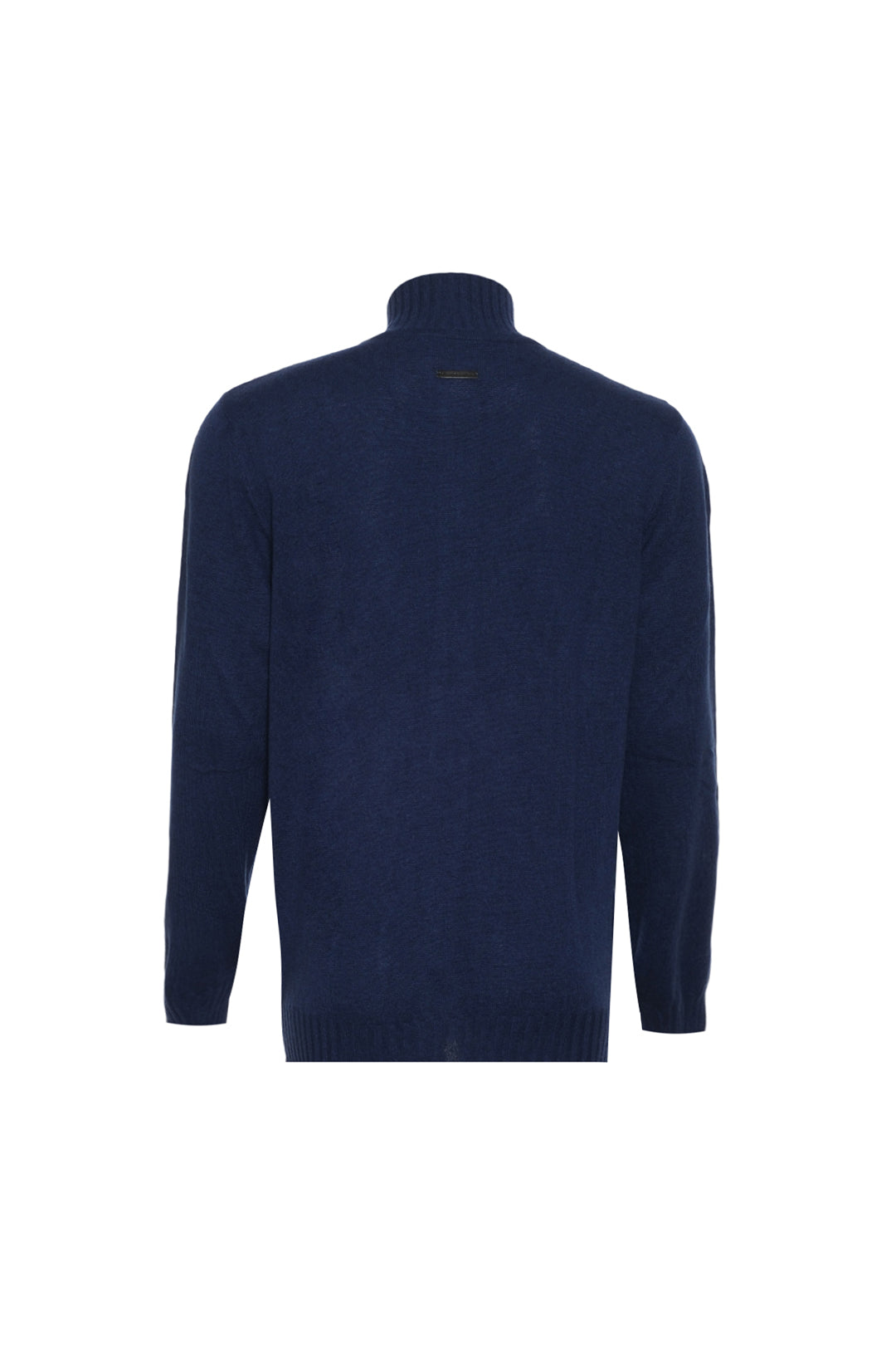 Lacivert Saf Kaşmir Deri Biyeli Yarım Balıkçı Yaka Fermuarlı Erkek Hırka