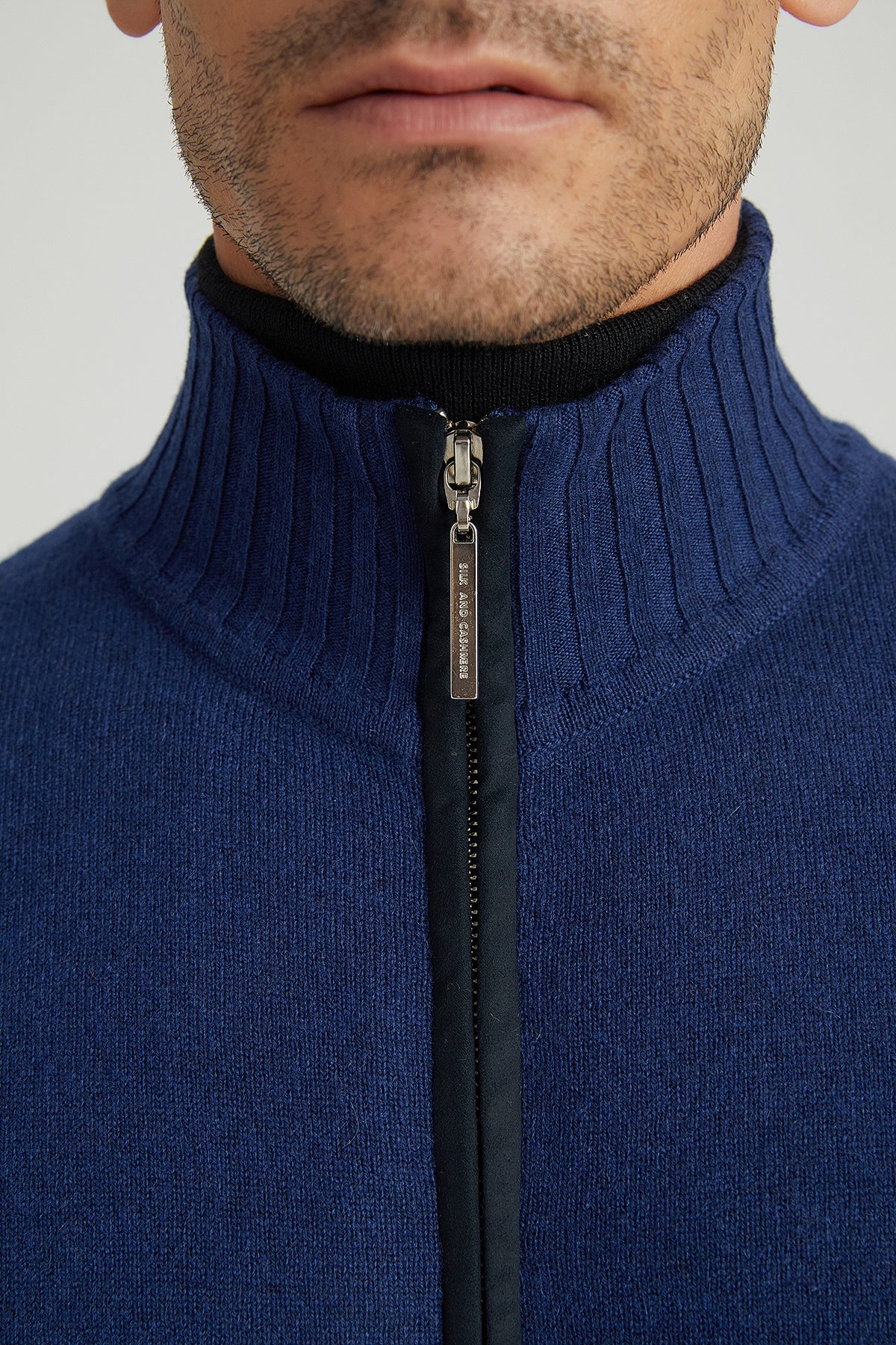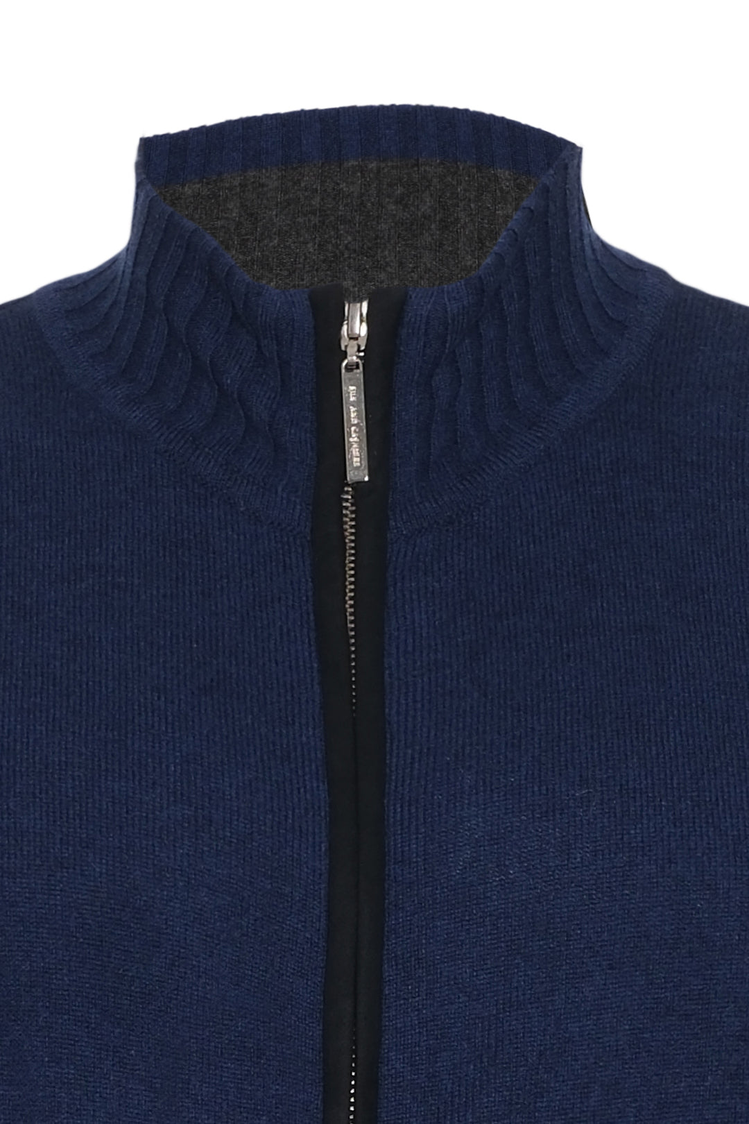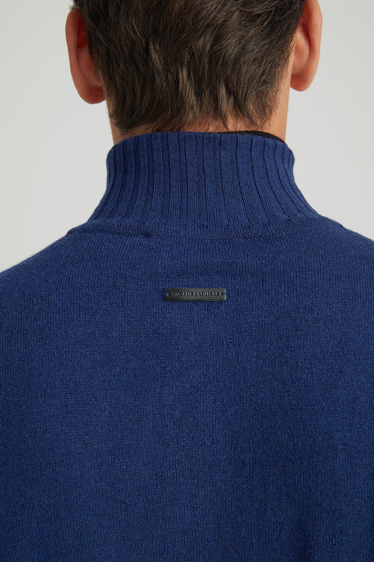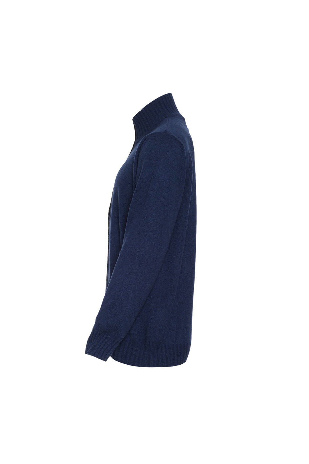 Lacivert Saf Kaşmir Deri Biyeli Yarım Balıkçı Yaka Fermuarlı Erkek Hırka