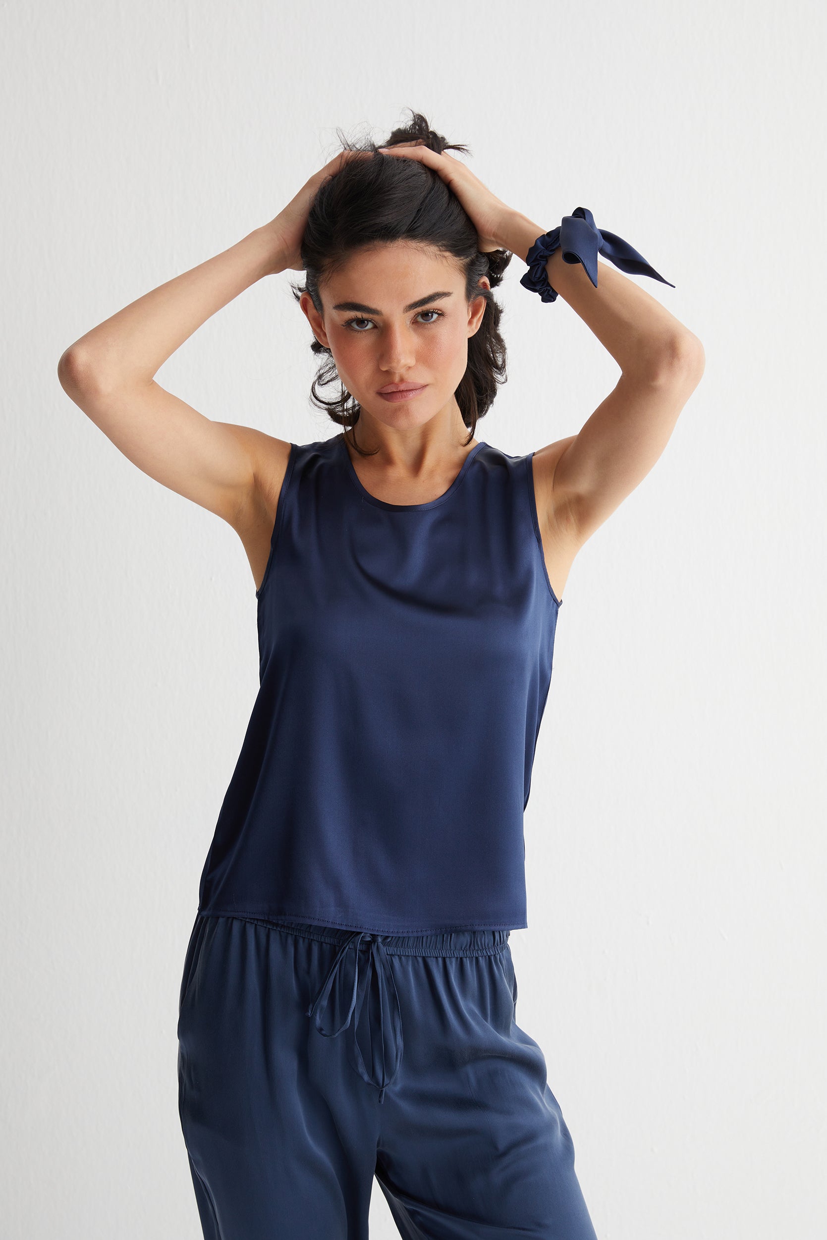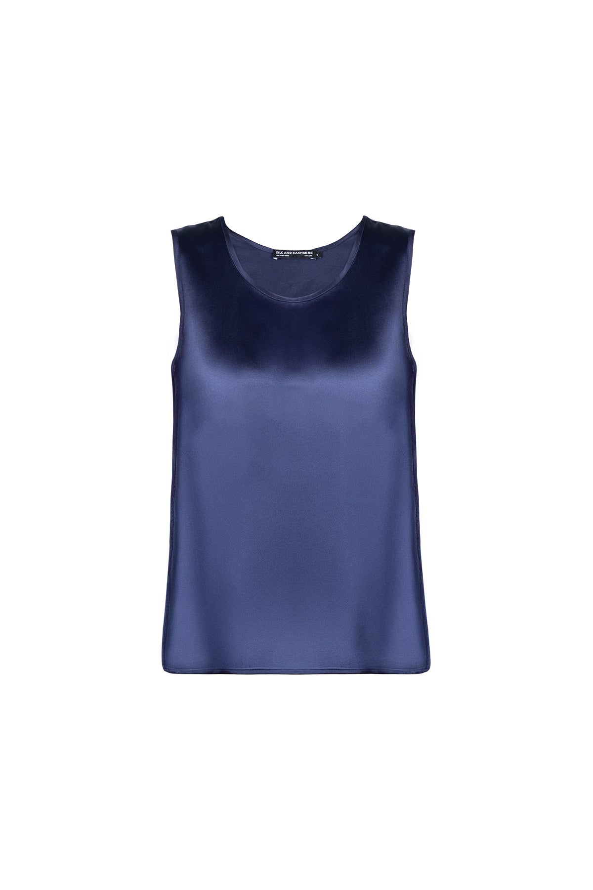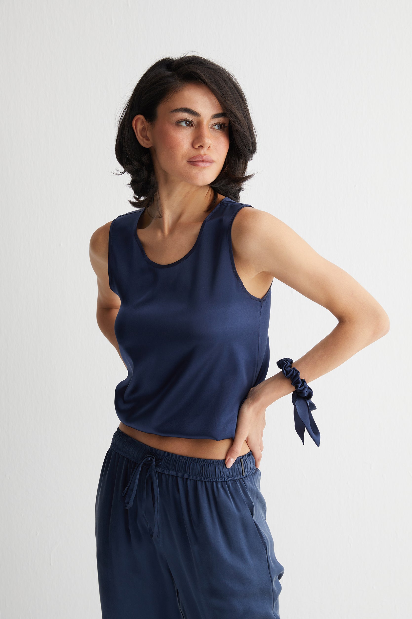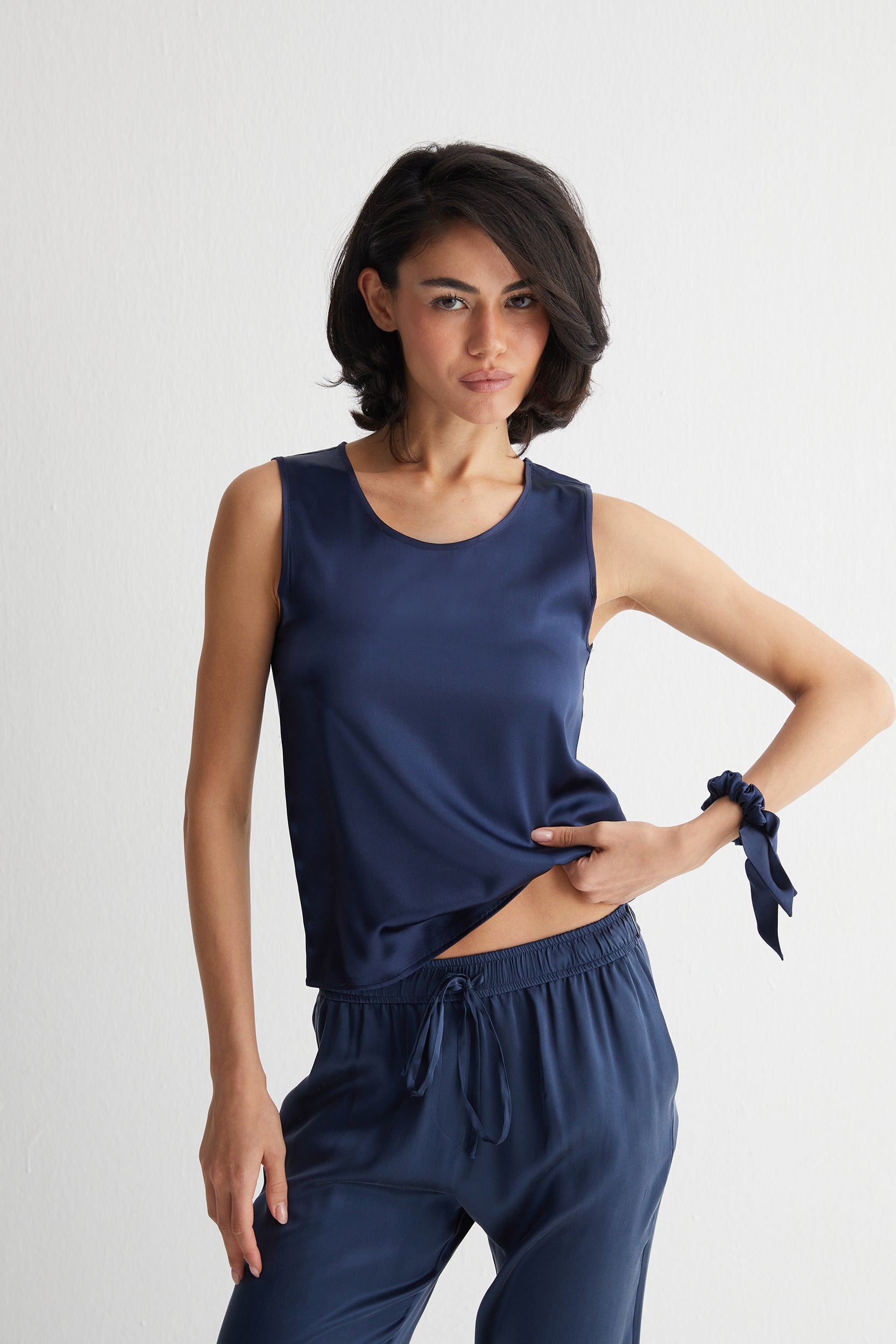 Lacivert Toscana İpek Yuvarlak Yaka Bluz