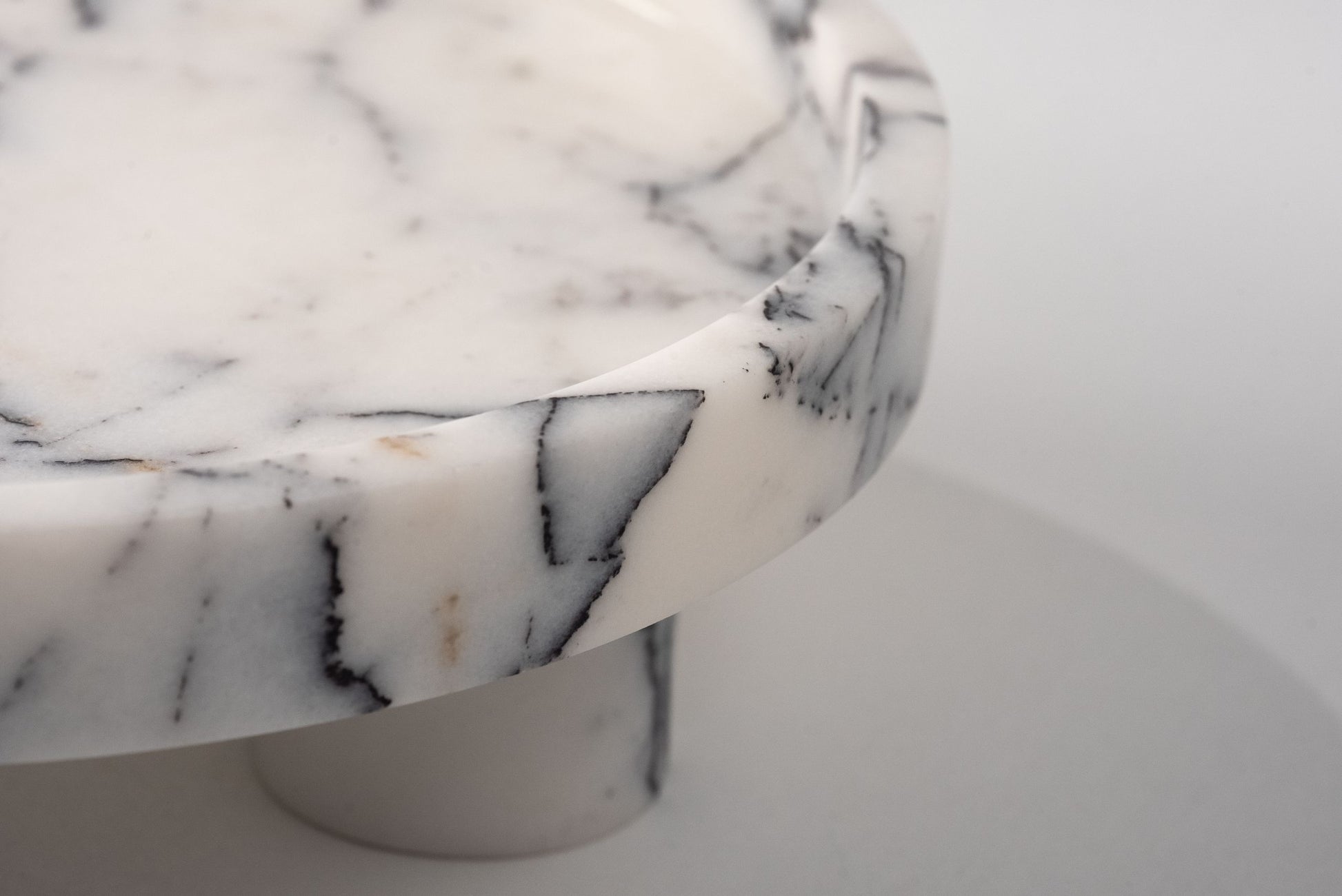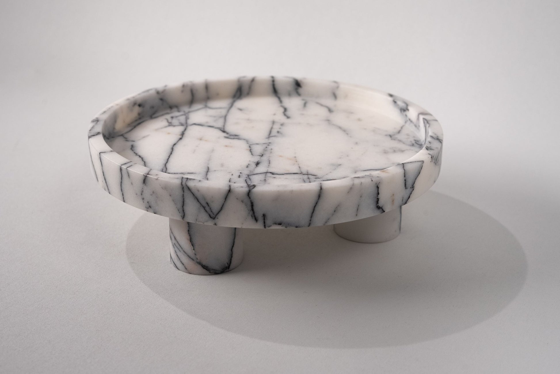 Harriet ayaklı sunum tepsisi, klasik sunum anlayışına heykelsi bir yorum katıyor. Üç ayak üzerinde yükselen bu özel parça, yalnızca işleviyle değil, duruşuyla da dikkat çeker. Mermerin doğal damarları her tepsiyi tekil bir forma dönüştürürken, yükseltilmiş yapısı sunumlara katmanlı bir derinlik kazandırır. Sofralarda, sehpalarda ya da girişlerde kullanılmak üzere tasarlanmış bu parça, bulunduğu ortama zarif bir ağırlık katar.