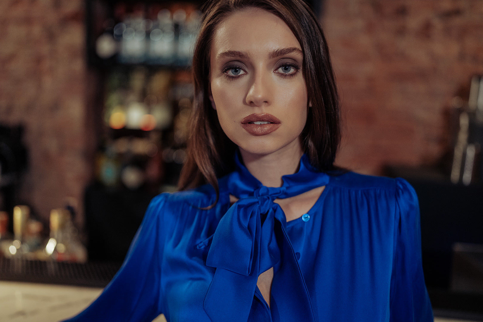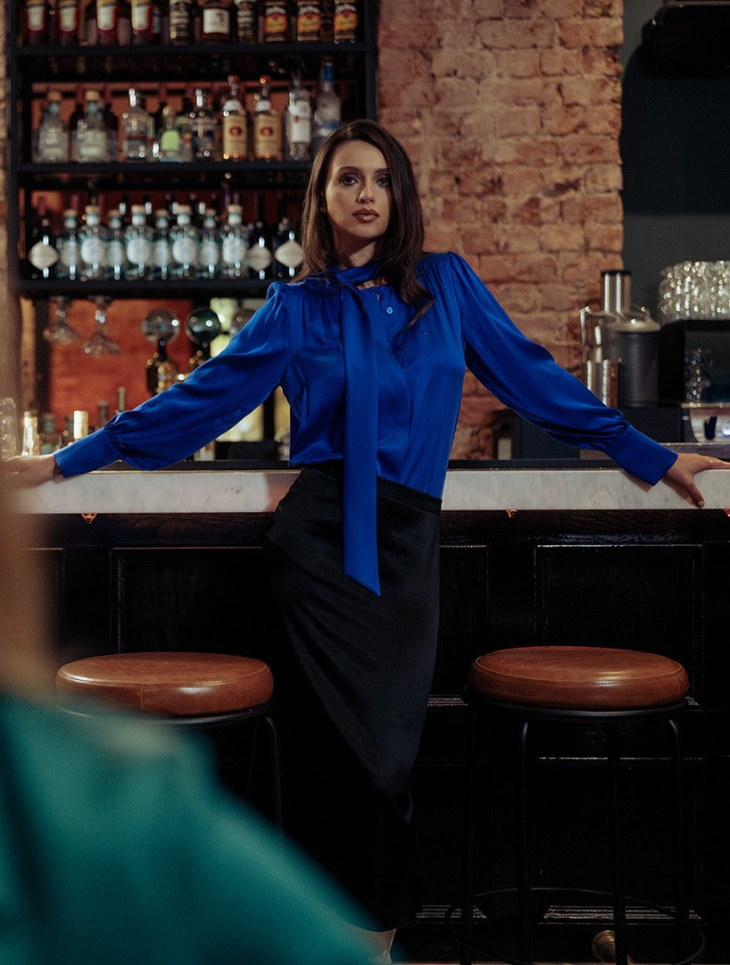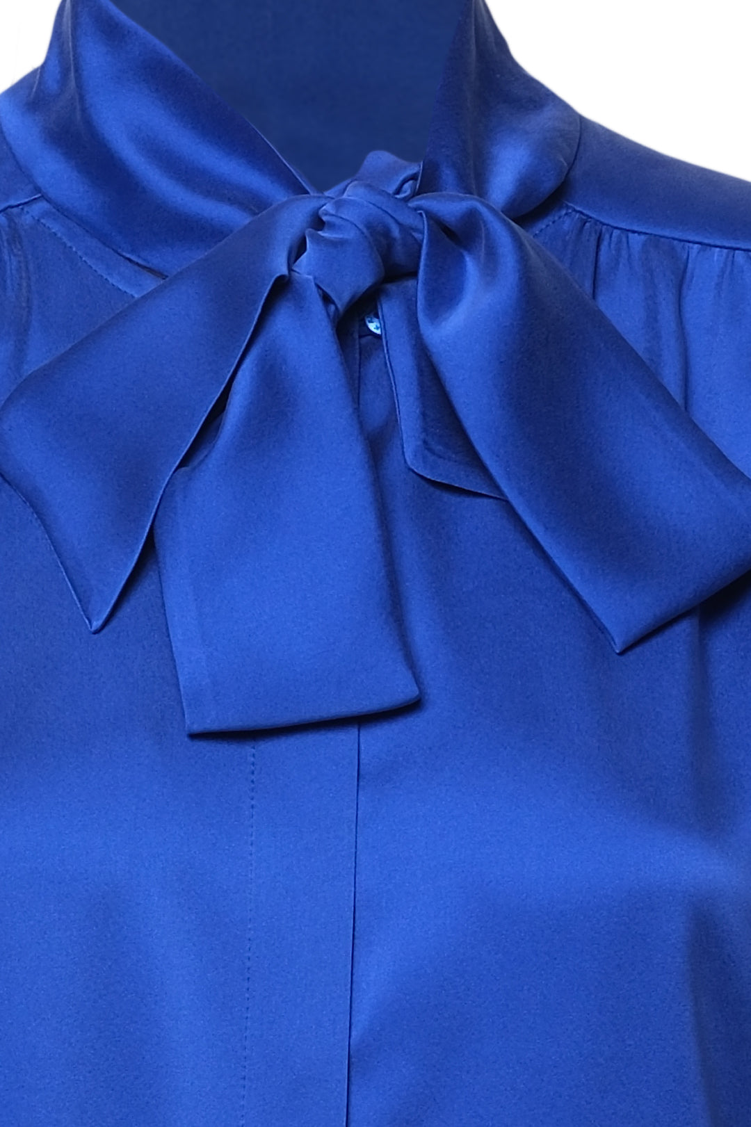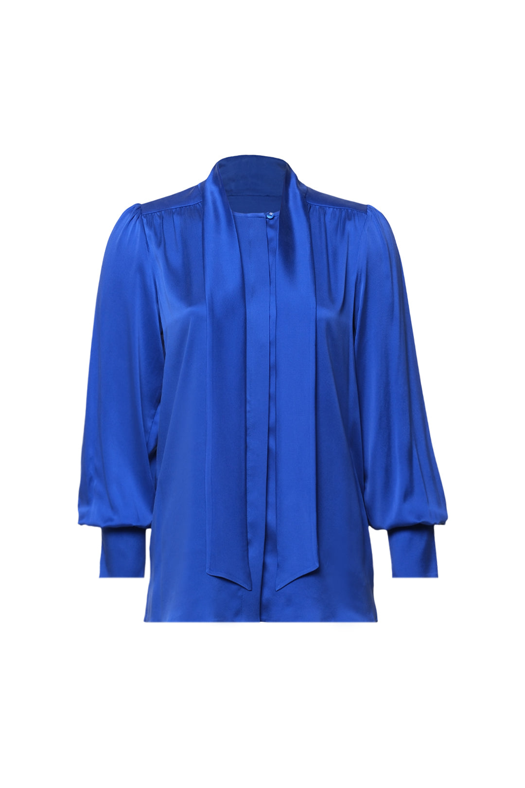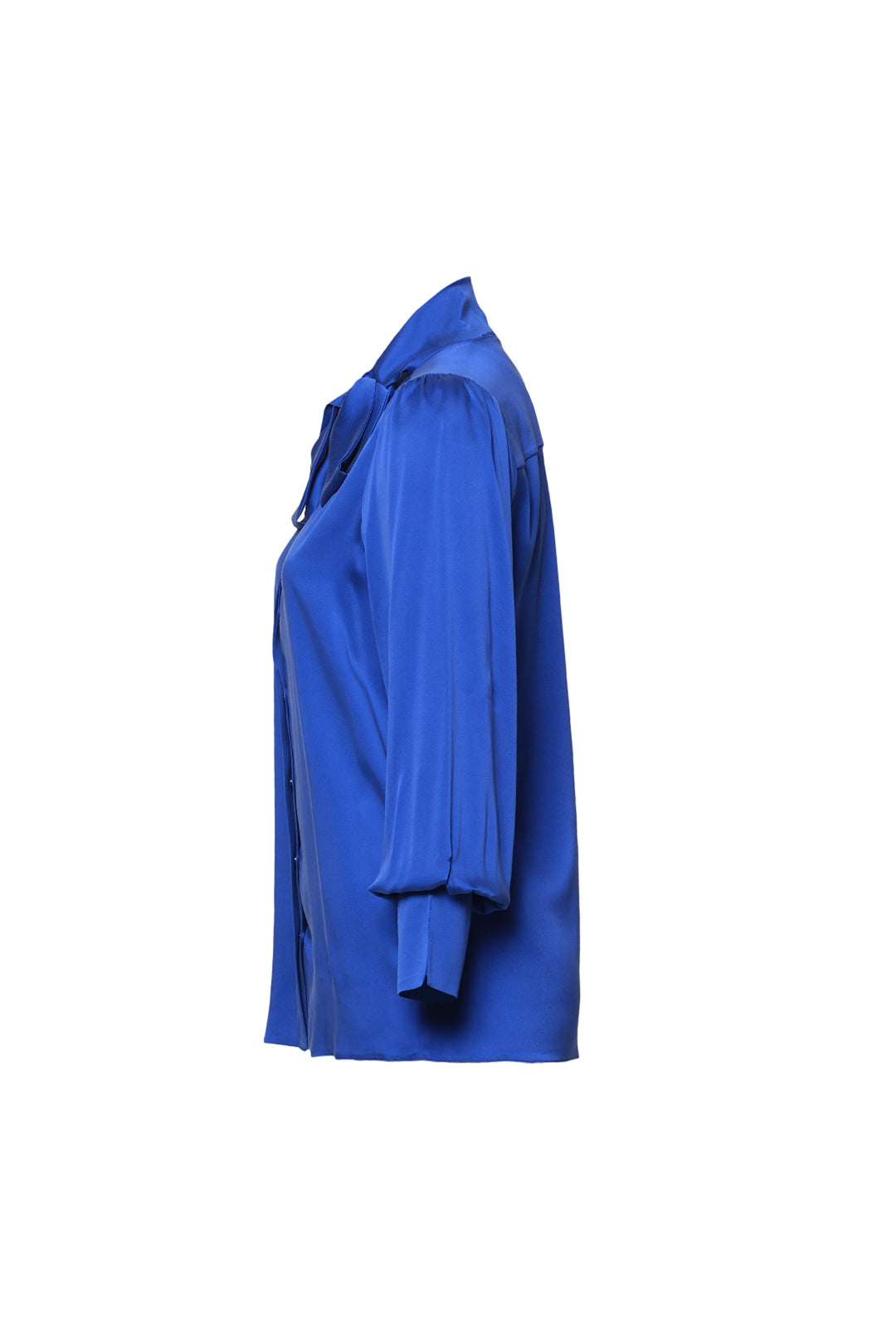 Saks Mavi Saf İpek Cecilia Fulara Yaka Uzun Kollu Gömlek