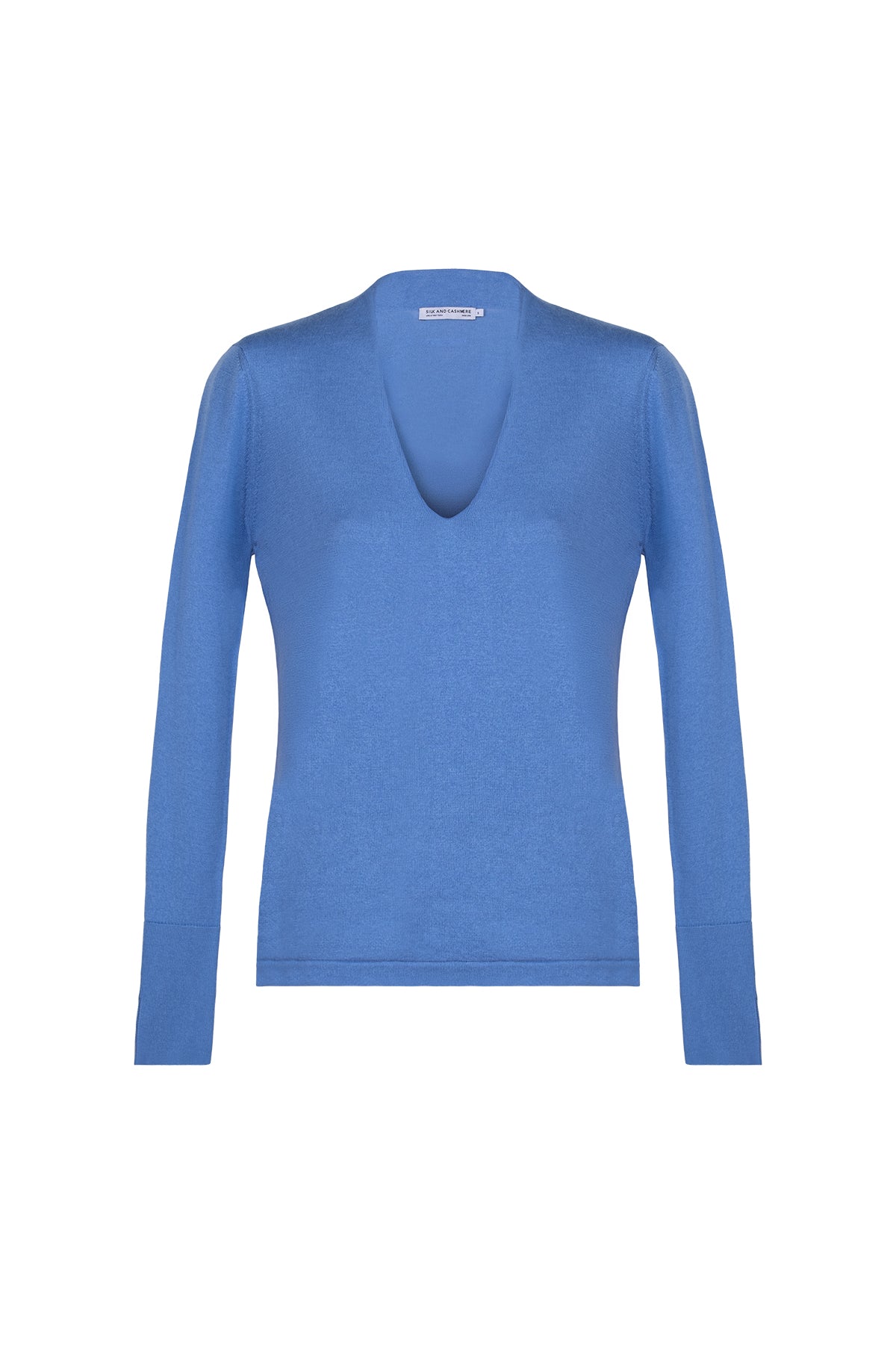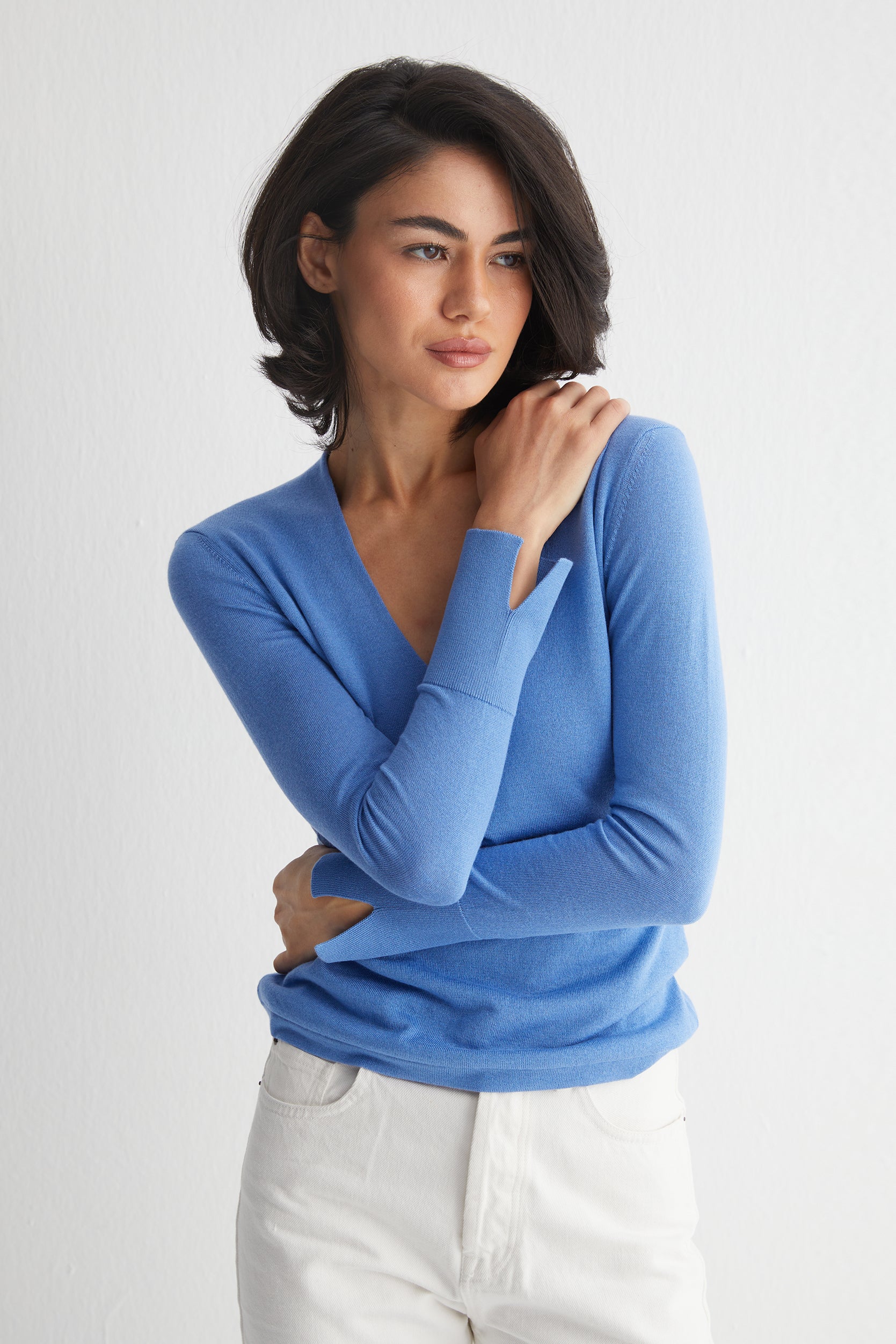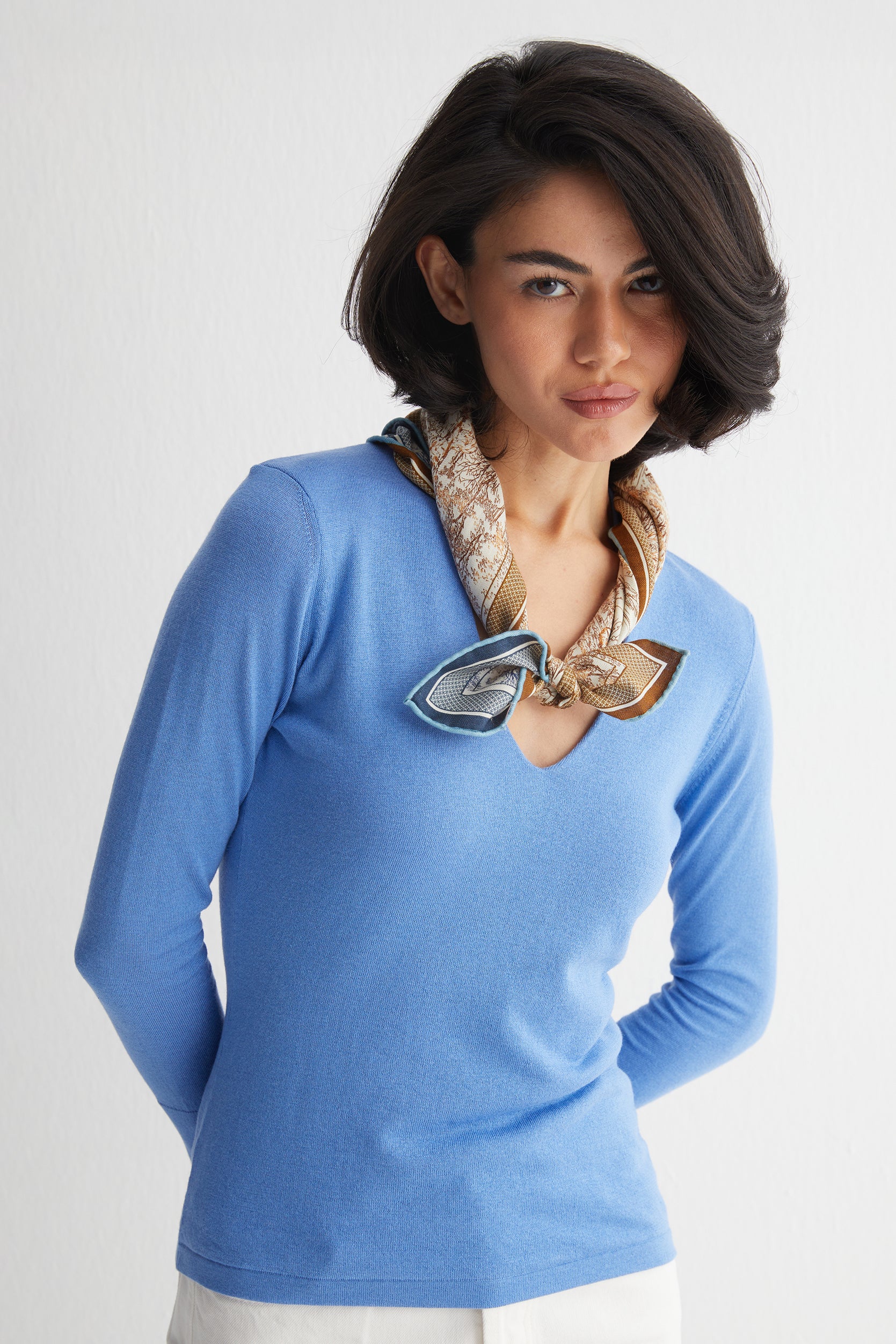 İpeğin pürüzsüz hissi ve kaşmirin sıcaklığıyla öne çıkan bu triko, hafif ve nefes alabilir dokusuyla gün boyu konfor sunar. Canlı mavi tonu ve derin V yaka kesimiyle modern bir duruş sergiler. Doğal elyaf içeriği sayesinde cildi nazikçe sararak rahat bir kullanım sağlar.