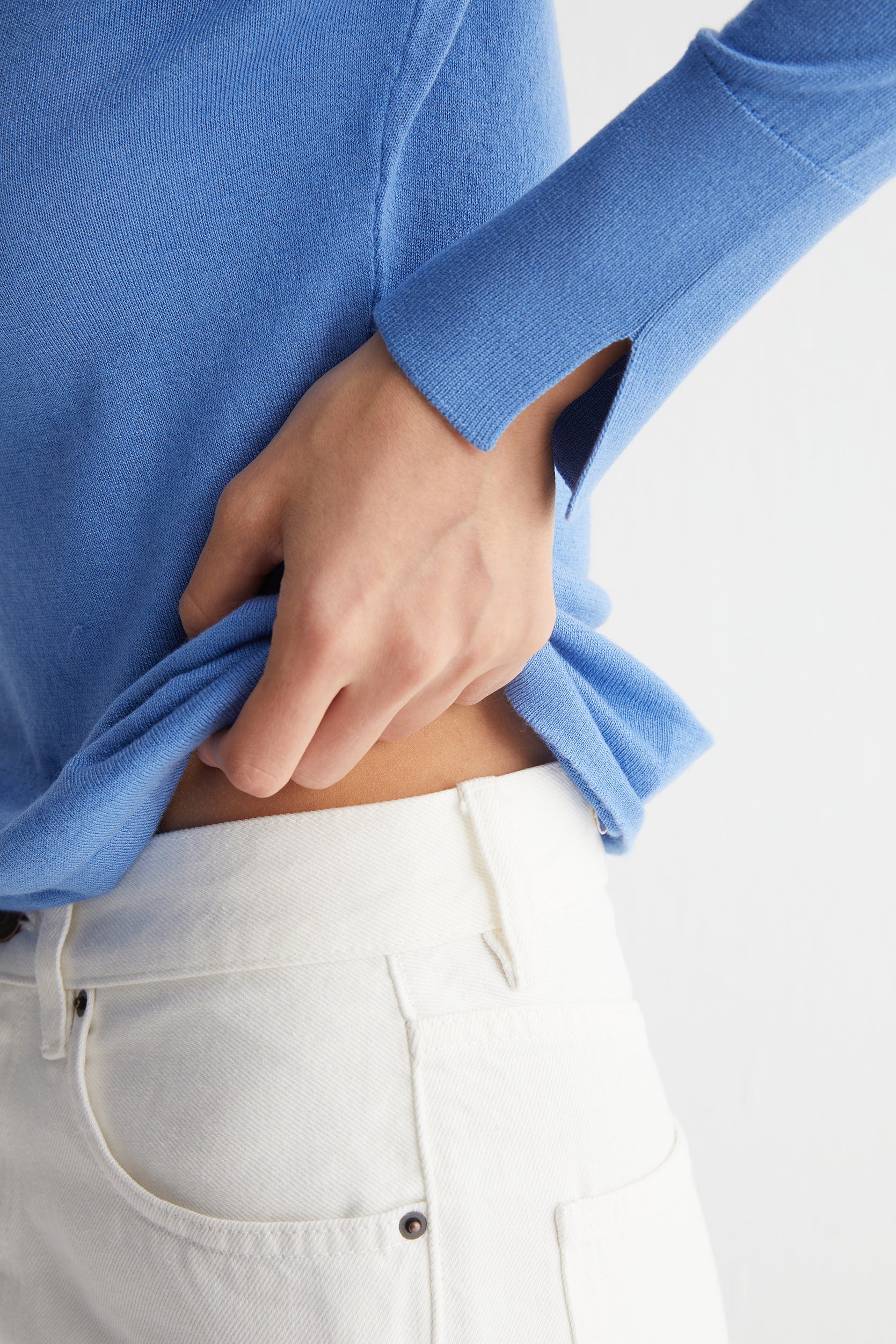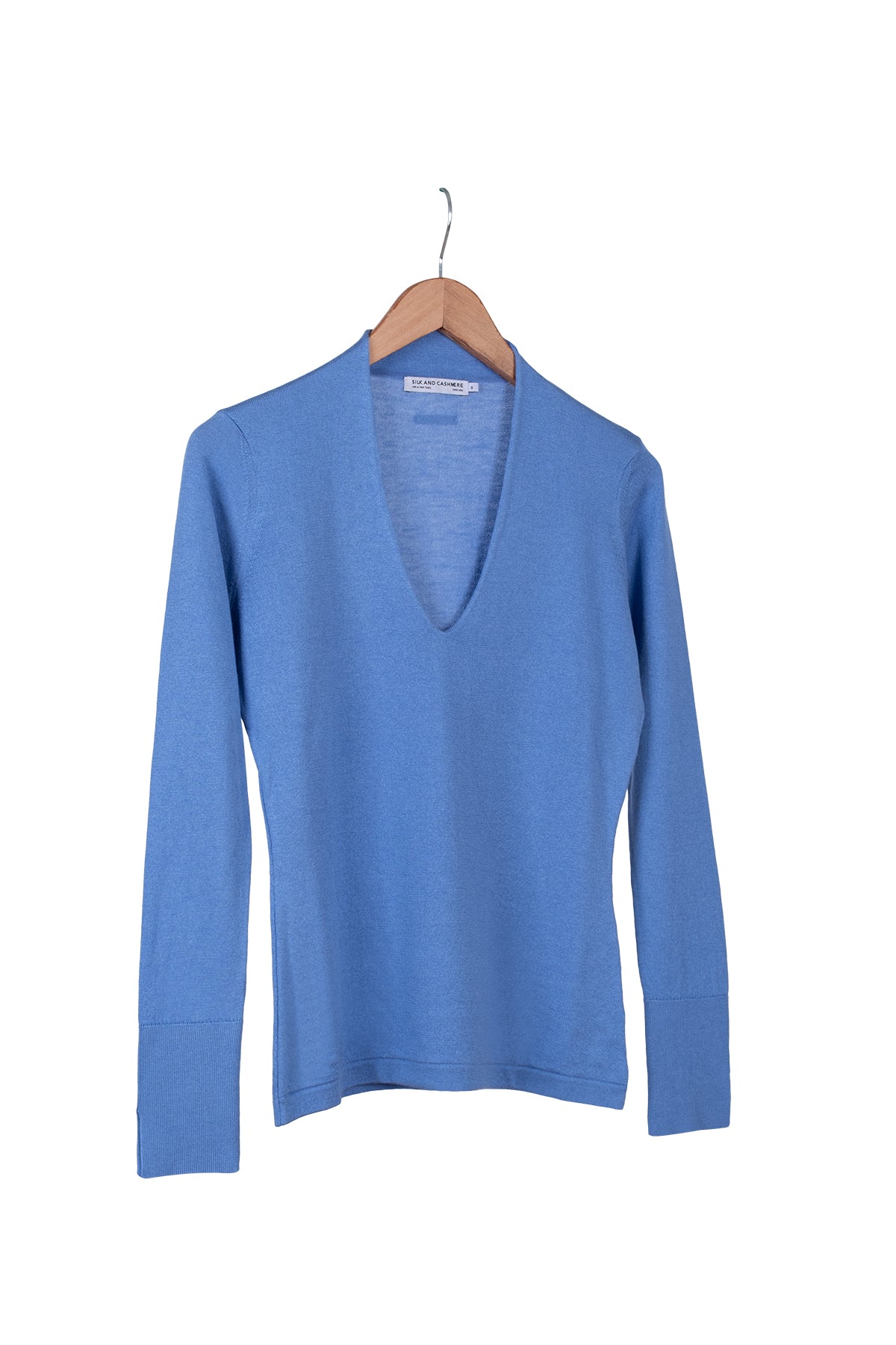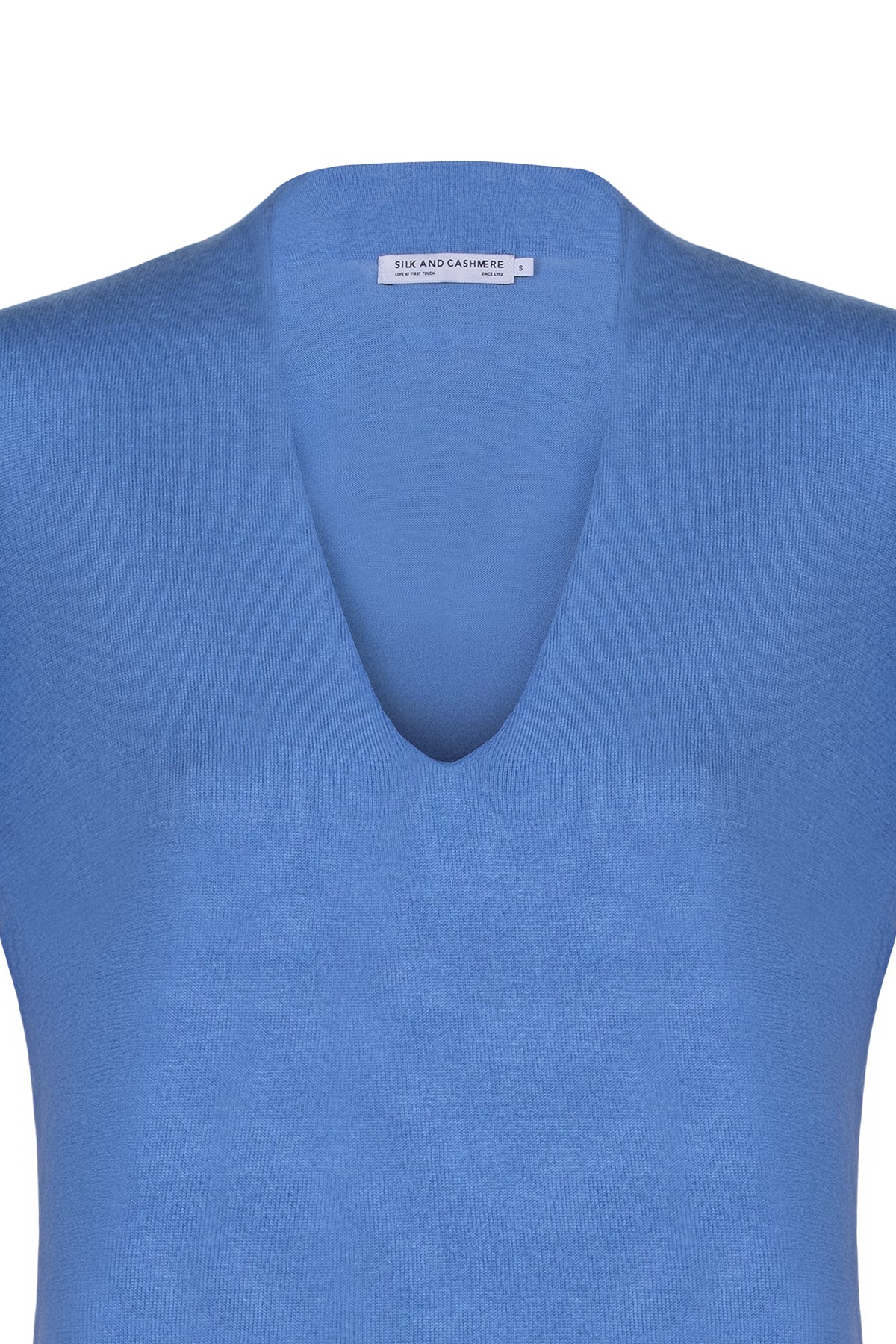 İpeğin pürüzsüz hissi ve kaşmirin sıcaklığıyla öne çıkan bu triko, hafif ve nefes alabilir dokusuyla gün boyu konfor sunar. Canlı mavi tonu ve derin V yaka kesimiyle modern bir duruş sergiler. Doğal elyaf içeriği sayesinde cildi nazikçe sararak rahat bir kullanım sağlar.