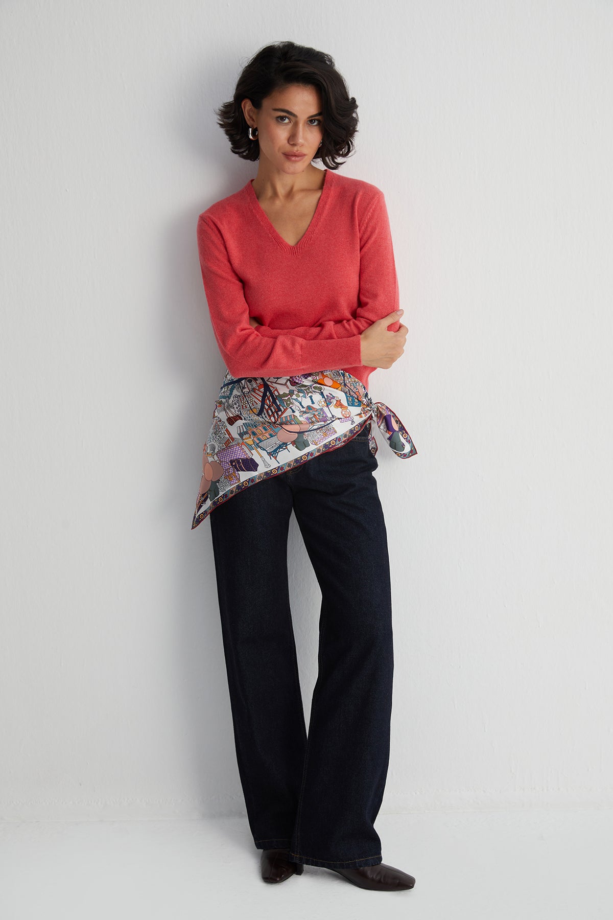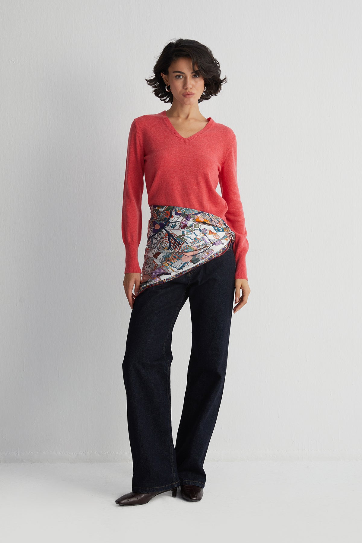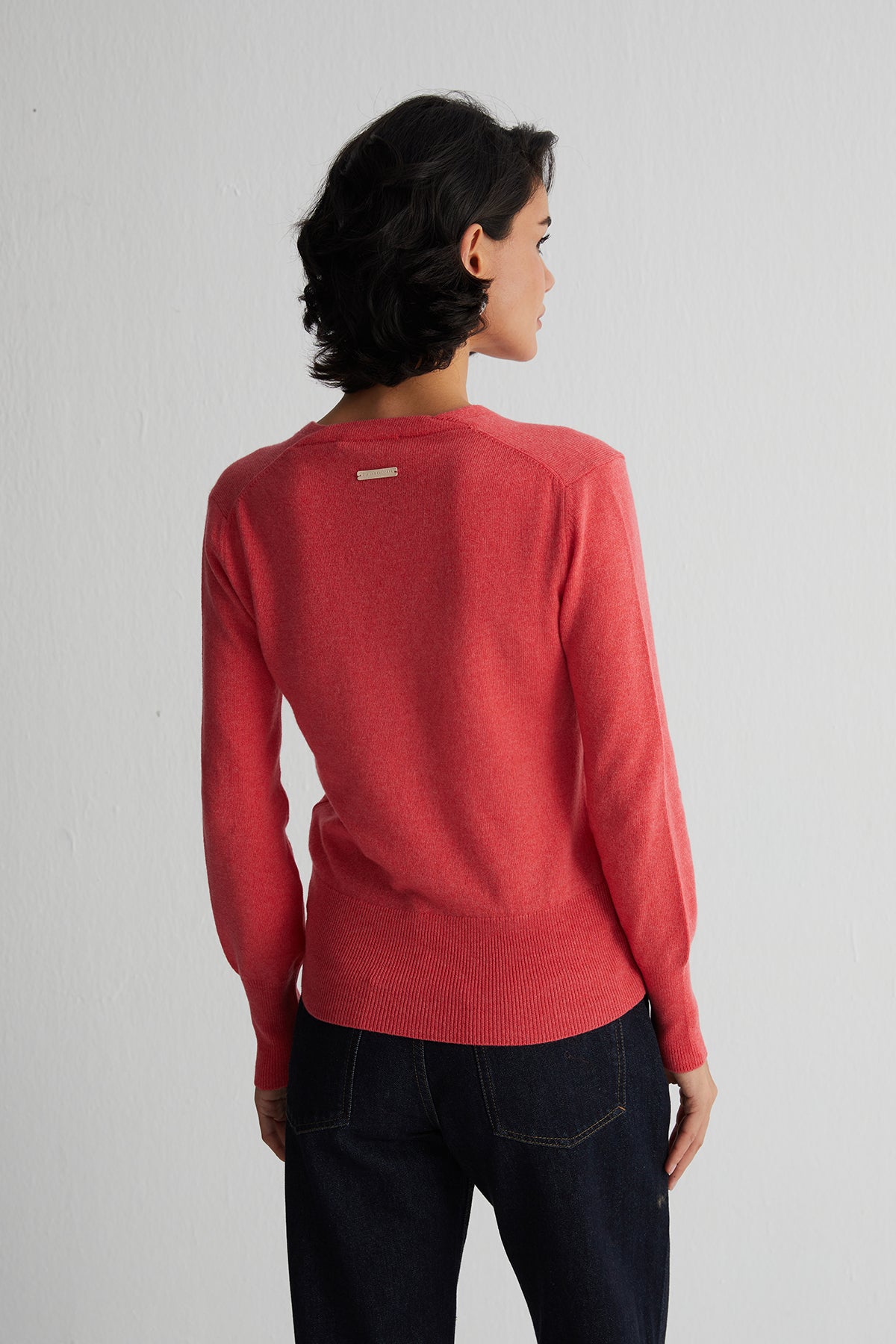 Mercan renginin enerjisiyle saf kaşmirin zarif dokusunu buluşturan bu kazak, hem rahat hem de modern bir görünüm sunar. Derin V yaka detayıyla katmanlı kombinler için ideal bir seçenek olurken, canlı tonu stilinize dinamizm katar.