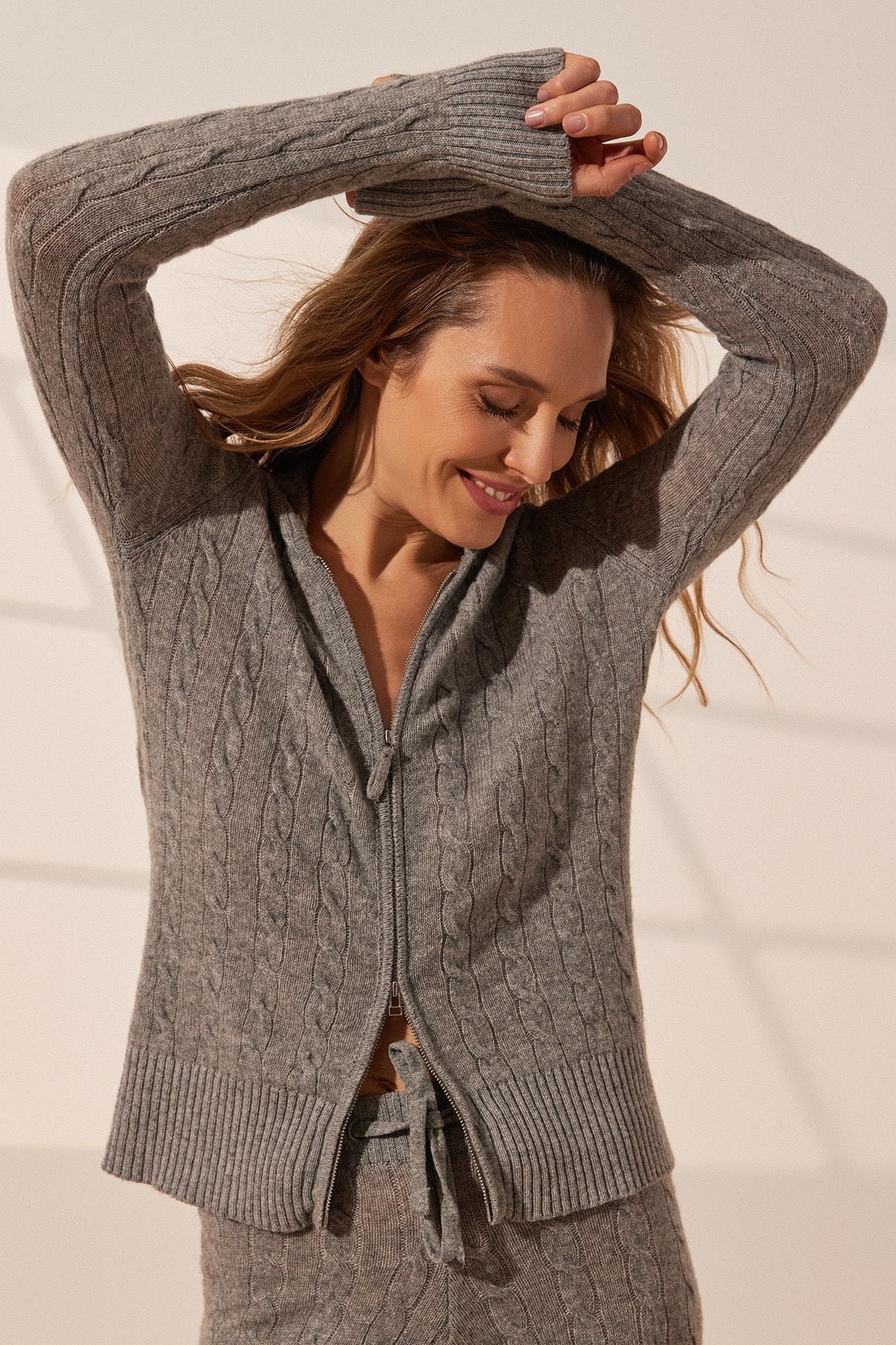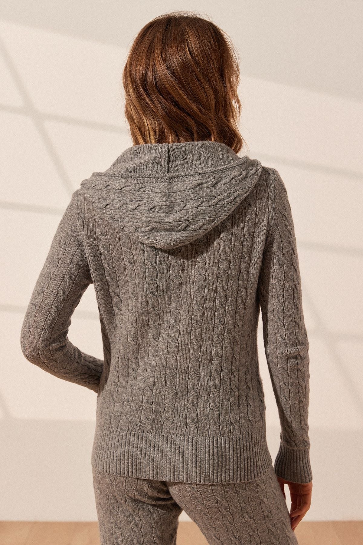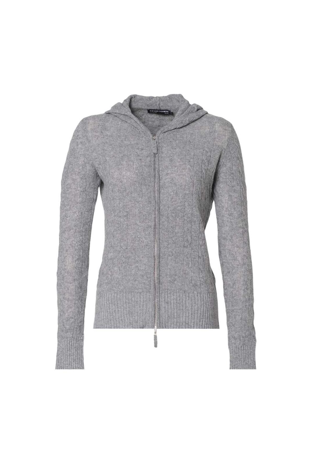 Orta Gri Melanj Amelia Avustralya Yünü Kaşmir Saç Örgülü Uzun Kollu Kadın Kapüşonlu Hırka