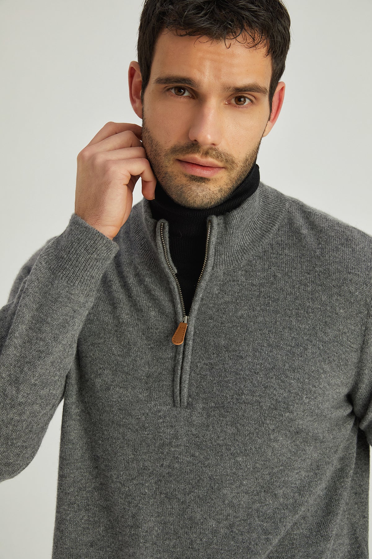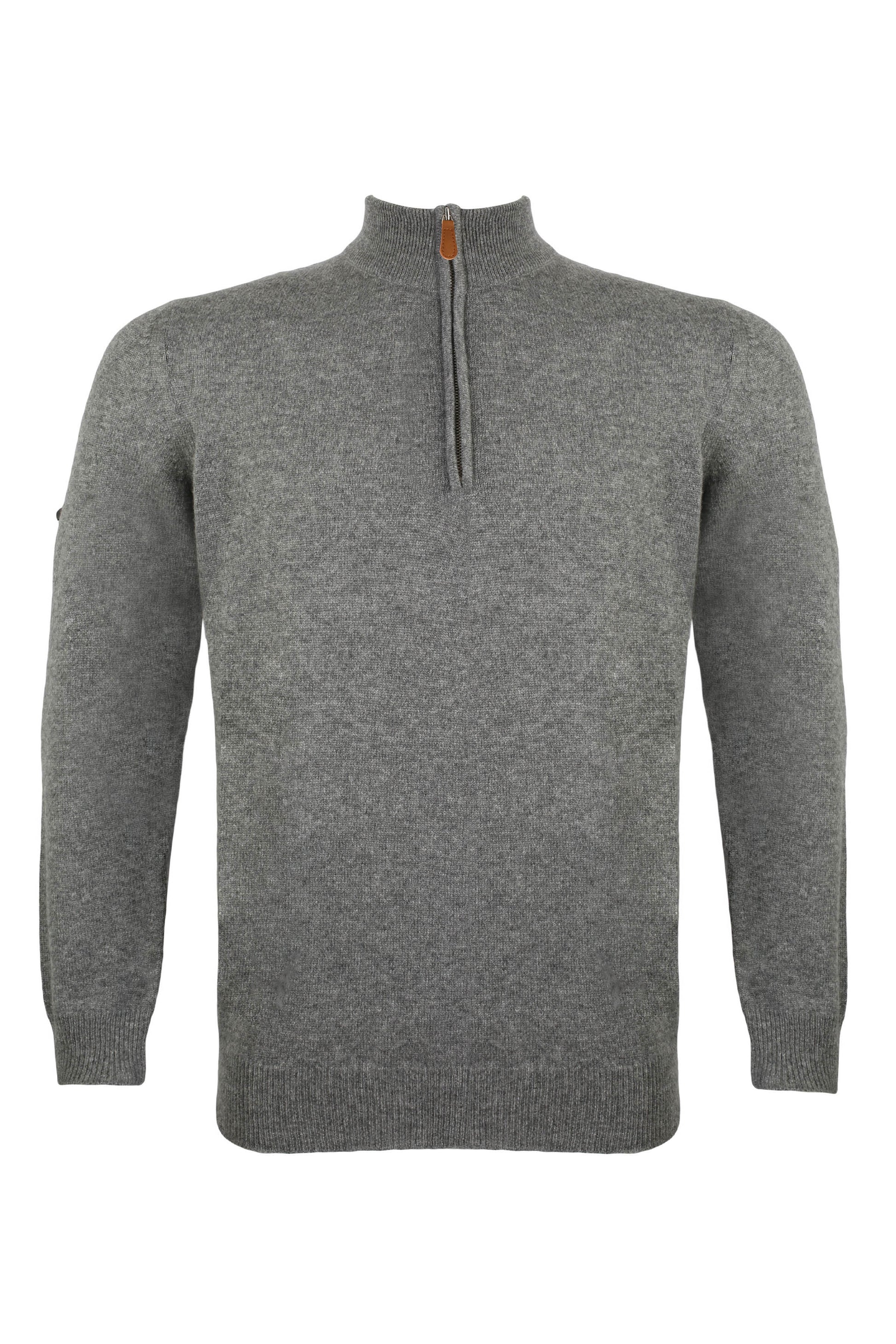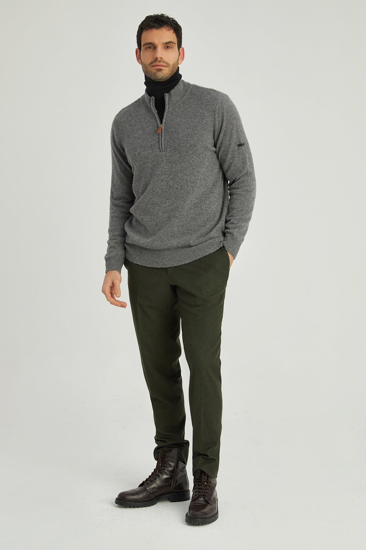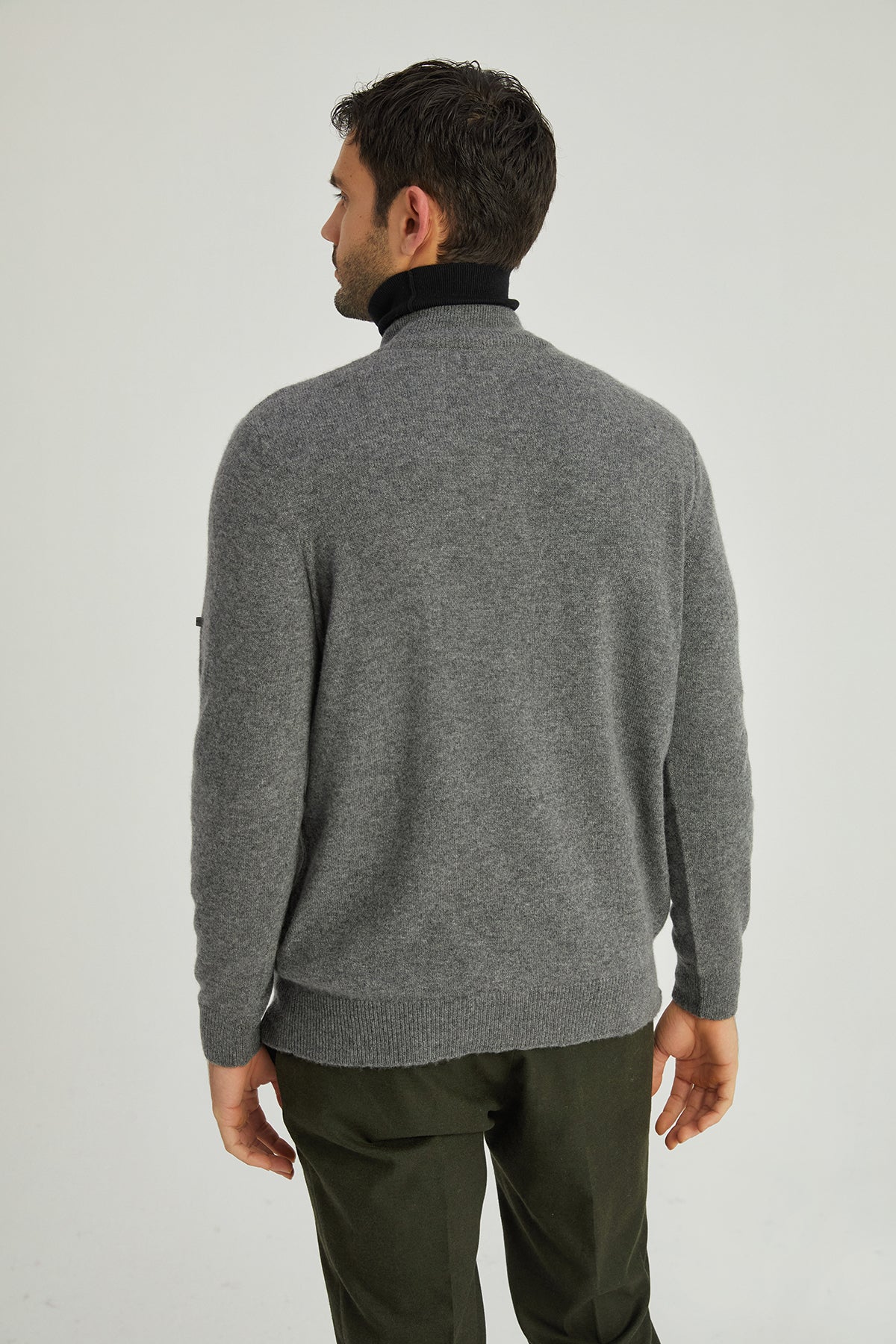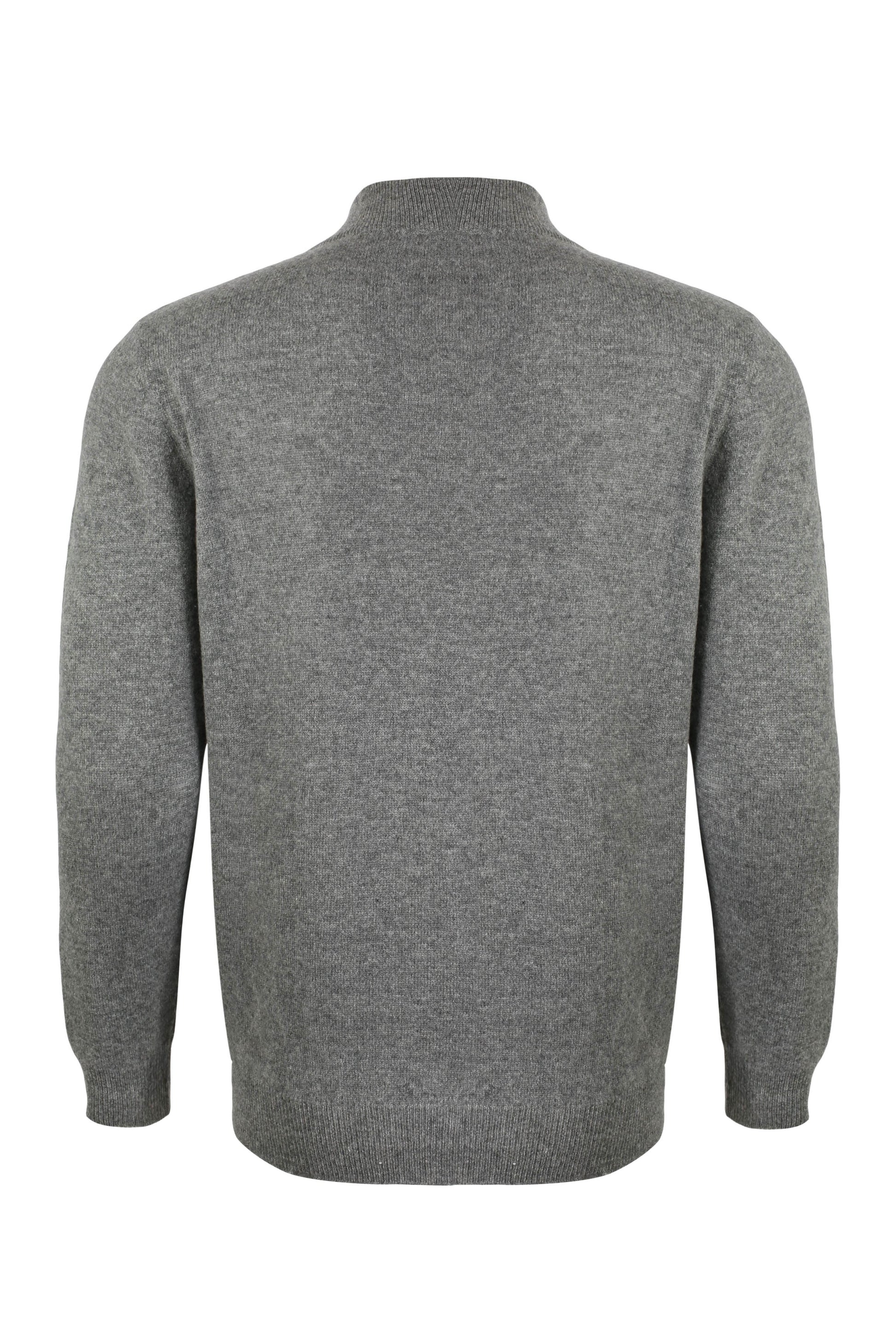 Orta Gri Melanj Saf Kaşmir Yüksek Yaka Fermuarlı Erkek Kazak