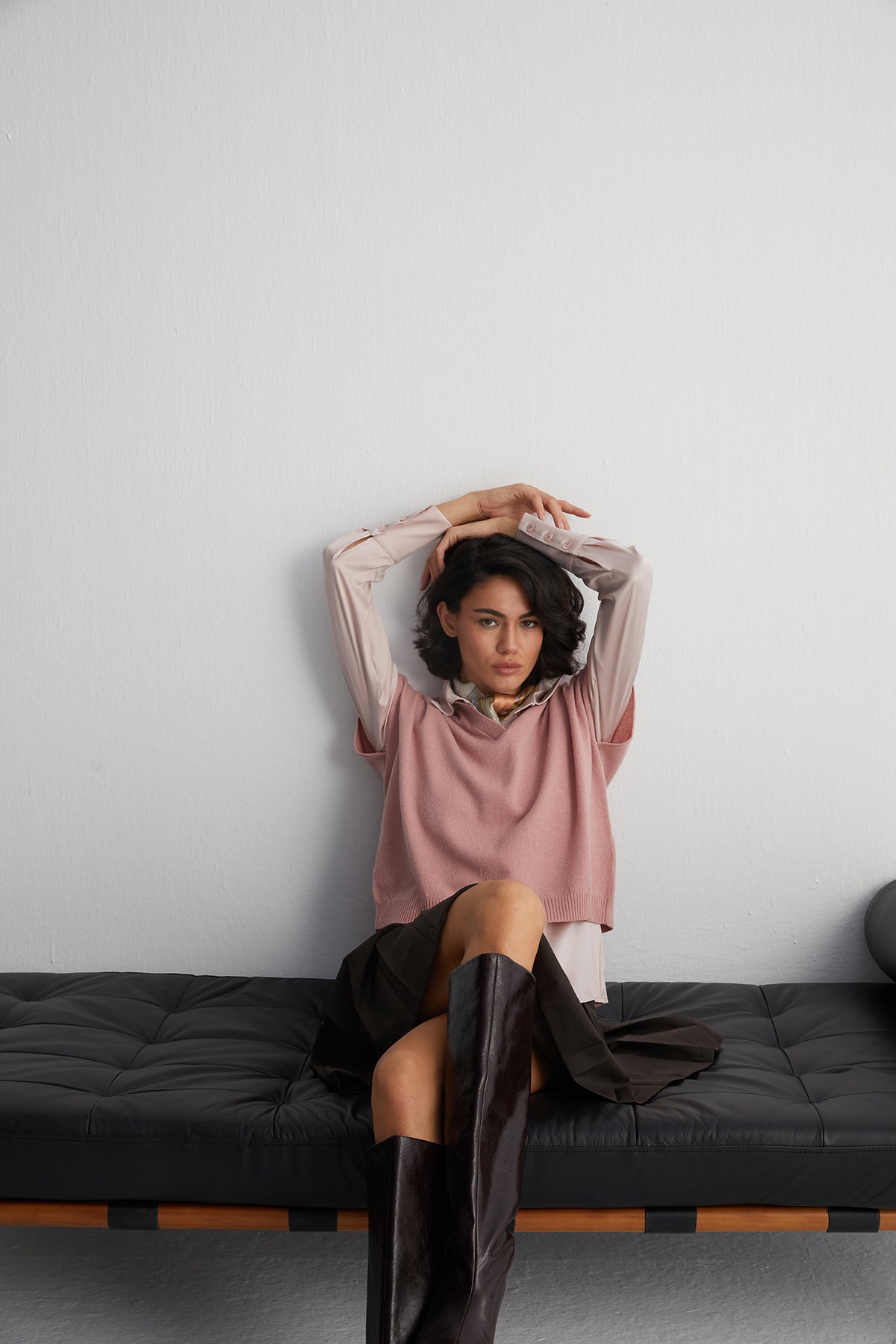 Zarif geçiş tonlarıyla pastel pembeye bürünen saf kaşmir kısa kollu polo, dokunuşunuzla anlam kazanan yumuşaklıkta. Vanessa modeli, doğrudan teninize değen saf kaşmirin hafifliğini, zamansız bir kesimle buluşturur. Her detayı, gündelik rahatlıkla seçkin görünüm arasında zarif bir köprü kurar.