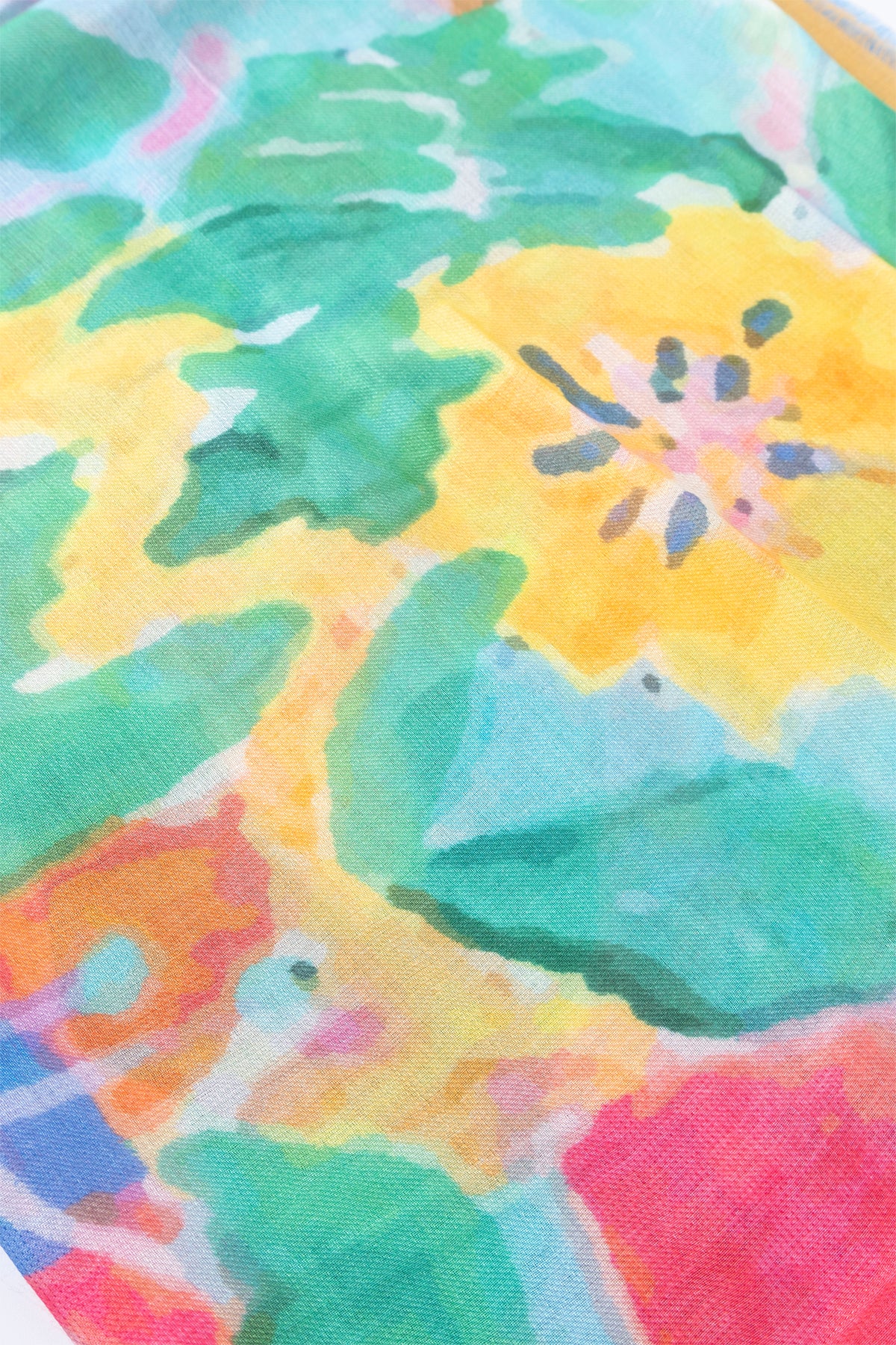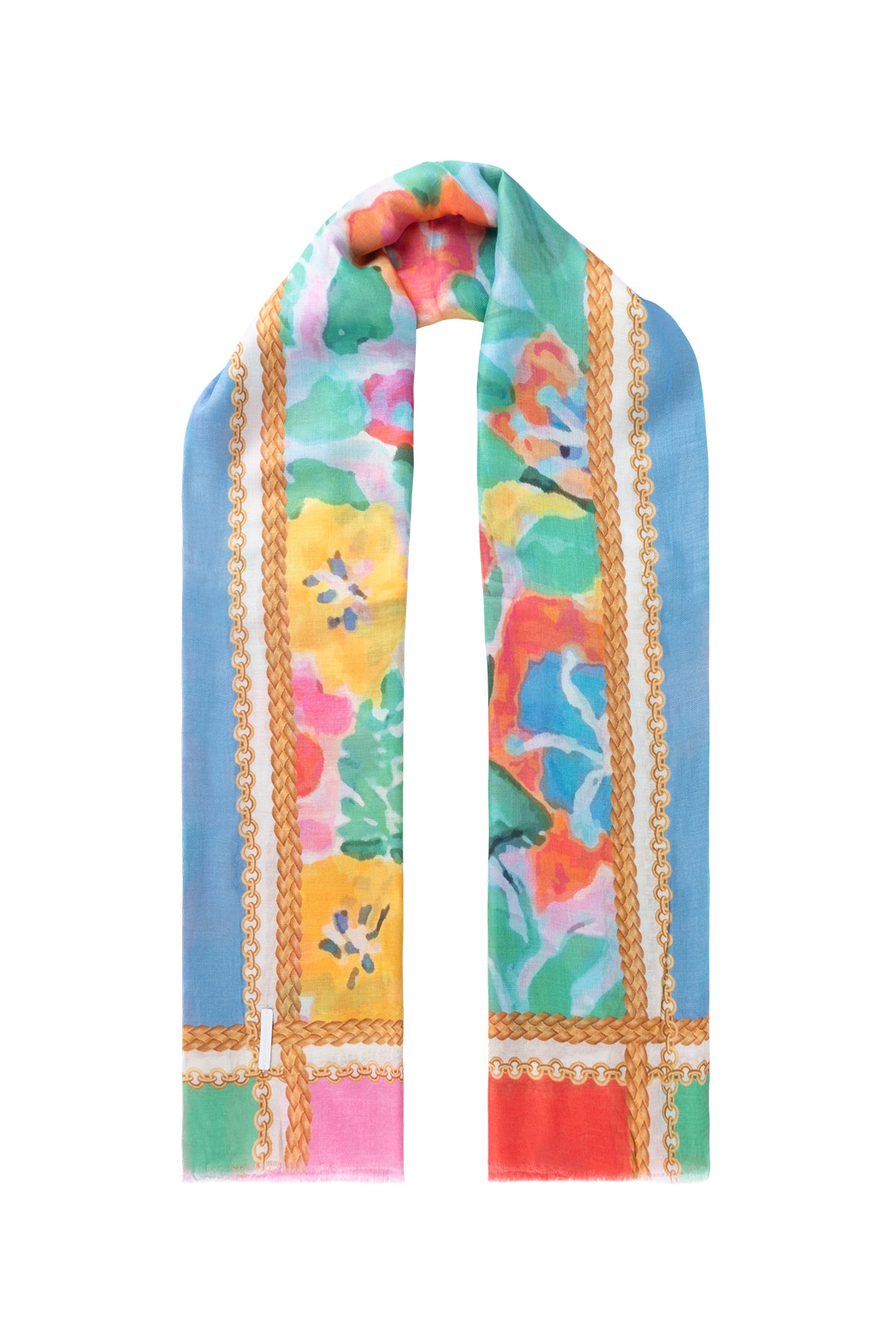 Yumuşacık modal ve ipeğin doğal dokusuyla tasarlanan bu şal, baharın canlı tonlarından ilham alan çiçek desenleri ve zarif zincir detaylarıyla her kombininize taze bir hava katıyor. Renklerin su gibi geçiş yaptığı desenler, zarif ve canlı bir görünüm sağlıyor. Kare formuyla çeşitli şekillerde bağlanarak rahatlıkla kullanılabilir; ister omzunuza atarak zarif bir aksesuar olarak, ister boynunuza sararak günlük kombinlerinizi tamamlayabilirsiniz.