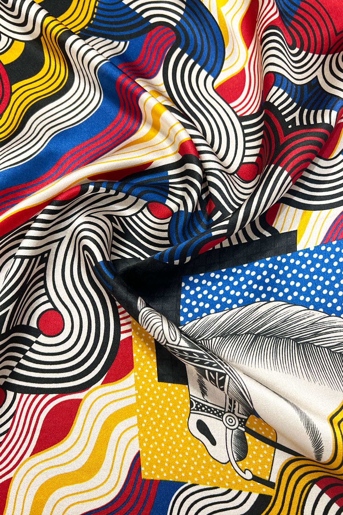 Renkli Laila Saf İpek Roma Küçük Eşarp, göz alıcı bir renk paleti ve dinamik desenlerle tasarlanmıştır. Bu eşarp, modern sanatın cesur çizgilerini ve renklerini, klasik bir at figürü ile harmanlayarak benzersiz bir estetik sunar. Her bir renk ve desen, ipek kumaşın lüks dokusu üzerinde canlılıkla parlar, bu da eşarba sofistike ve çağdaş bir hava katar.