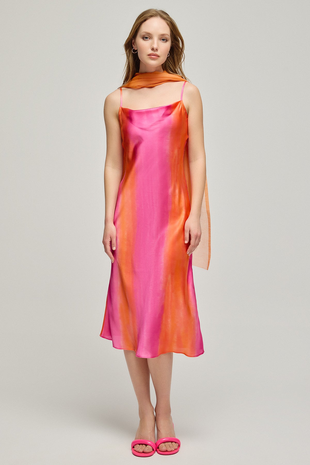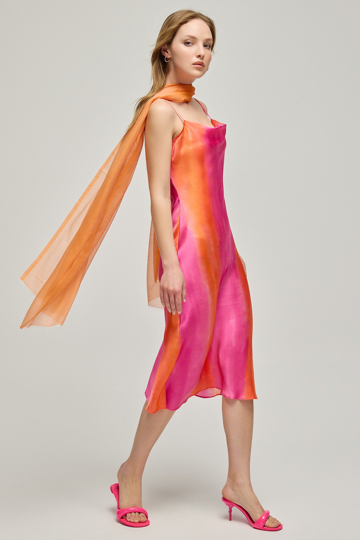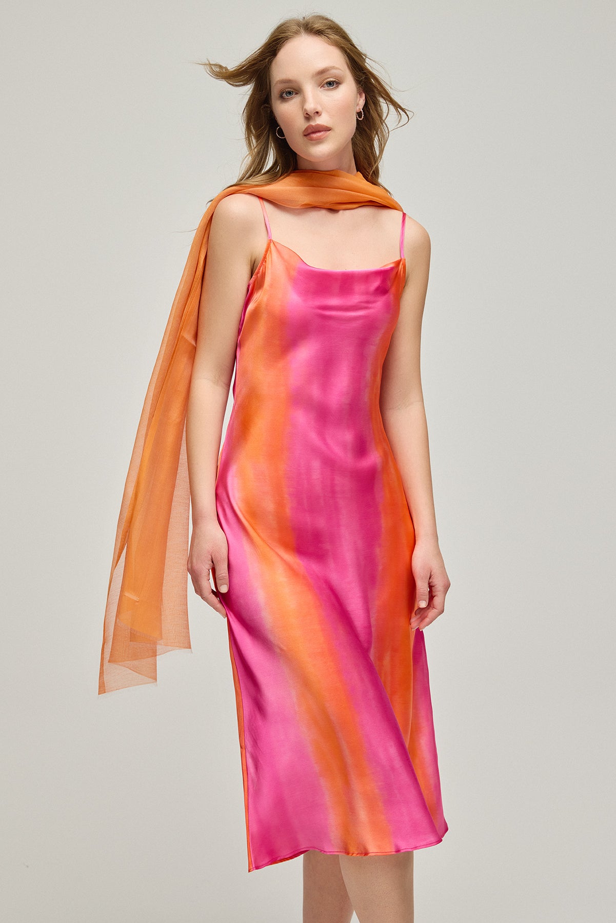 Işıl ışıl bir güneş batımını anımsatan, %100 ipekten üretilmiş bu elbise, yaz akşamlarınıza şıklık katmak için birebir. İpeğin verdiği doğal parlaklık ve yumuşak dokunuşu, size gün boyu süren konfor ve zarafet sunuyor. Renk geçişlerinin cesur ve estetik uyumuyla her adımınızda göz kamaştırın.