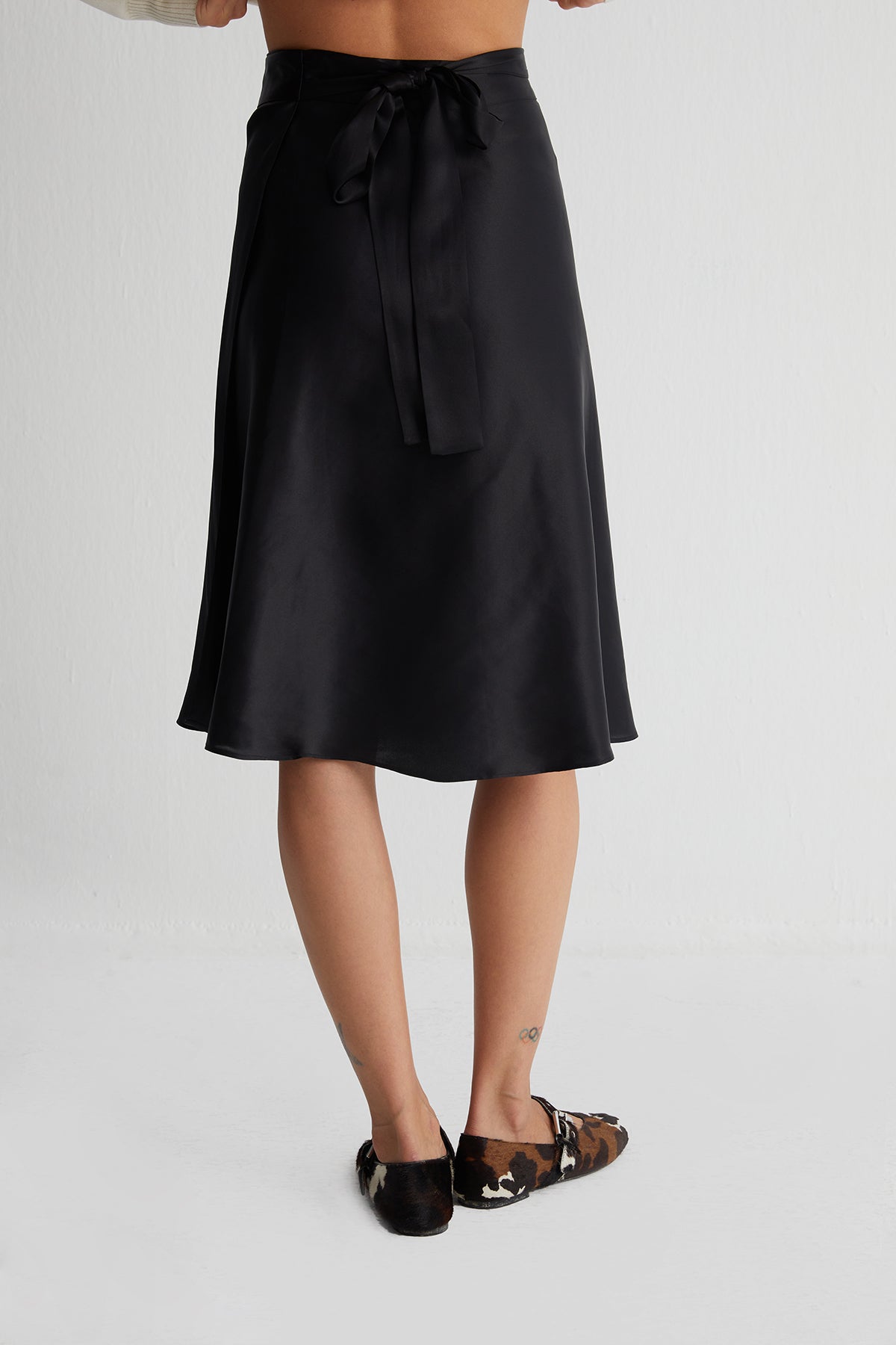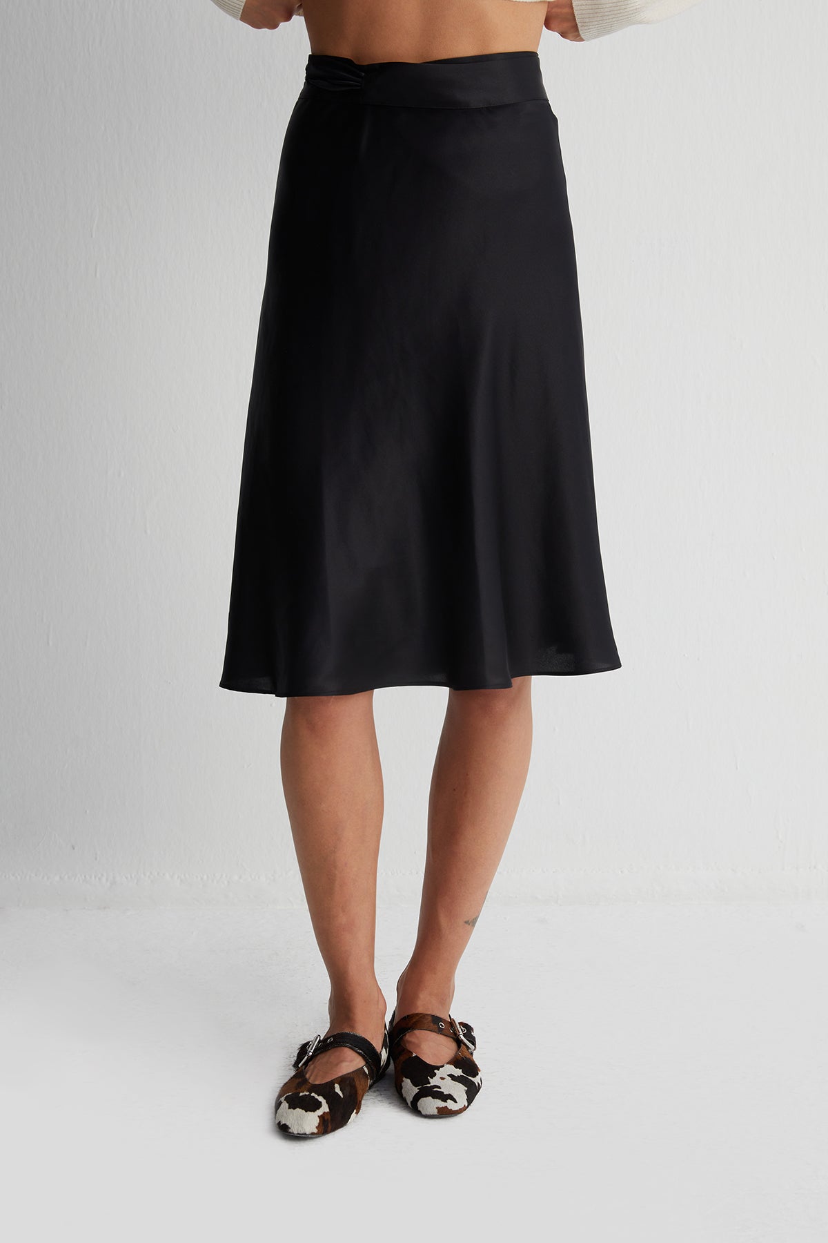 Zamansız tasarımı ve ipeğin kusursuz akışkanlığıyla bu etek, hareket ettikçe farklı bir zarafet kazanır. Bel kısmındaki bağlama detayı, siluete incelik katar. Günlük kombinlerden davetlere uzanan çok yönlülüğü ile gardırobunuzun en özel parçalarından biri olmaya adaydır.