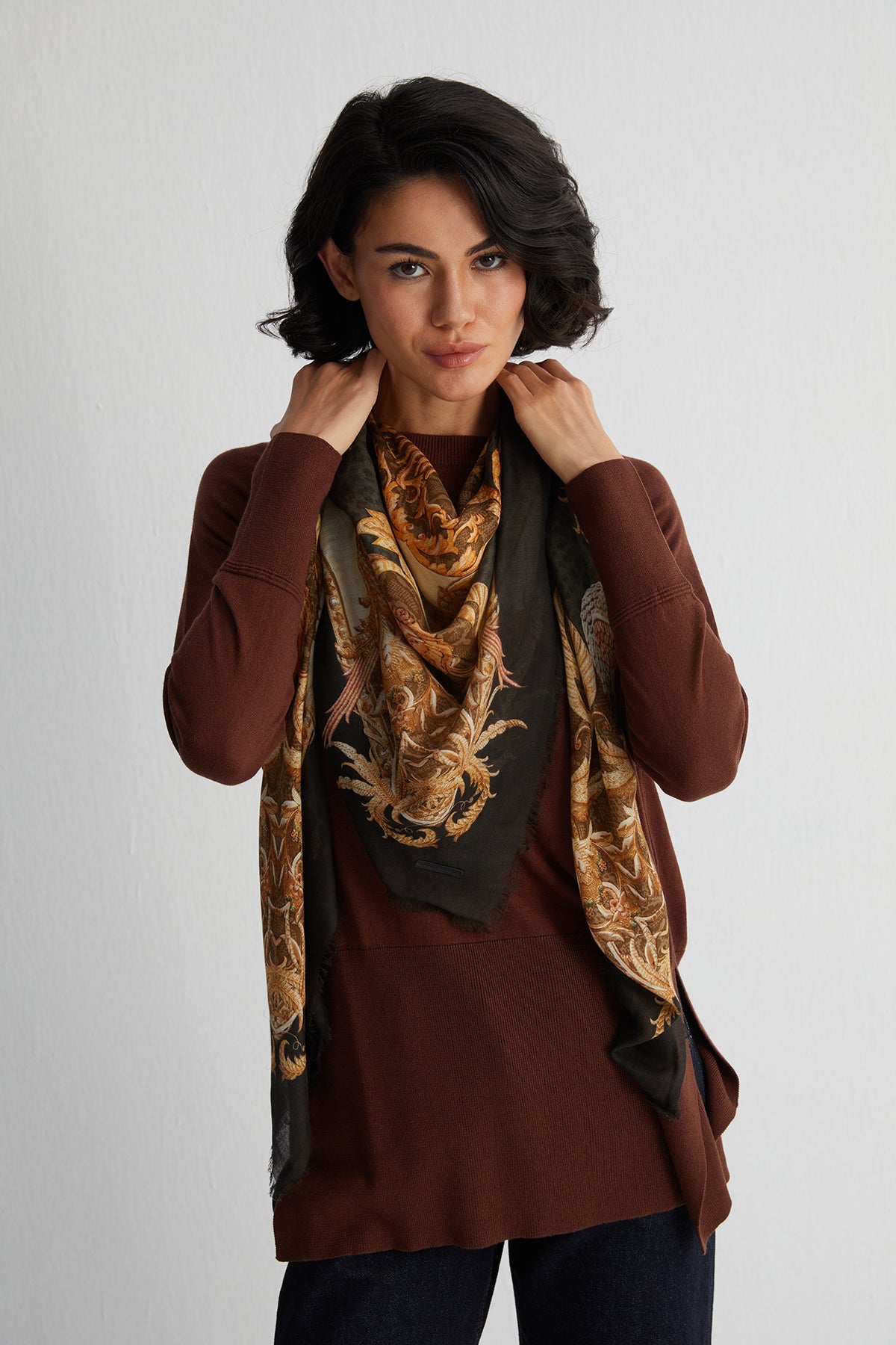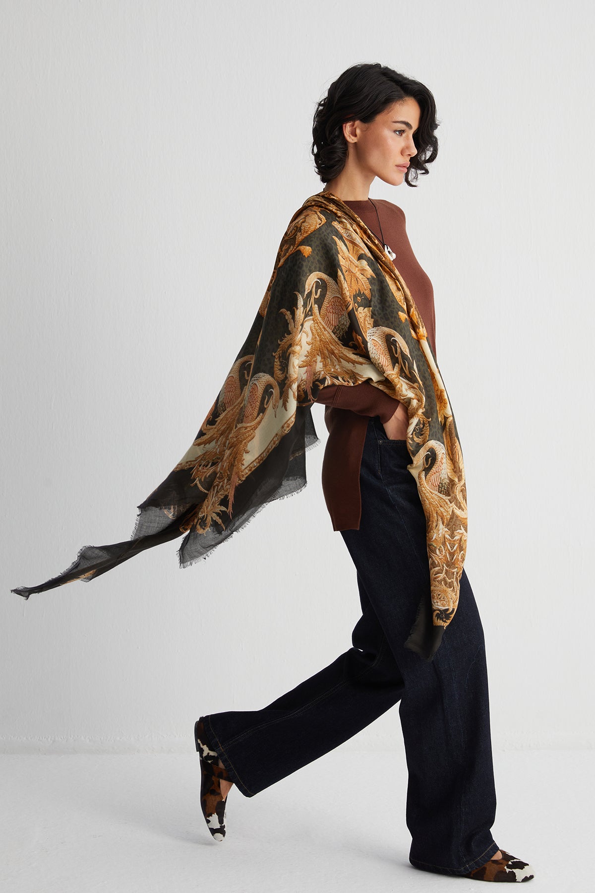 Kare formlu bu şal, klasik Jas desenlerinin zengin detaylarını ipek dokunuşuyla buluşturur. Doğal liflerle hazırlanan kumaşı sayesinde gün boyu rahatlık sunarken, her bağlama stilinde farklı bir duruş sergiler. Hem gündelik kombinlere hem özel günlerdeki tercihlere kolayca uyum sağlar.