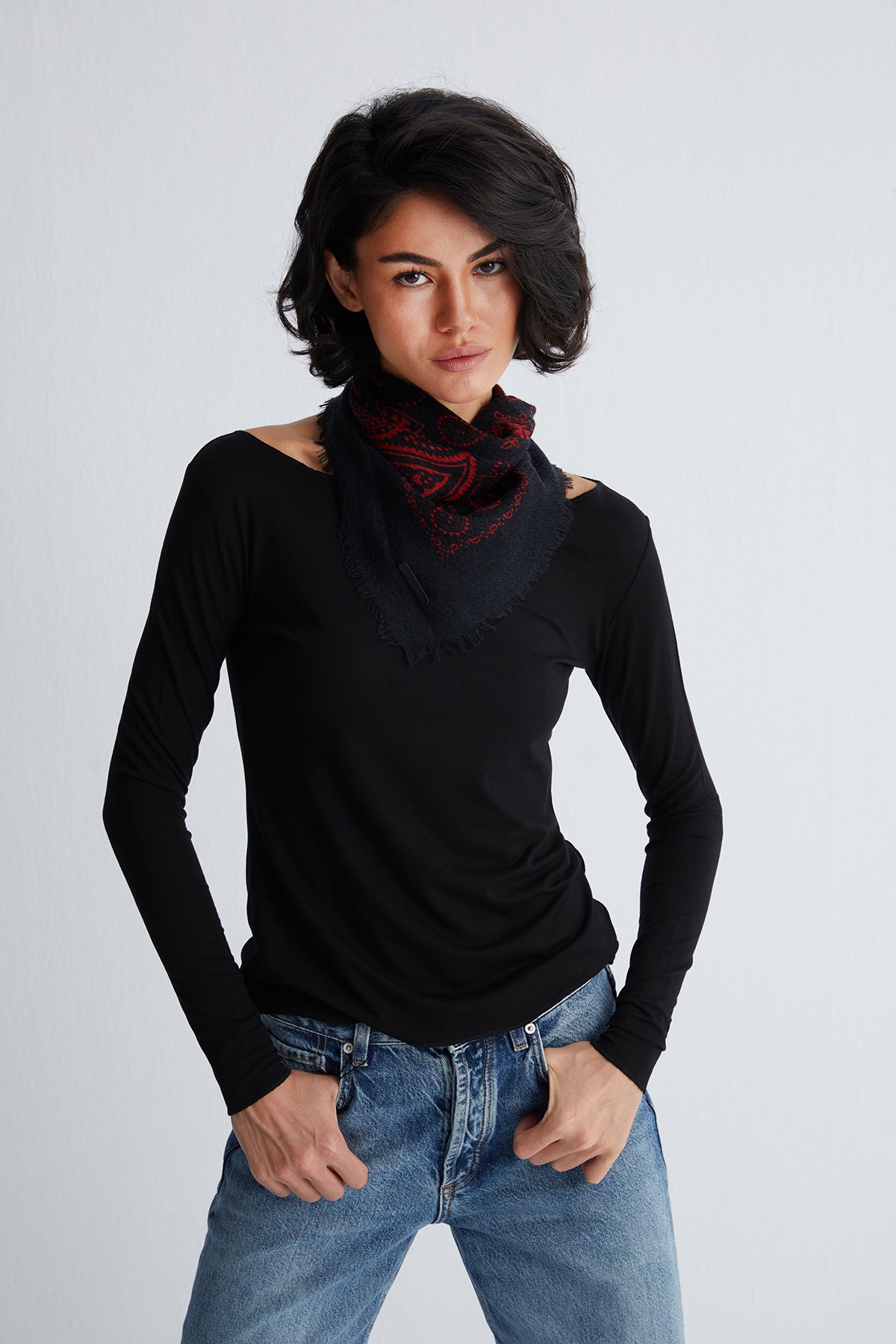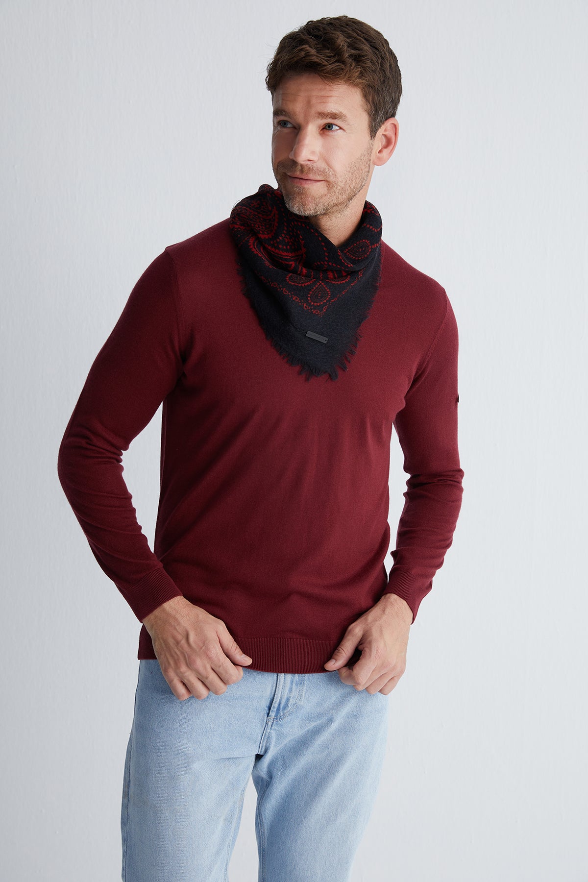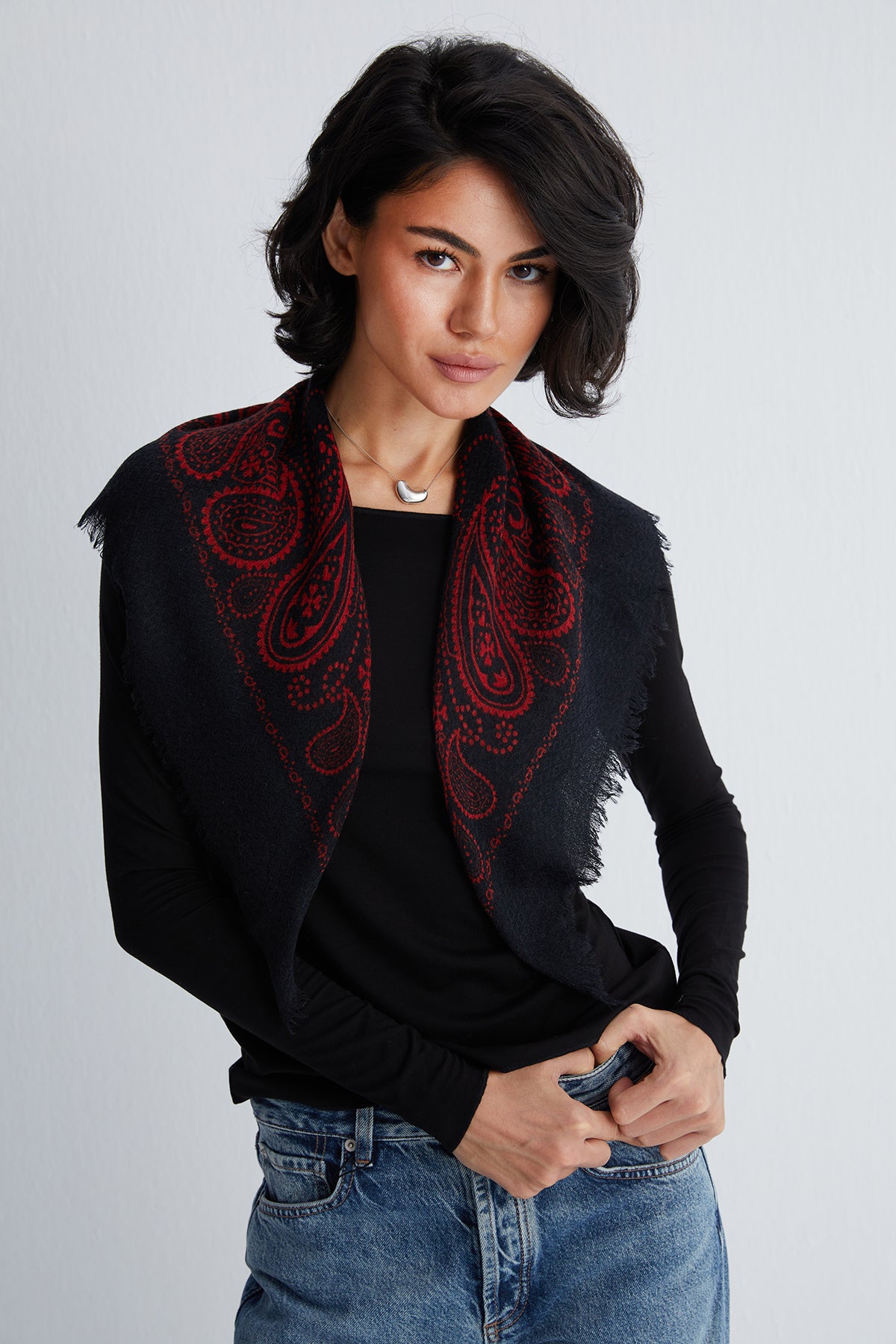 Zamansız jas desenlerini modern kare formda sunan bu şal, gün boyu kullanım için ideal bir parça. Yün ve ipek karışımı dokusuyla hem yumuşak hem de dayanıklı olan tasarım, sade kombinlerin dahi karakterini tamamlamayı başarıyor.