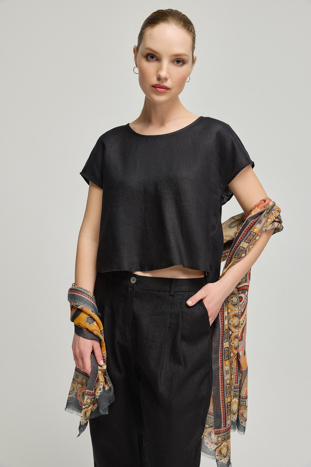 Zamansız siyahı ve ketenin serinletici dokunuşunu bir arada yaşamak için Siyah Keten Kate Bluz'u keşfedin. Gardırobunuzun temel taşlarından biri olacak bu parçayı şimdi sepetinize ekleyin.