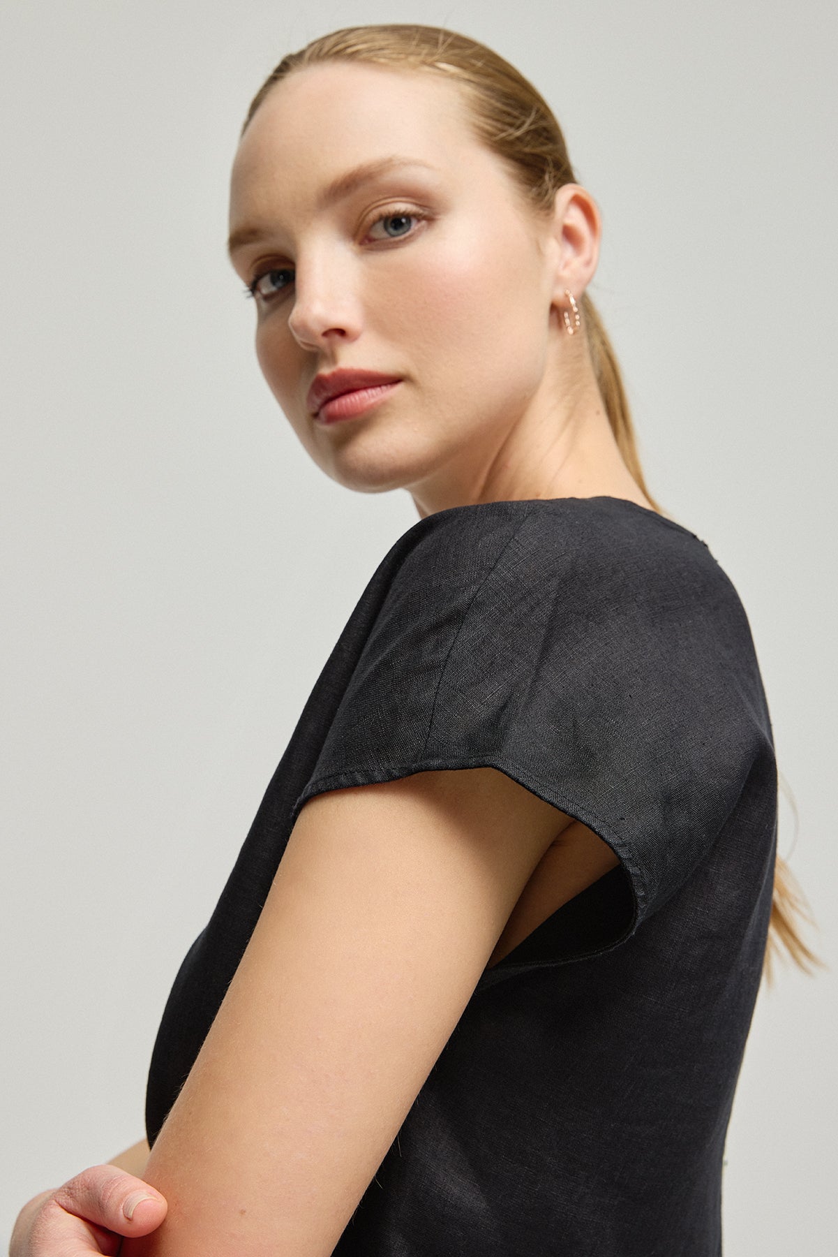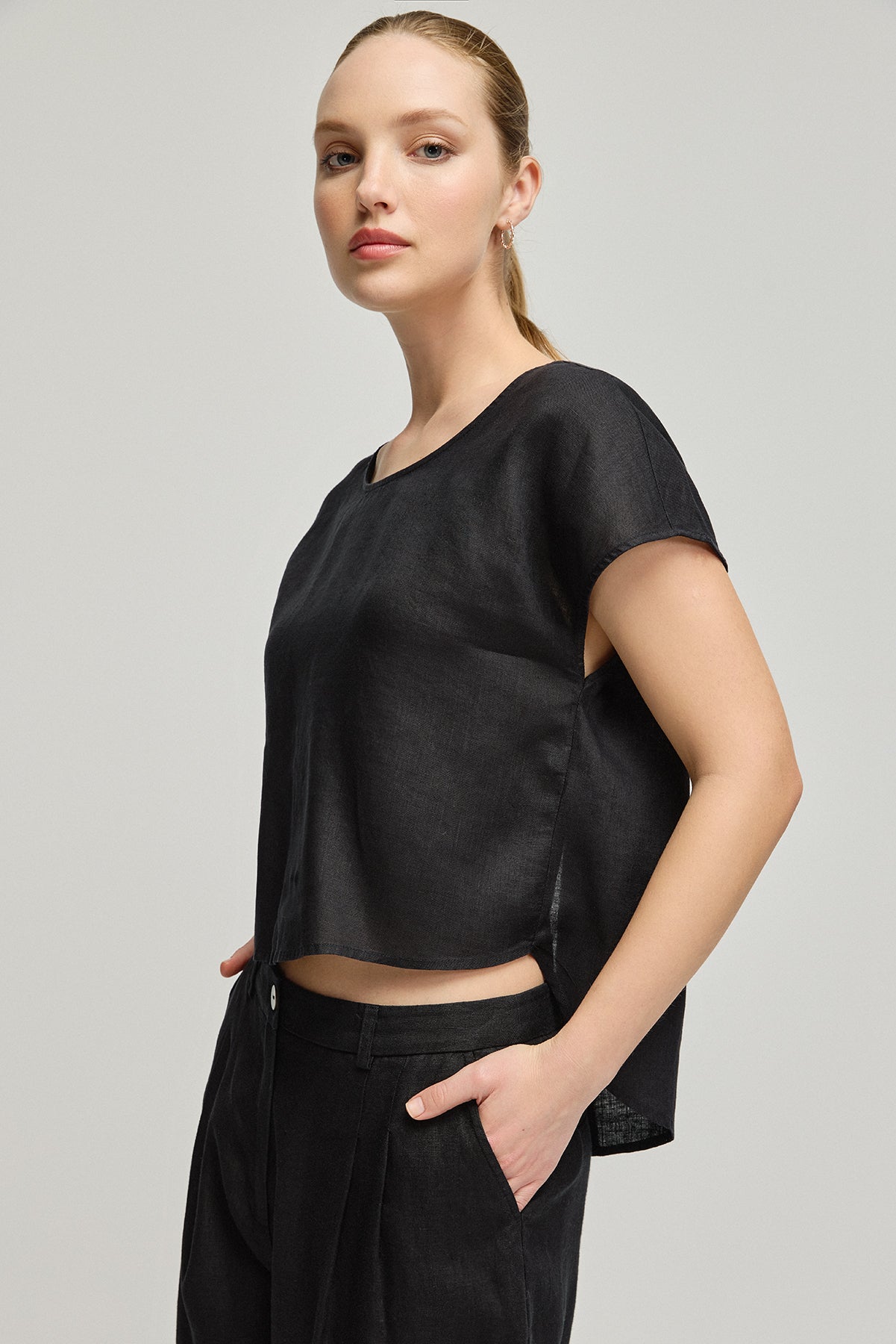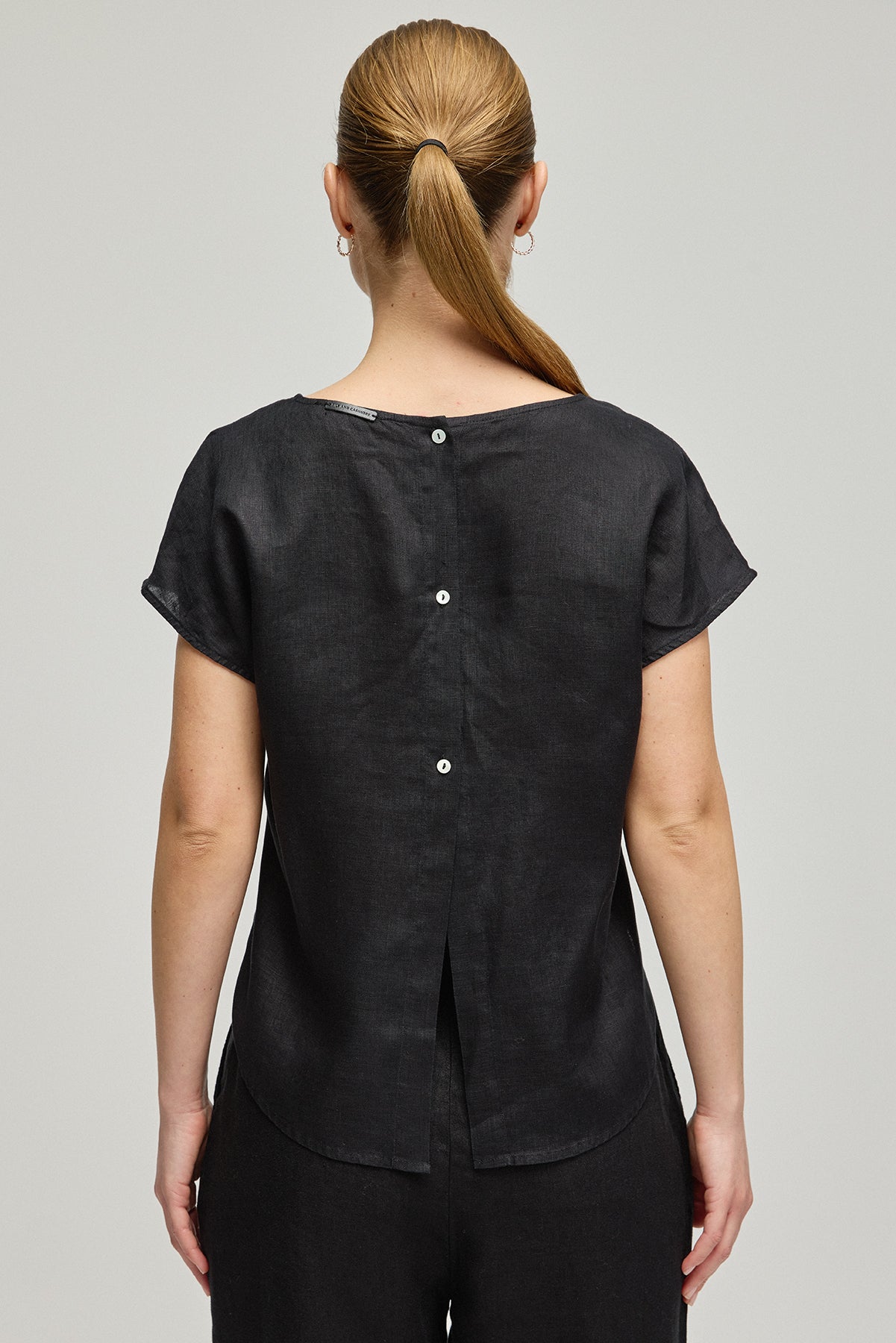 Siyah Keten Kate Yuvarlak Yaka Kısa Kollu Bluz