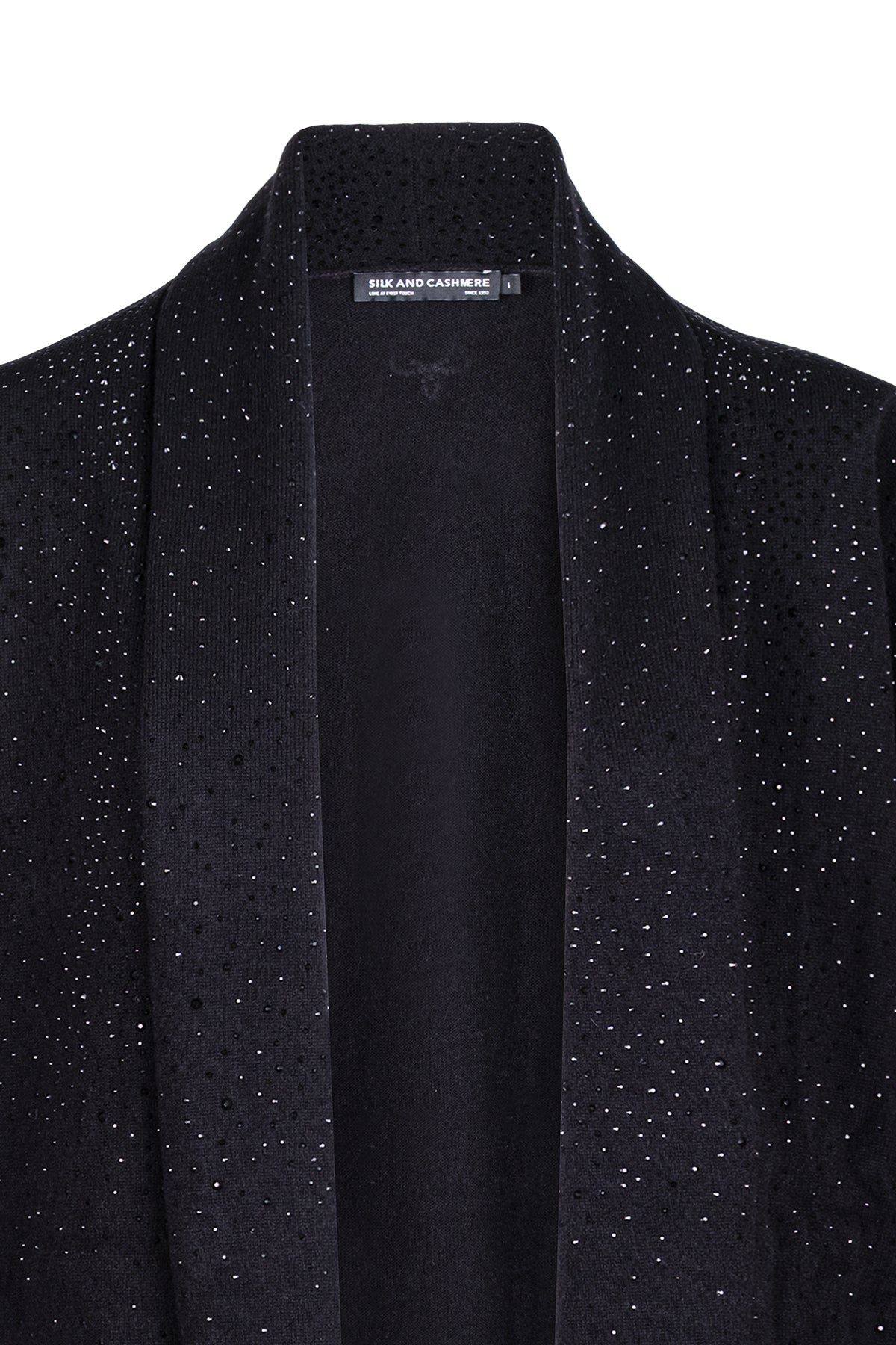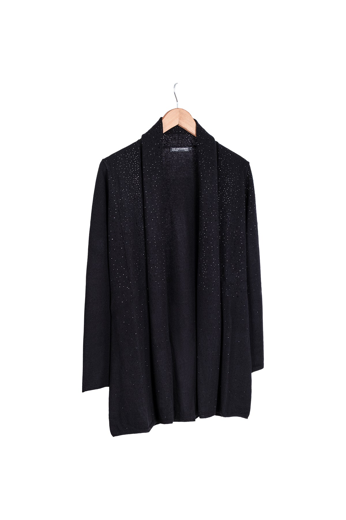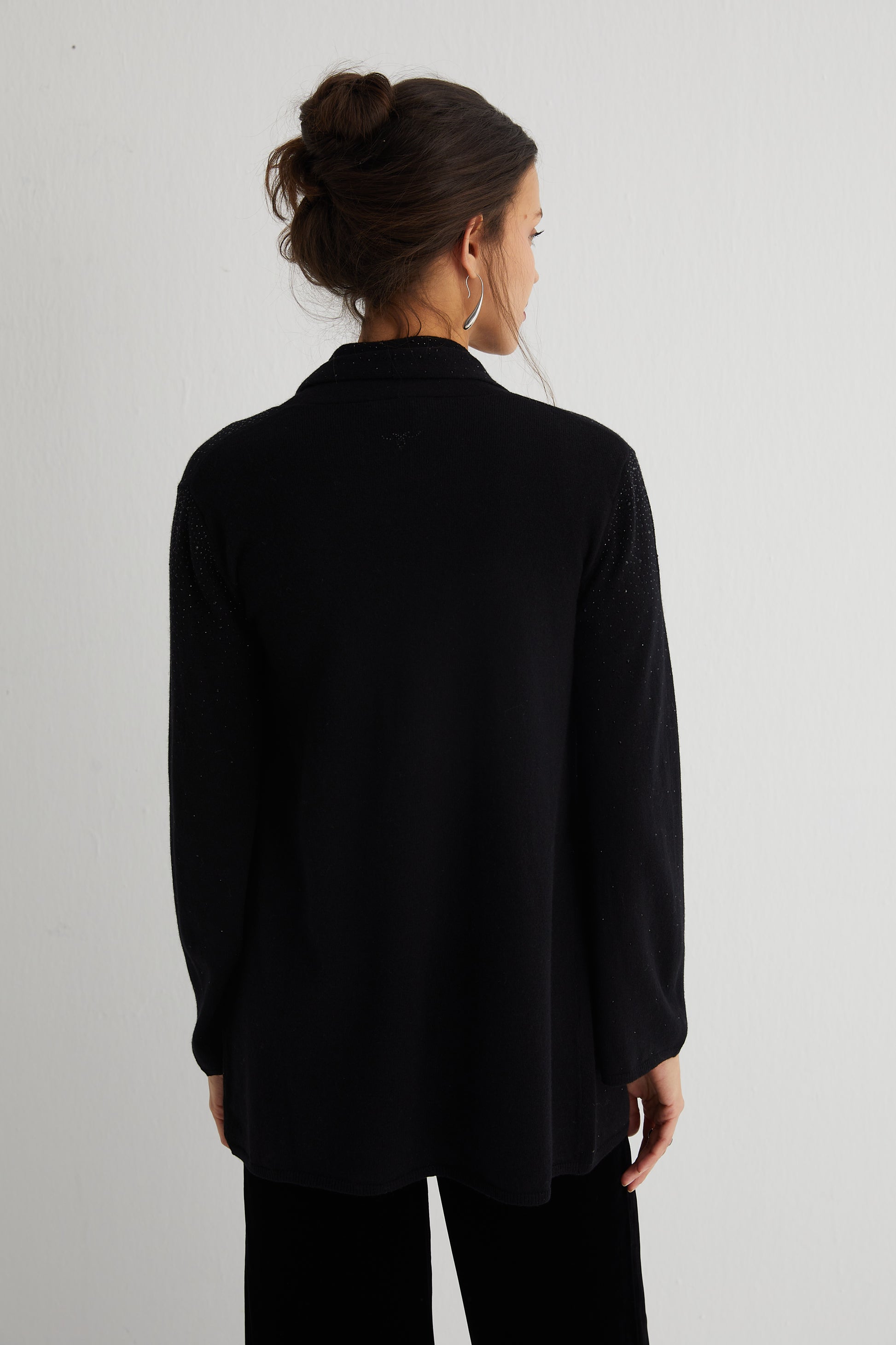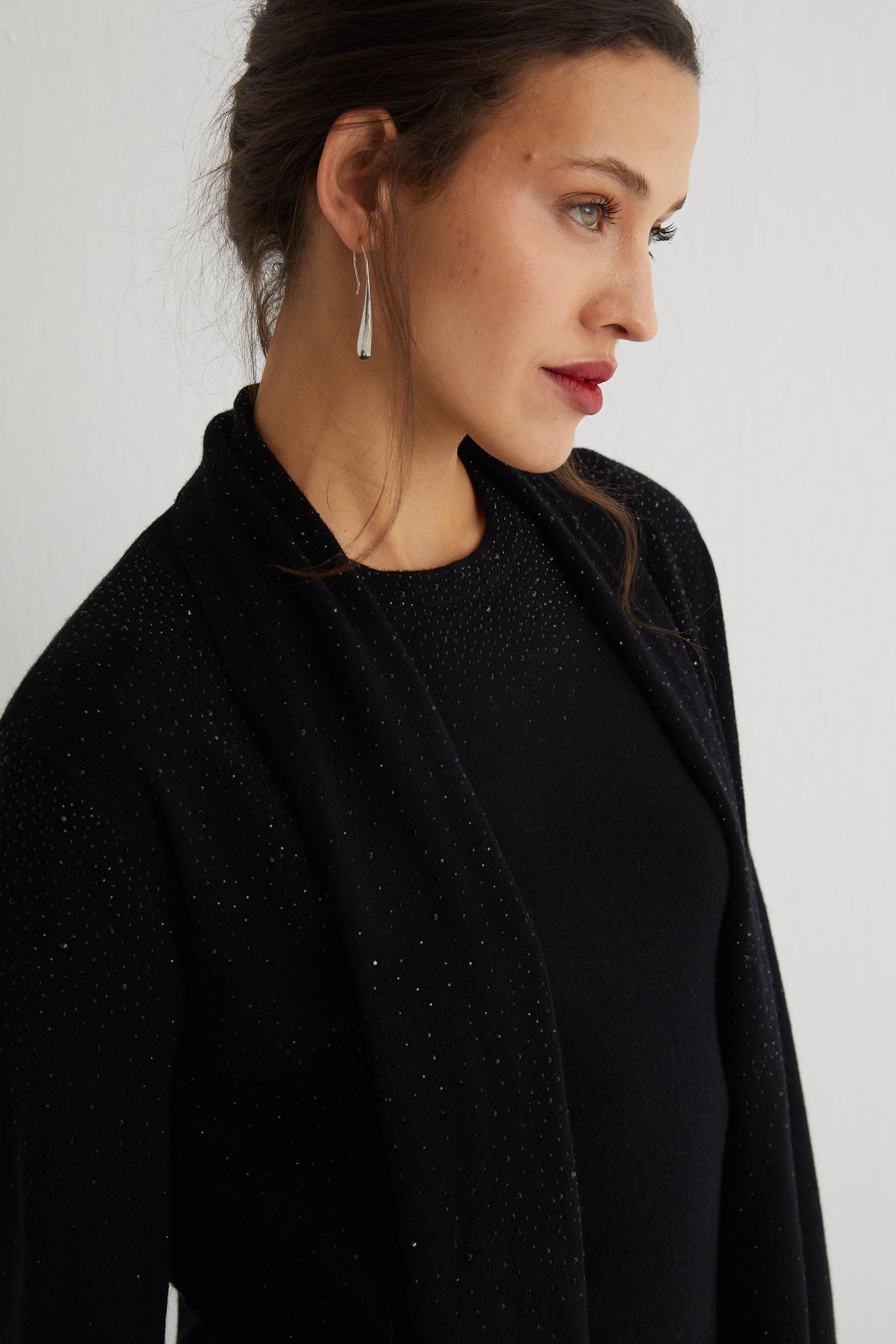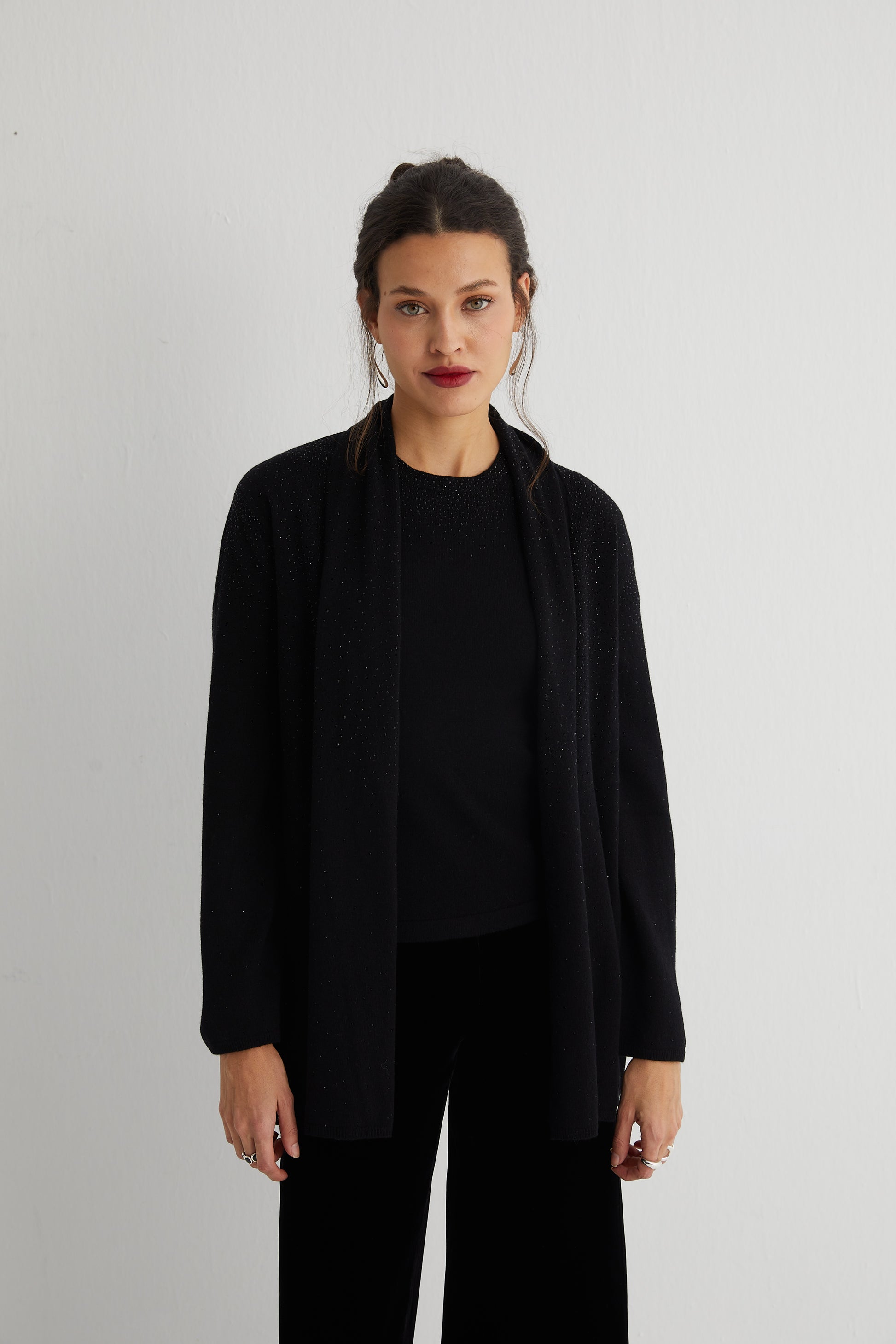 Geceyle yıldızların buluşma anını andıran bu taşlı şal yaka hırka, kaşmirin ve yünün kusursuz uyumuyla buluşuyor. Yumuşak dokusu ve zarif ışıltısıyla, gün boyu üzerinizde hafif bir zarafet hissi bırakır.