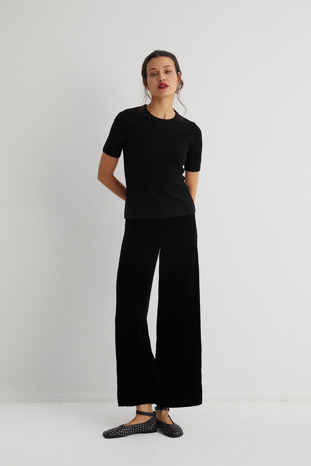 Zamansız bir silueti, ince işçilikle buluşturan Merill kısa kollu triko, doğal yün ve kaşmirin yumuşaklığıyla her dokunuşta hissedilen bir konfor sunar. Omuzlara doğru serpiştirilen taş detaylar, sade formuna ışıkla hareket katar.