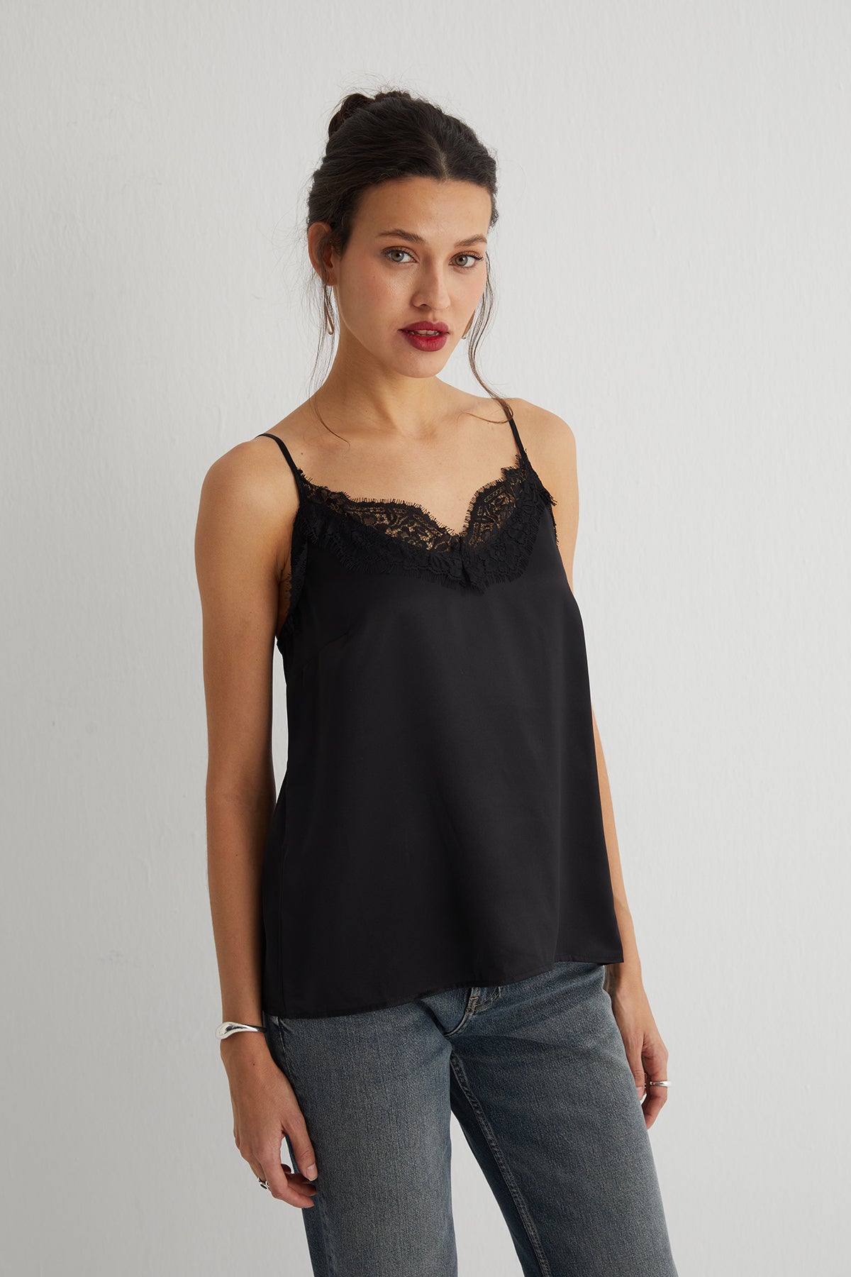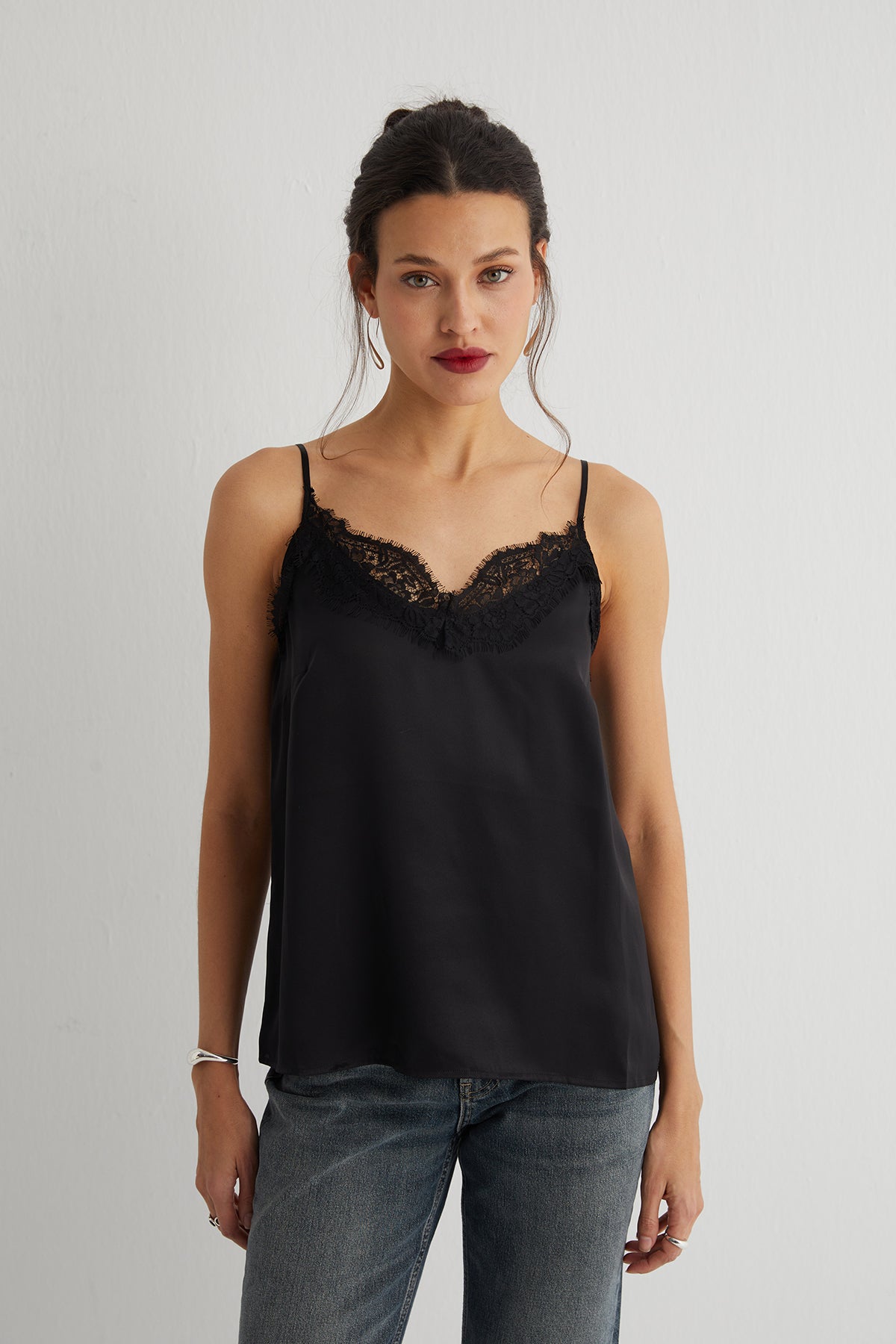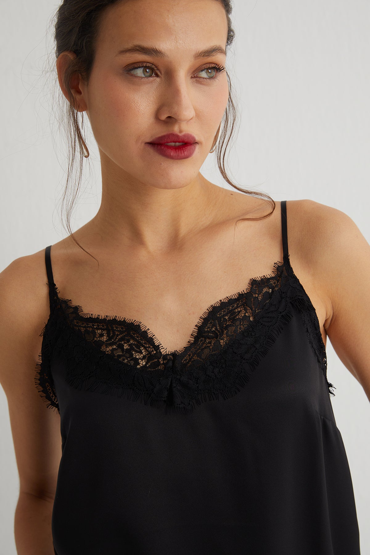 Siyah Paris Saf İpek Dantel Detaylı Askılı Bluz