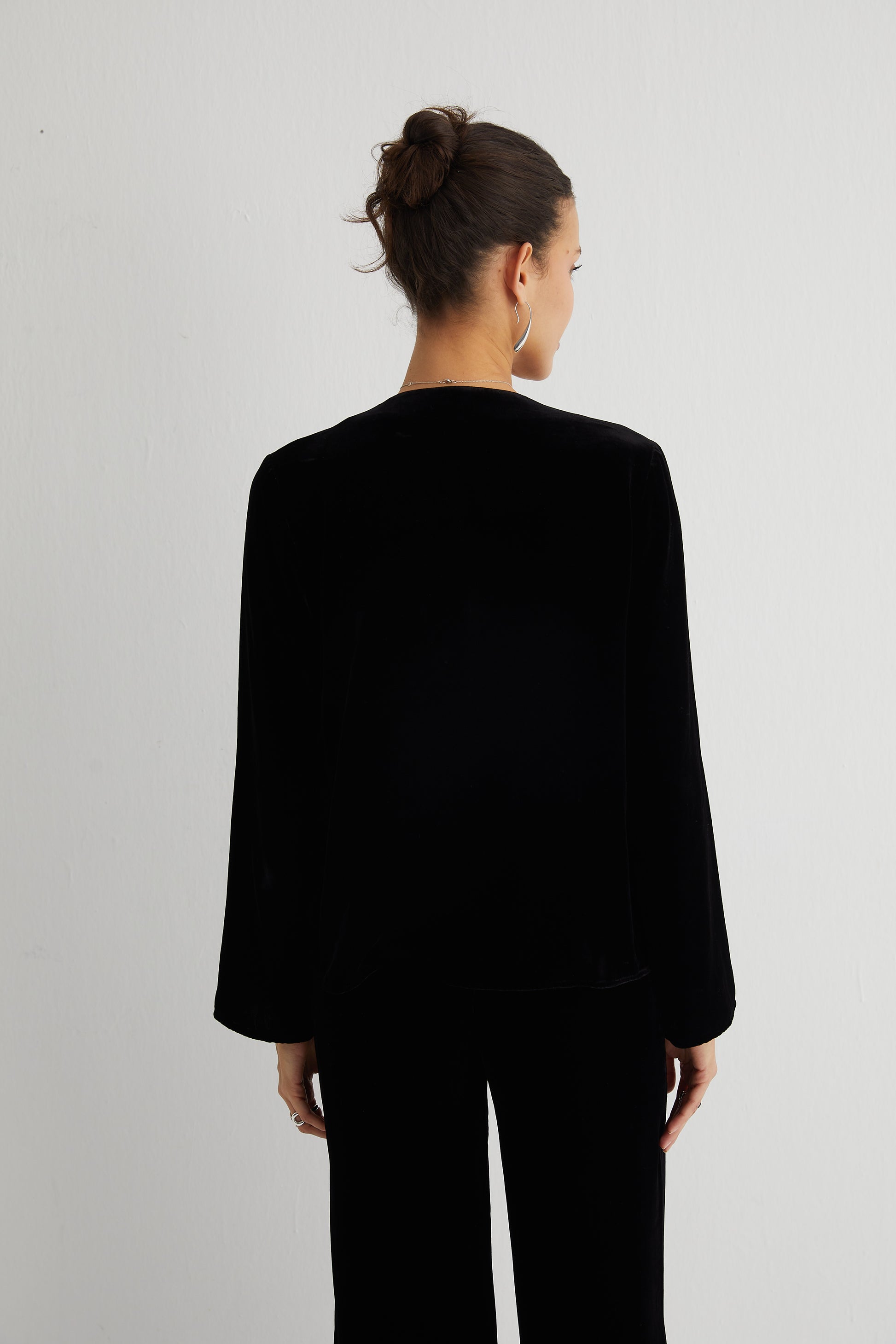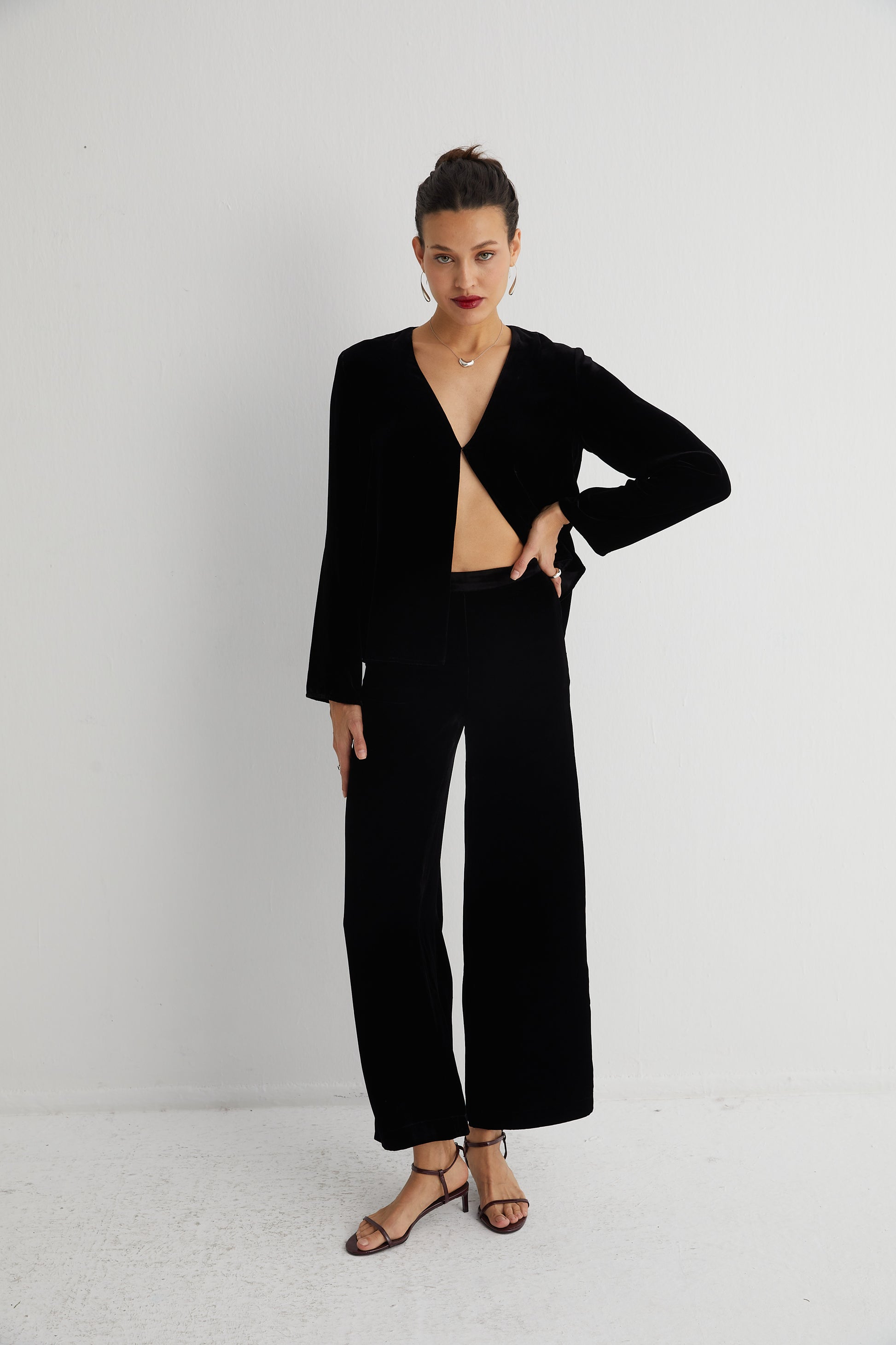 Paris'ten ilham alan bu ceket, ipeğin zarafetiyle viskozun yumuşak dokusunu bir araya getiriyor. Derin V yaka detayıyla güçlü bir siluet sunarken, özel kadife dokusu ışığı nazikçe yansıtarak görünümünüze sofistike bir boyut kazandırıyor. Tek başına ya da takımıyla birlikte, zamansız bir ifadenin parçası olmaya aday.