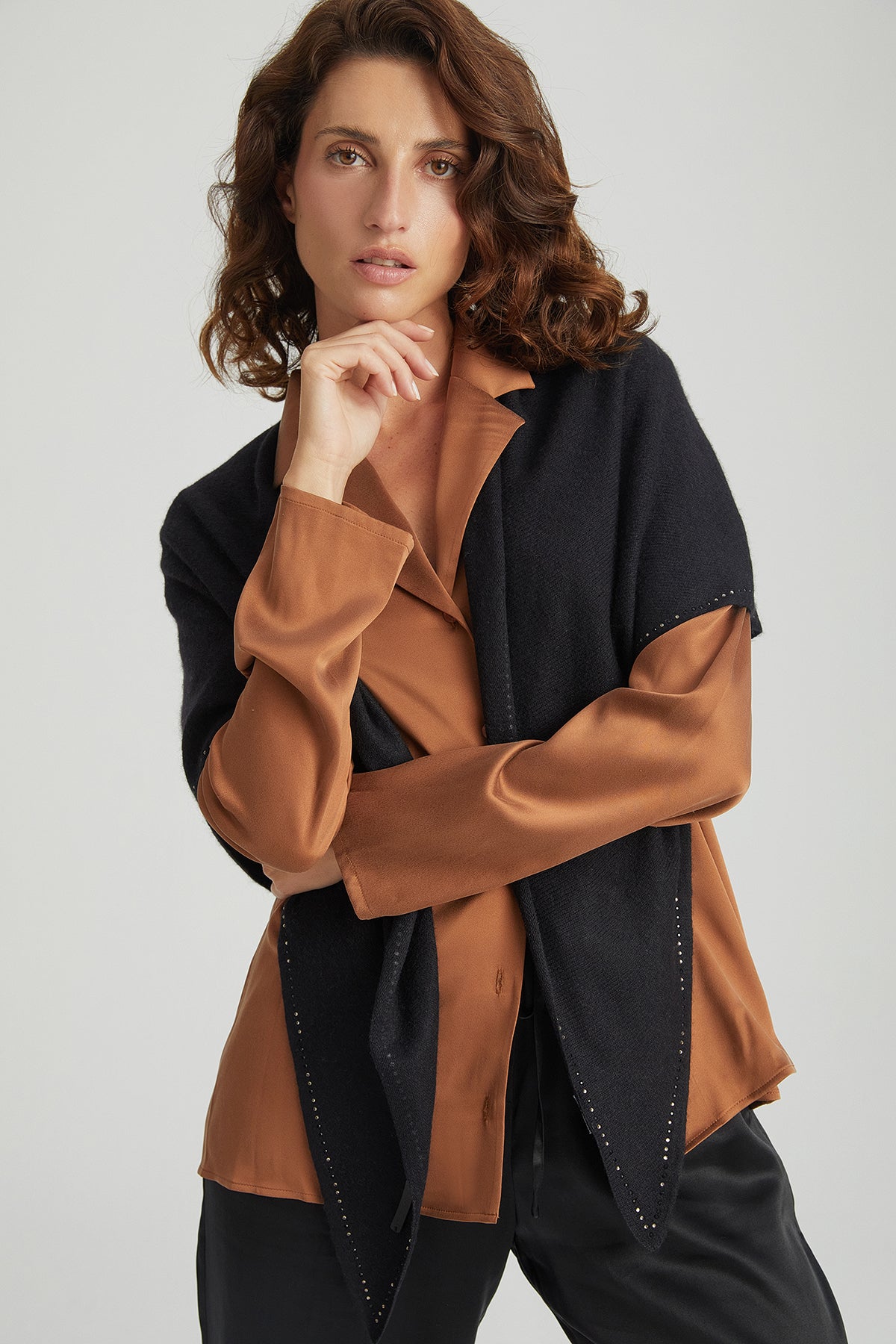 Siyah Saf Kaşmir Taşlı Üçgen Şal, göz alıcı taş detayları ve lüks kaşmir dokusuyla sofistike bir stil sunuyor. %100 saf kaşmirden üretilmiş olan bu şal, gece siyahının asaletiyle her kombini daha da şık hale getiriyor. Işıltılı taşlarla süslenen kenar detayları, şala zarif bir dokunuş katarken, geniş boyutlarıyla farklı bağlama seçenekleri sunarak stilinizi özgürce yansıtmanızı sağlıyor.