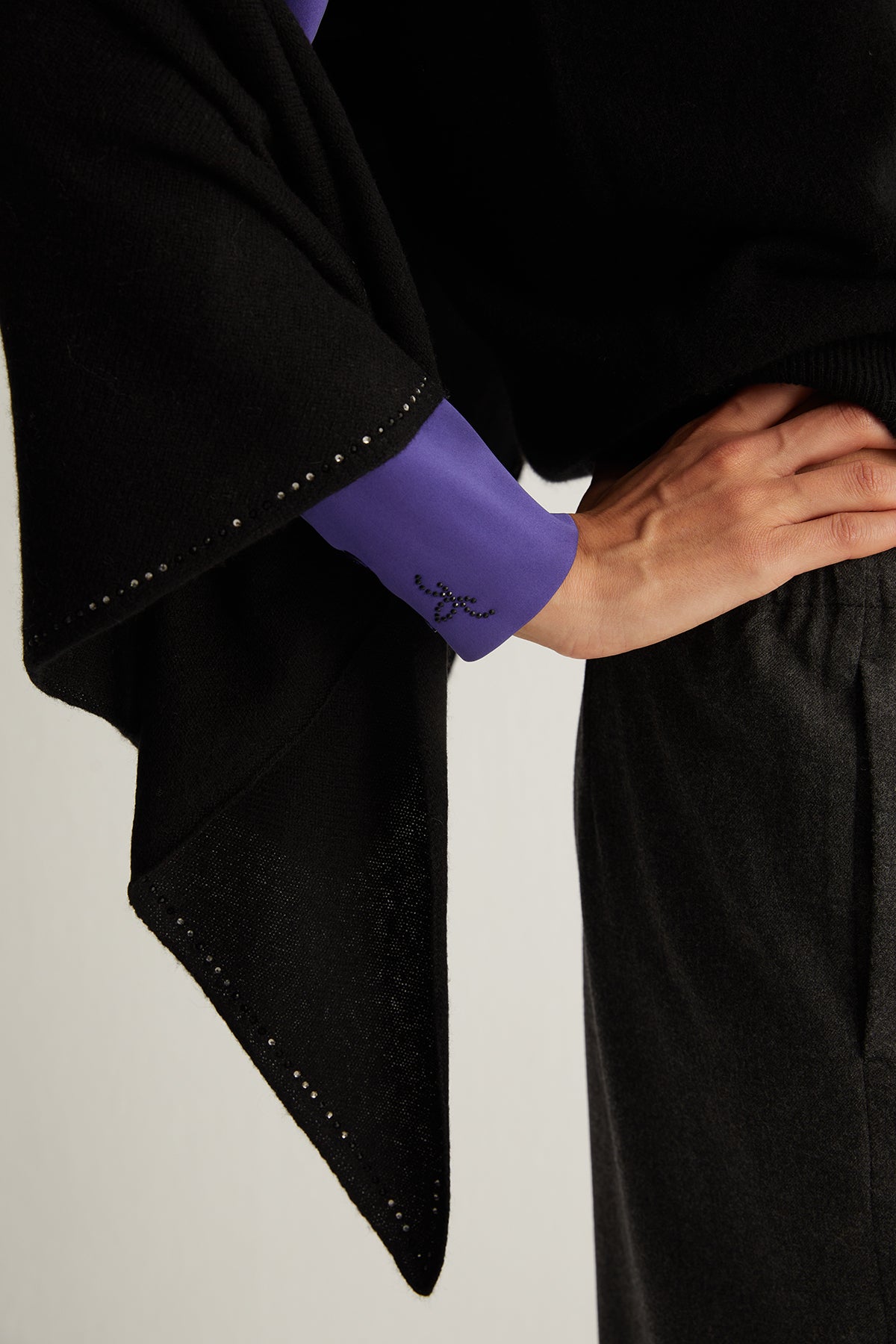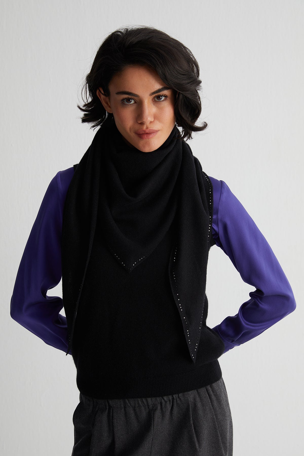 Siyah Saf Kaşmir Taşlı Üçgen Şal, göz alıcı taş detayları ve %100 saf kaşmir dokusuyla sofistike bir stil sunuyor. Işıltılı taşlarla süslenen kenar detayları, şala zarif bir dokunuş katarken, geniş boyutlarıyla farklı bağlama seçenekleri sunarak stilinizi özgürce yansıtmanızı sağlıyor.