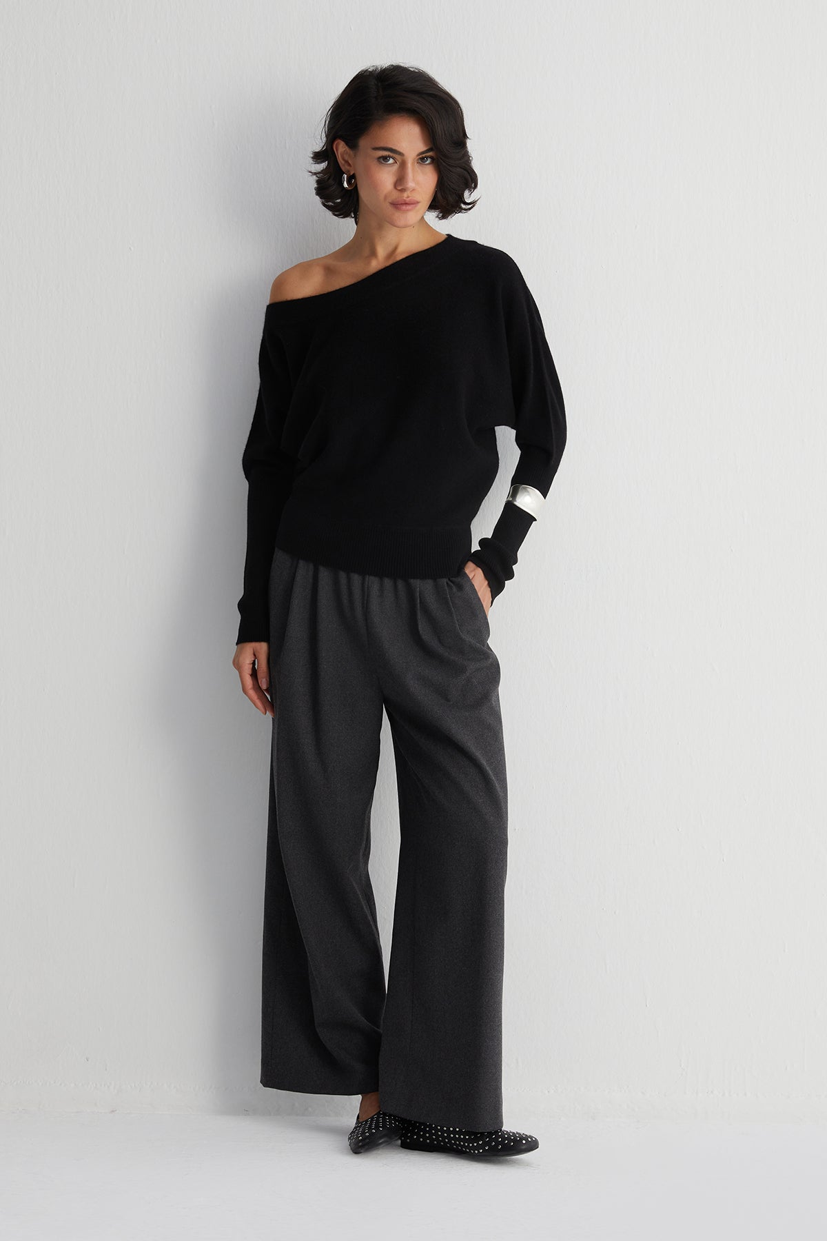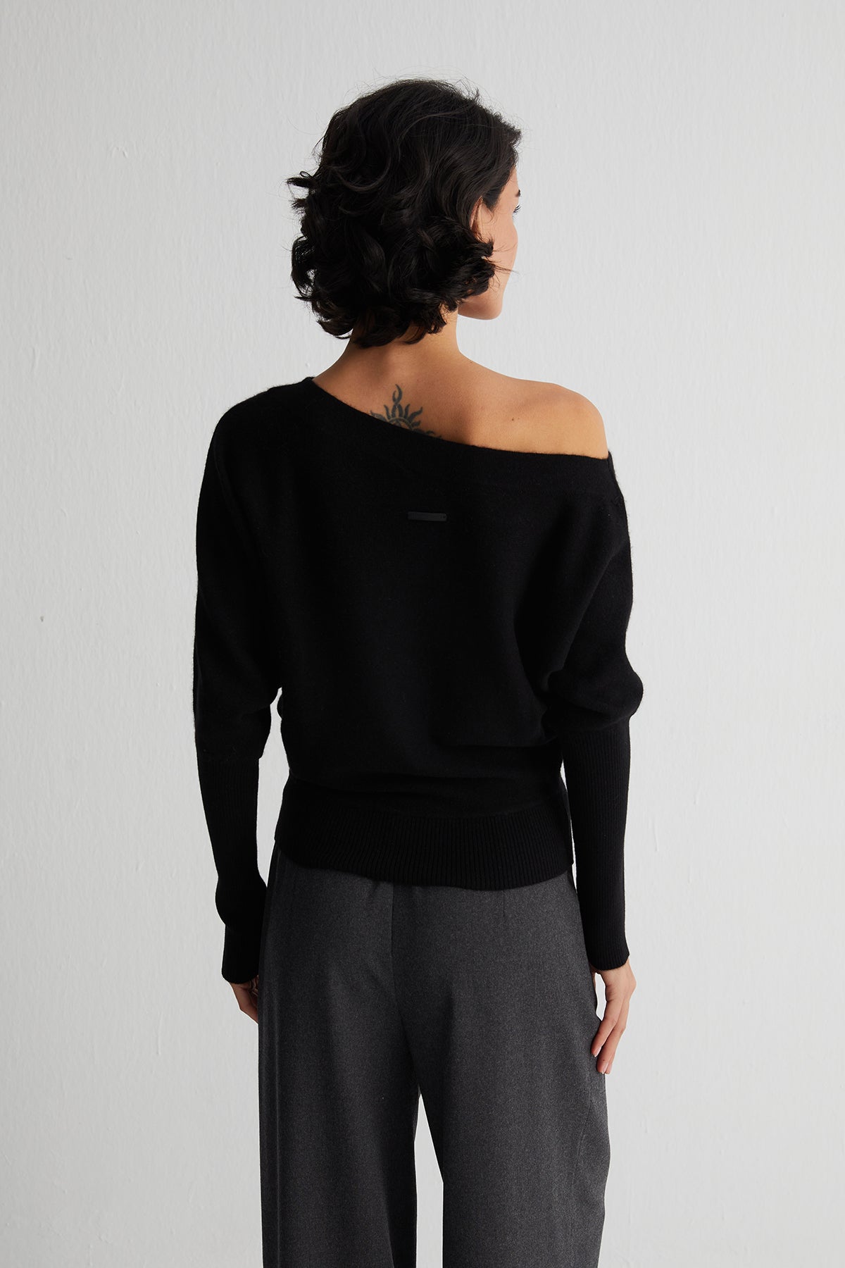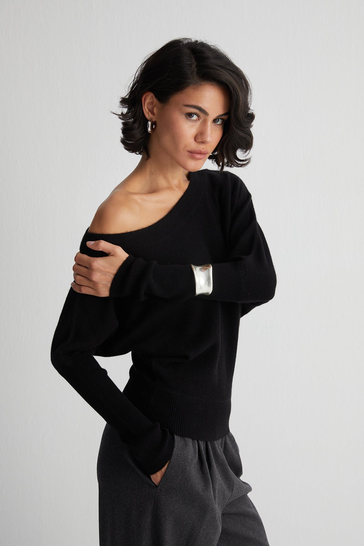 Siyah Vanessa Saf Kaşmir Tek Omuz Dekolte Kazak