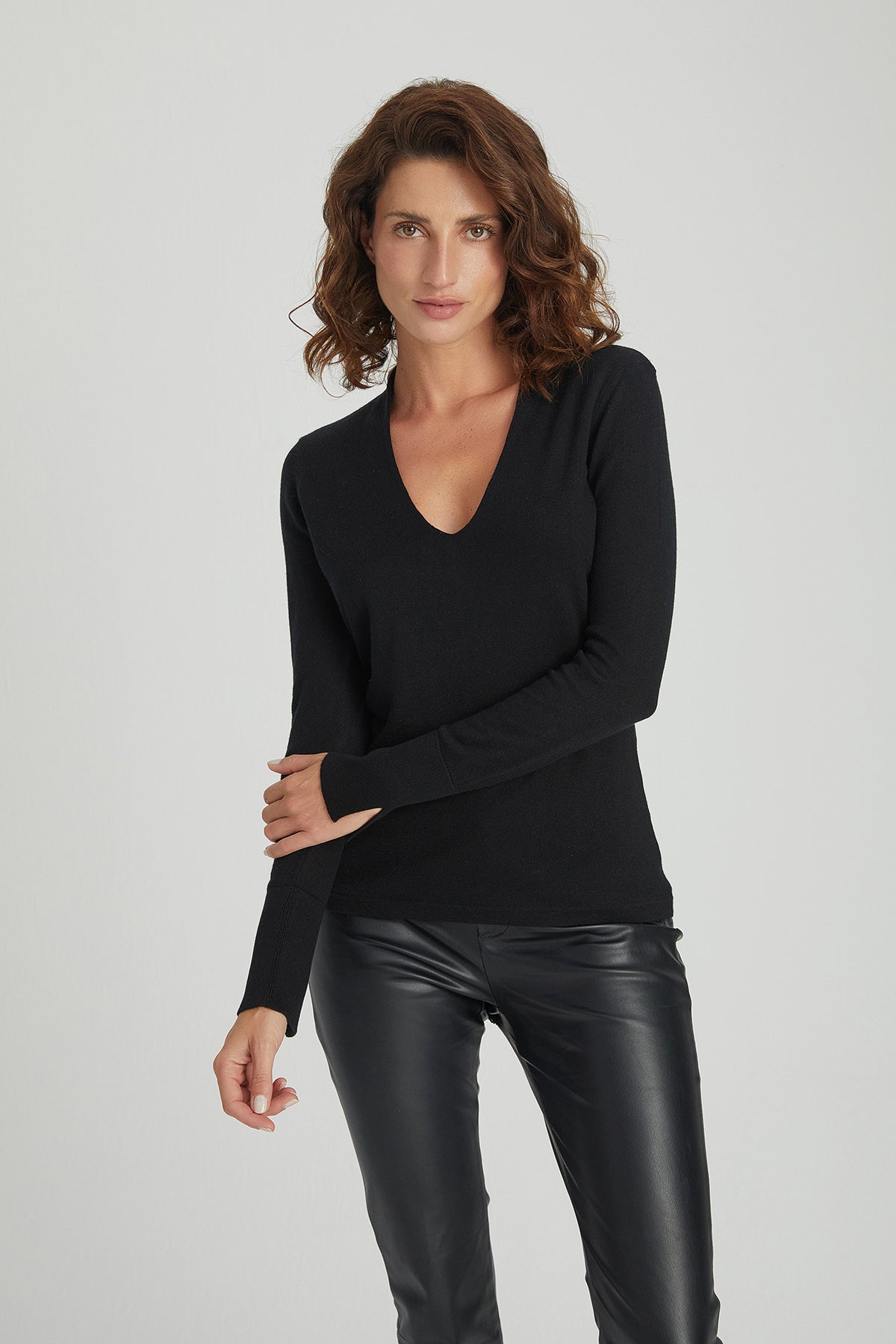 Derin V yaka tasarımı boyun hattını belirginleştirir, katmanlı kullanıma uygundur.